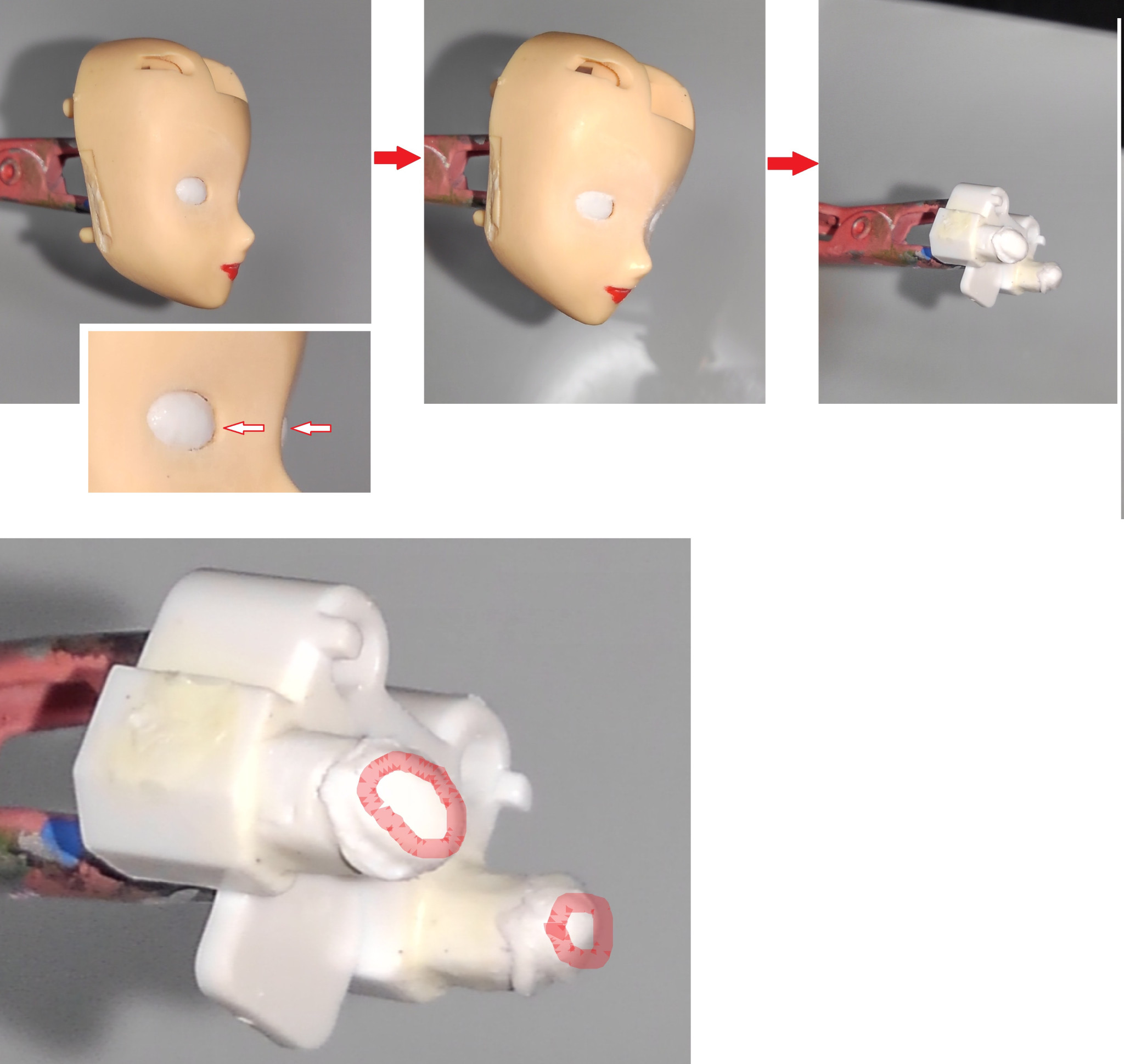 上記の作業後、目パーツを顔パーツに差し込みしっかり押し込みます。接着されると困るのですぐに引き抜きます。これでぴったり型が取れました。ただし眼球が飛び出ているぐらいでないとダメです。表面に皴がでたりしますので、ヤスって整えられるぐらいの量がとびでているのが理想です。