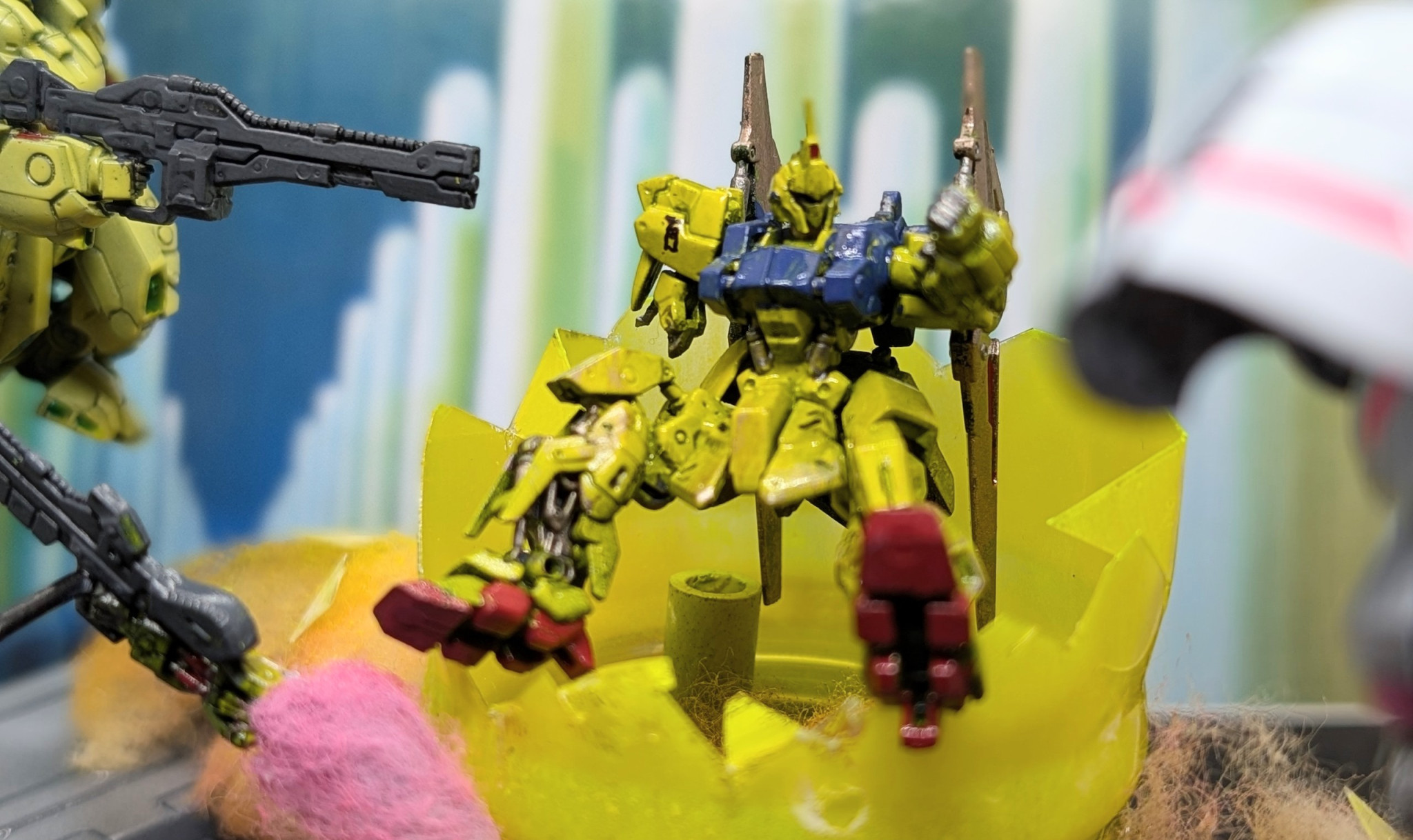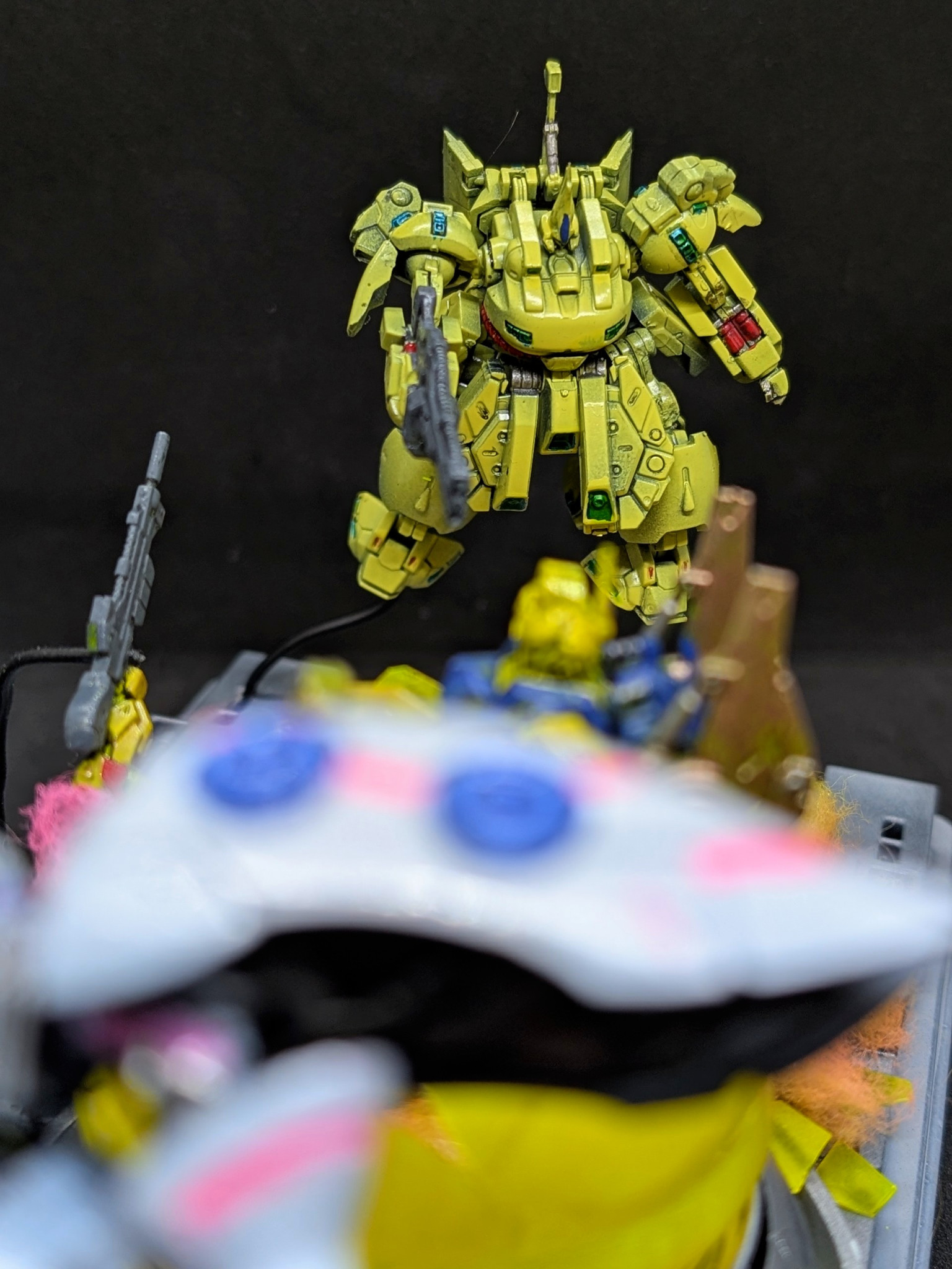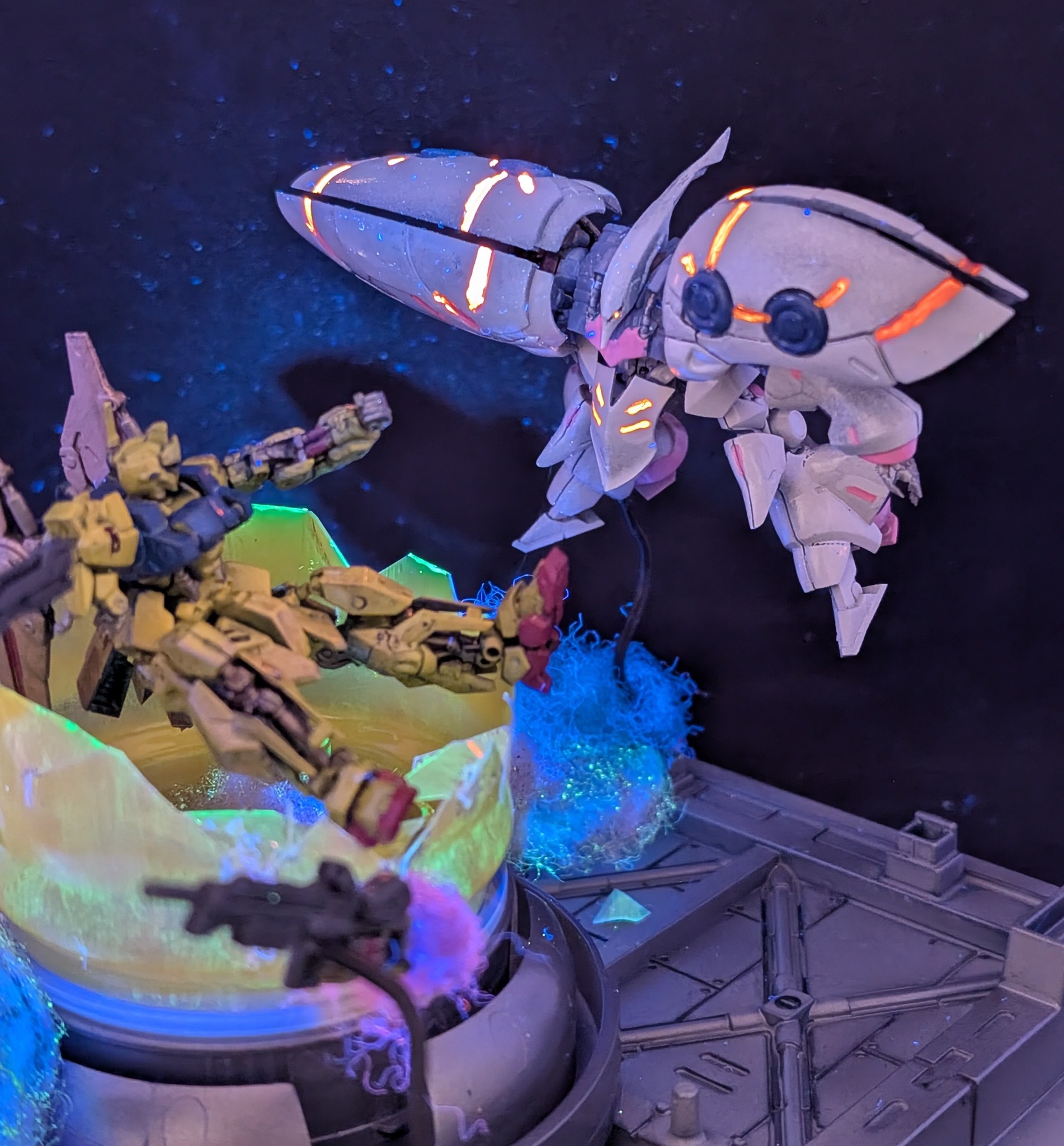 百式は金色にするとアニメっぽくないので強い黄色にしました。キュベレイは組み立てて色を塗っただけですね