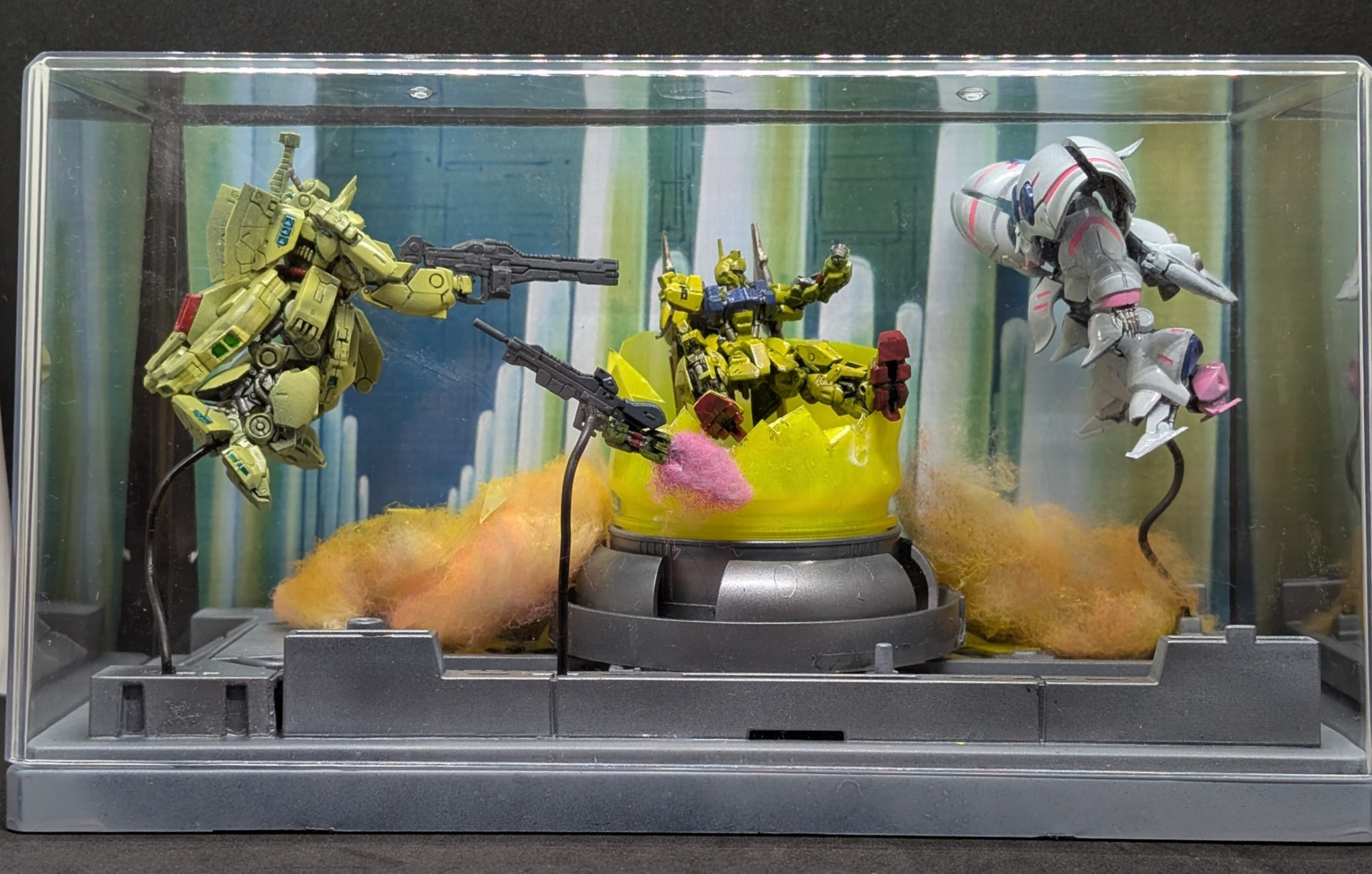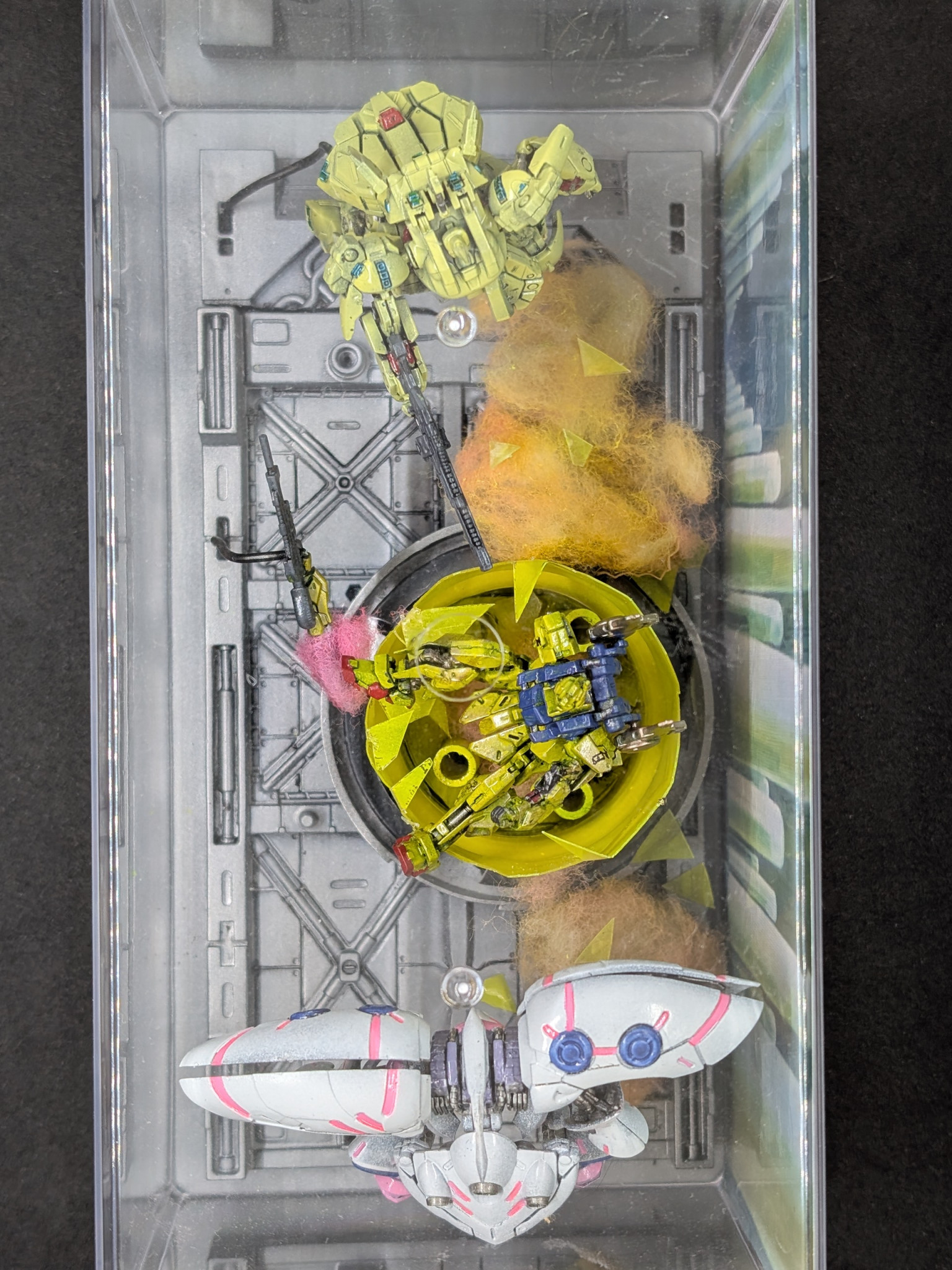 アーティファクトのサイズなら100均の300円ケースに入ります。100均の格納庫に調味料入れ、排水溝のぬめり取りを繋げて割れた黄色い菅を作りジオラマにしました、