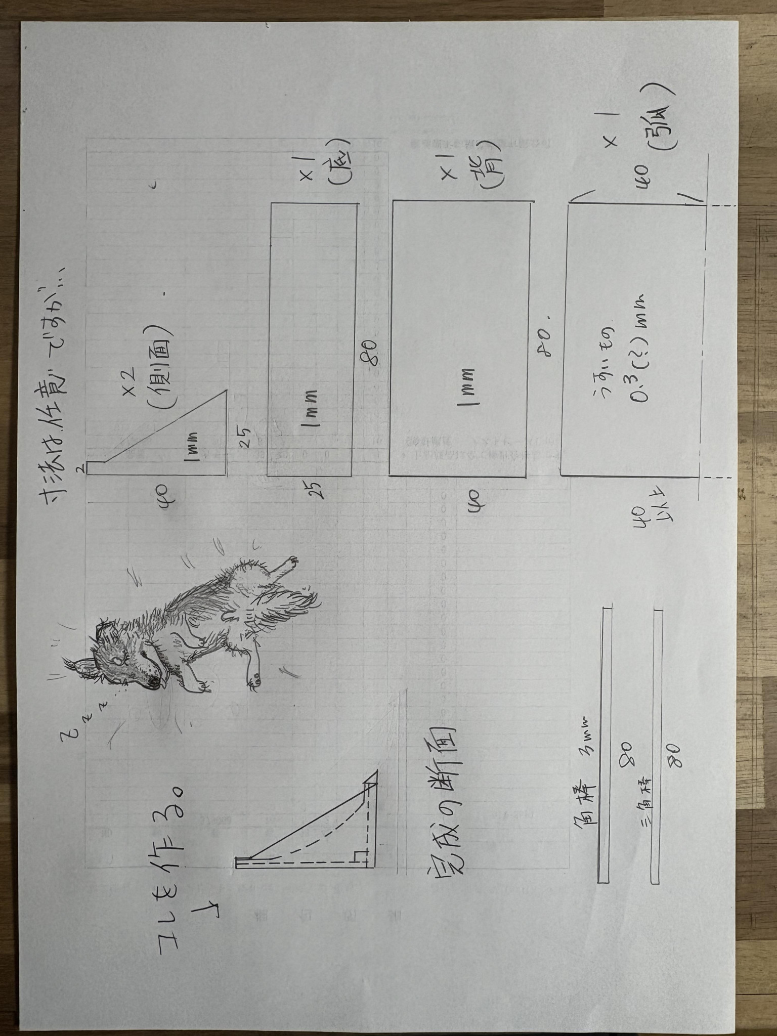 これが材料です。寸法は適当です。組み立て時にプラ板の厚み分の誤差が出てしまう気がするので、個々に検証してから制作して下さい。あくまでも参考です(zaku-kao8)