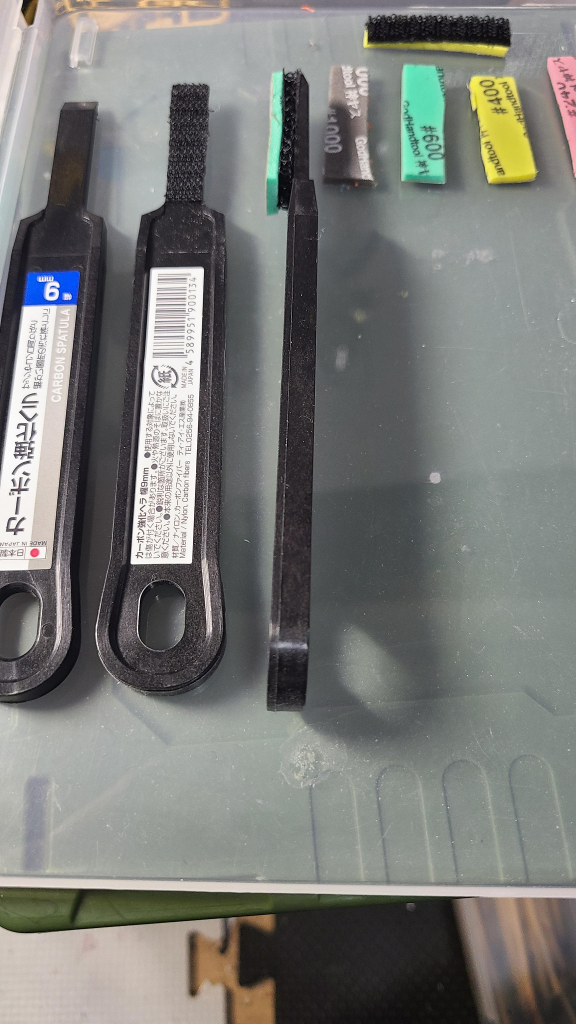 こちらは百均に売ってるカーボン強化ヘラにマジックテープを貼りゴッドハンドの神ヤスリに取り付けたものです!ゴッドハンドのFFボードも所持しているのですが小さな面をやるだけならこの方がやりやすいです!