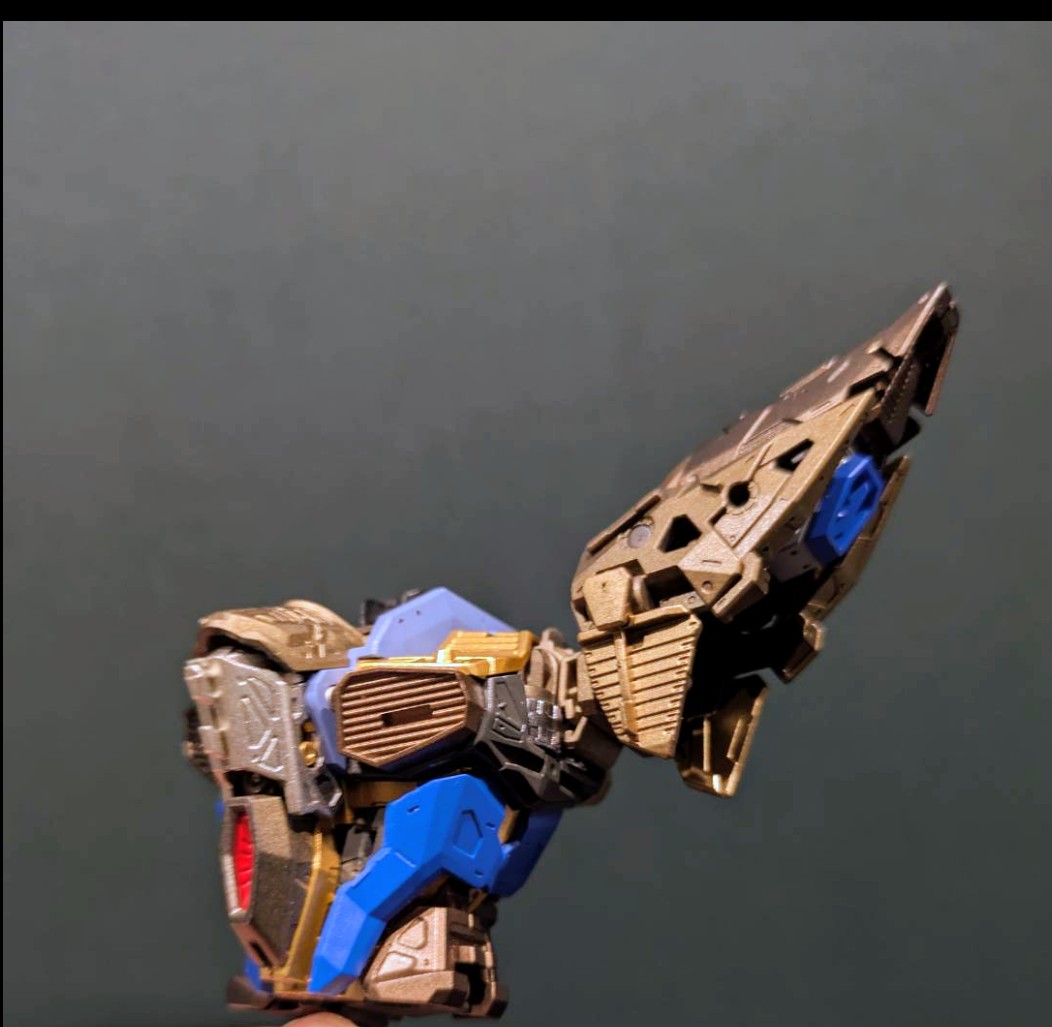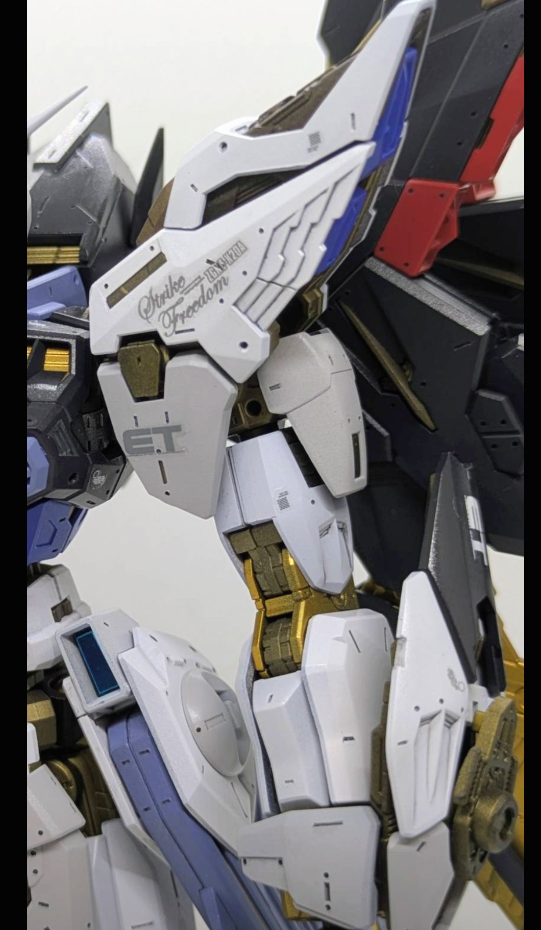 頭部は真鍮を埋め込み1ミリ後退させ、劇中のストフリをイメージしてトサカを追加、額は0.5ミリ厚くしセンサーも陽射しを伸ばして厳つさを追加しました。内部フレームも5色のゴールドで塗装し、見えるフレーム部分にもディテールを追加。特に肩部裏や肩部前後にも既存のディテールを消し新たにディテールを追加。