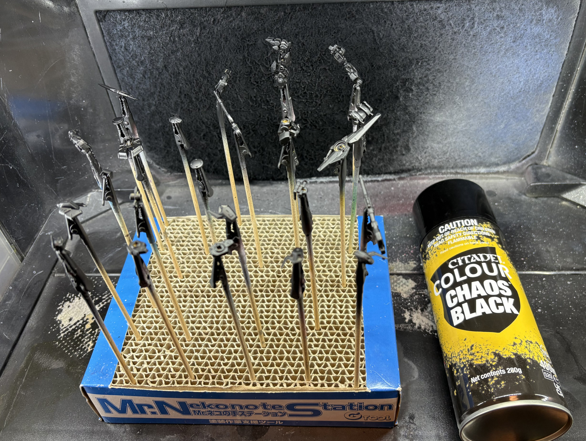 今回はキャンディ塗装なのでシタデルスプレーの黒で下地塗装。