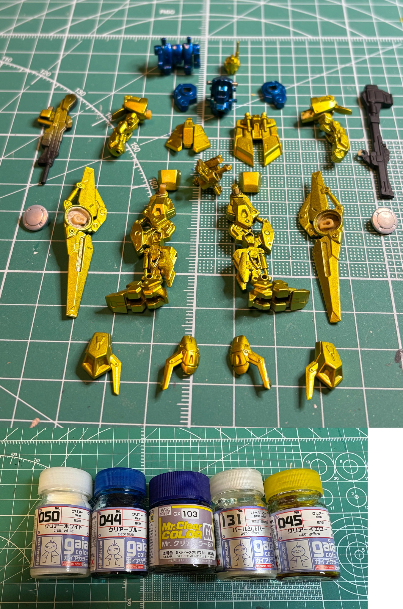 エアブラシで胴体とバックパックはクリアブルーに塗装後、ディープクリアブルーを塗装、円盤部はクリアホワイトにパールシルバーを混ぜて塗装。他はクリアイエローで塗装
