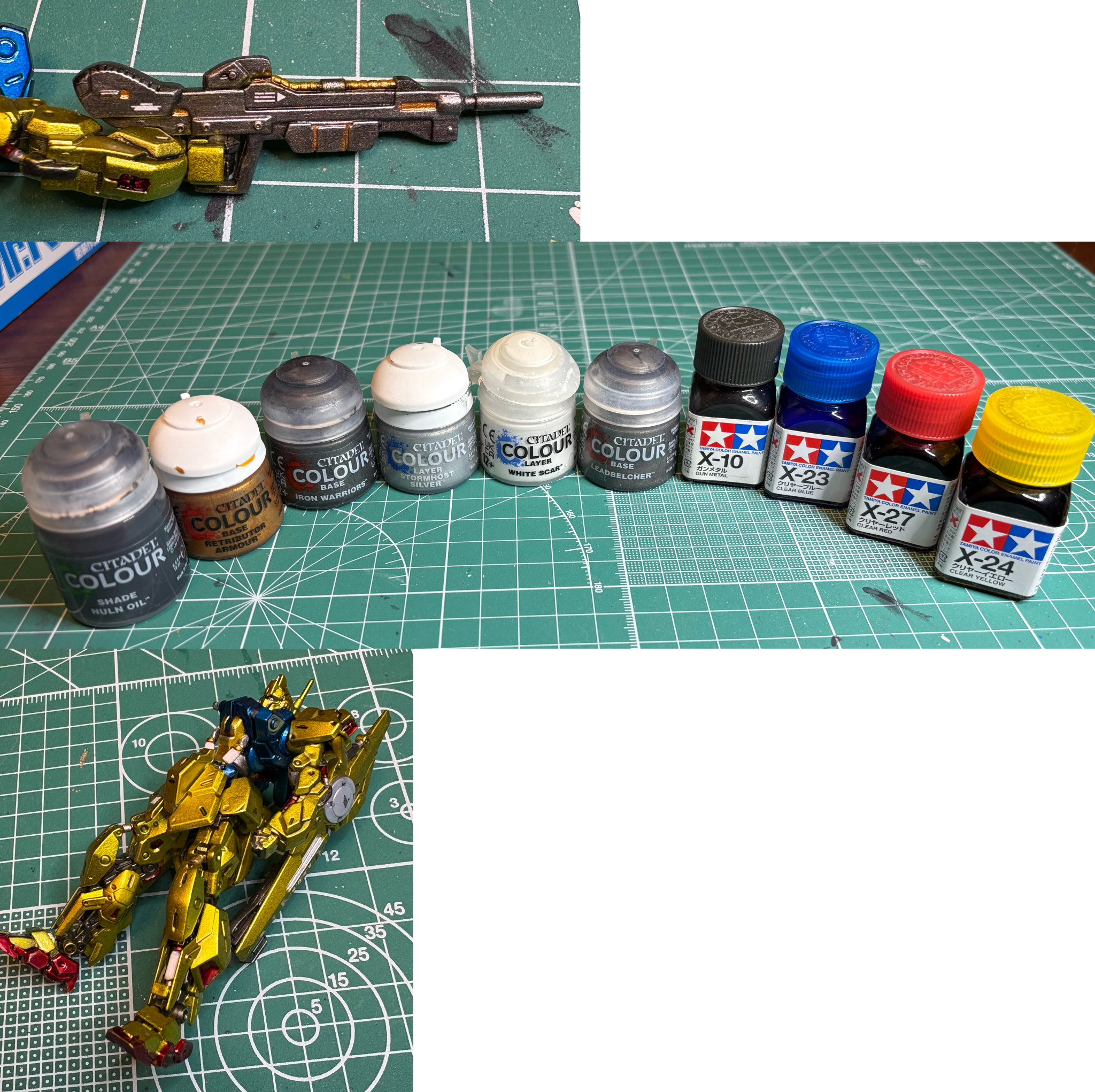 ビームライフ、バズーカはシタデルカラーのIRON WARRORS、RETRISUTOR ARMOUR、シリンダー部はシタデルカラーSTORMHOST SILVER,WHITE SCARの筆塗り。足、その他の赤部分はタミヤエナメル、クリアレッドで筆塗り。胴体部の黄色部分はクリアイエローで筆塗り。フレーム部はガンメタの筆塗り。墨入れはシタデルカラーのNULN OIL。