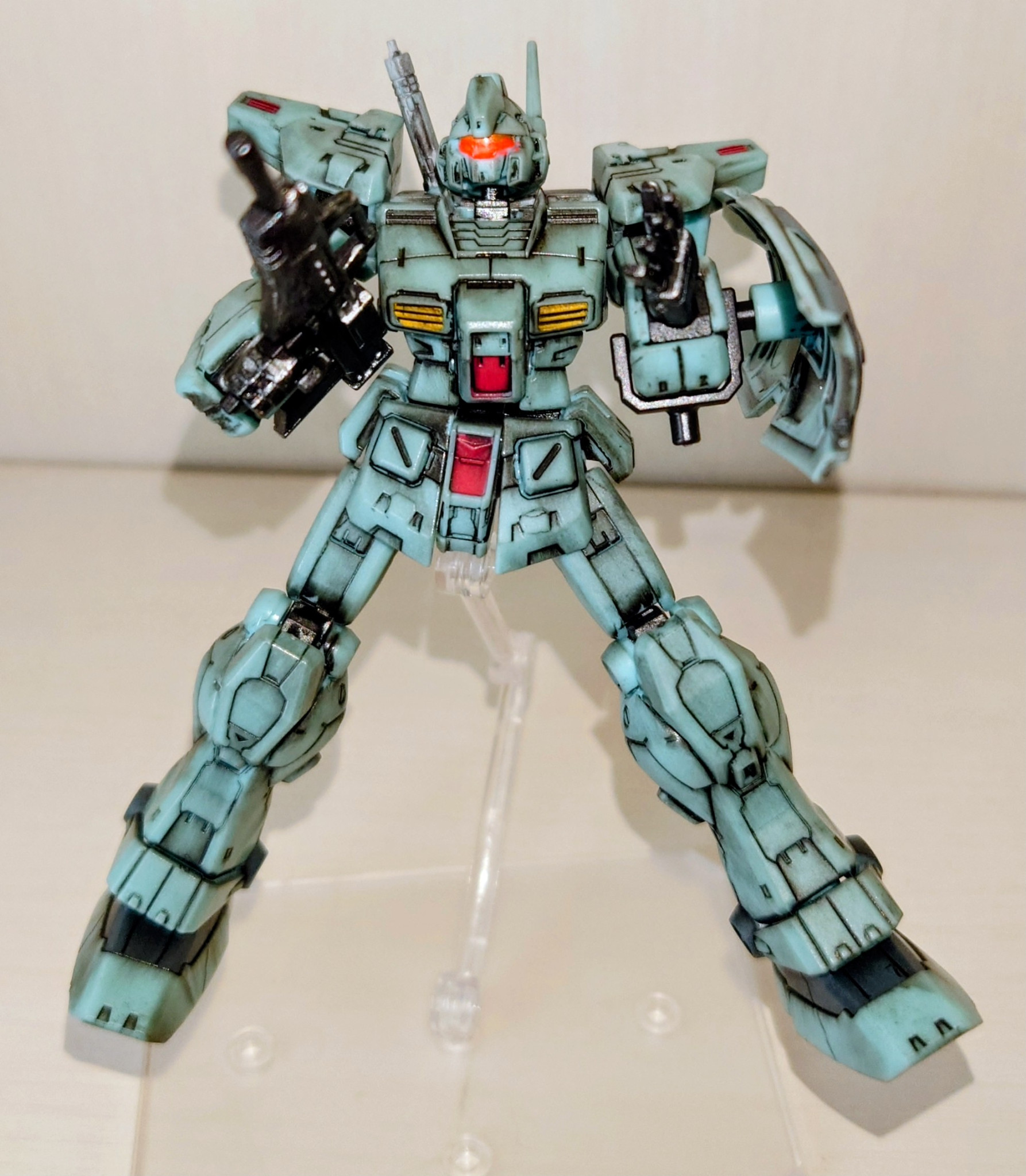ジムカスタムのライフルはブルパップなので、腕を伸ばすと、銃口と視線をあわせるのが難しいのでこのままです