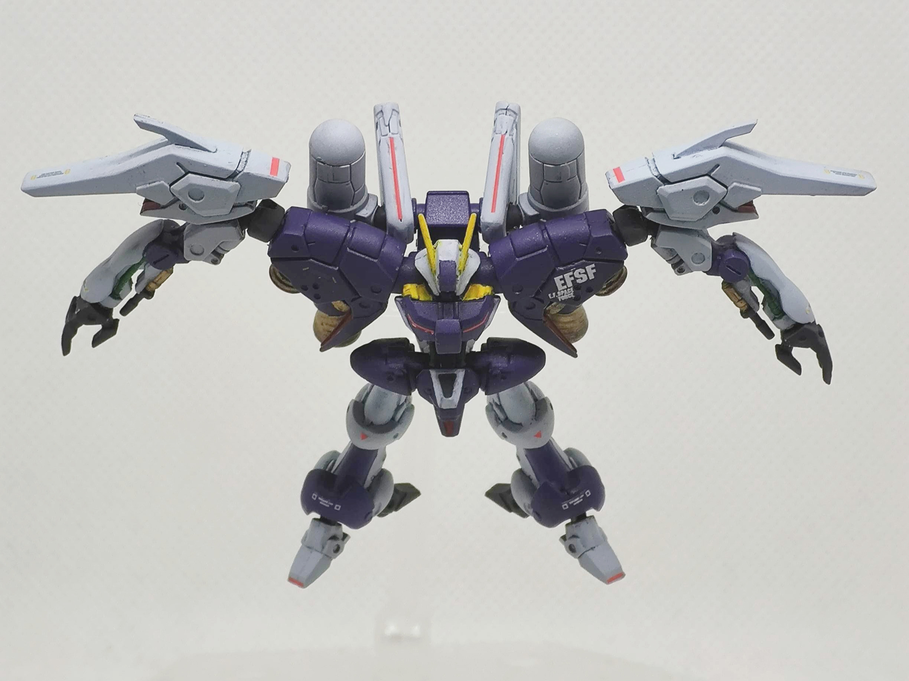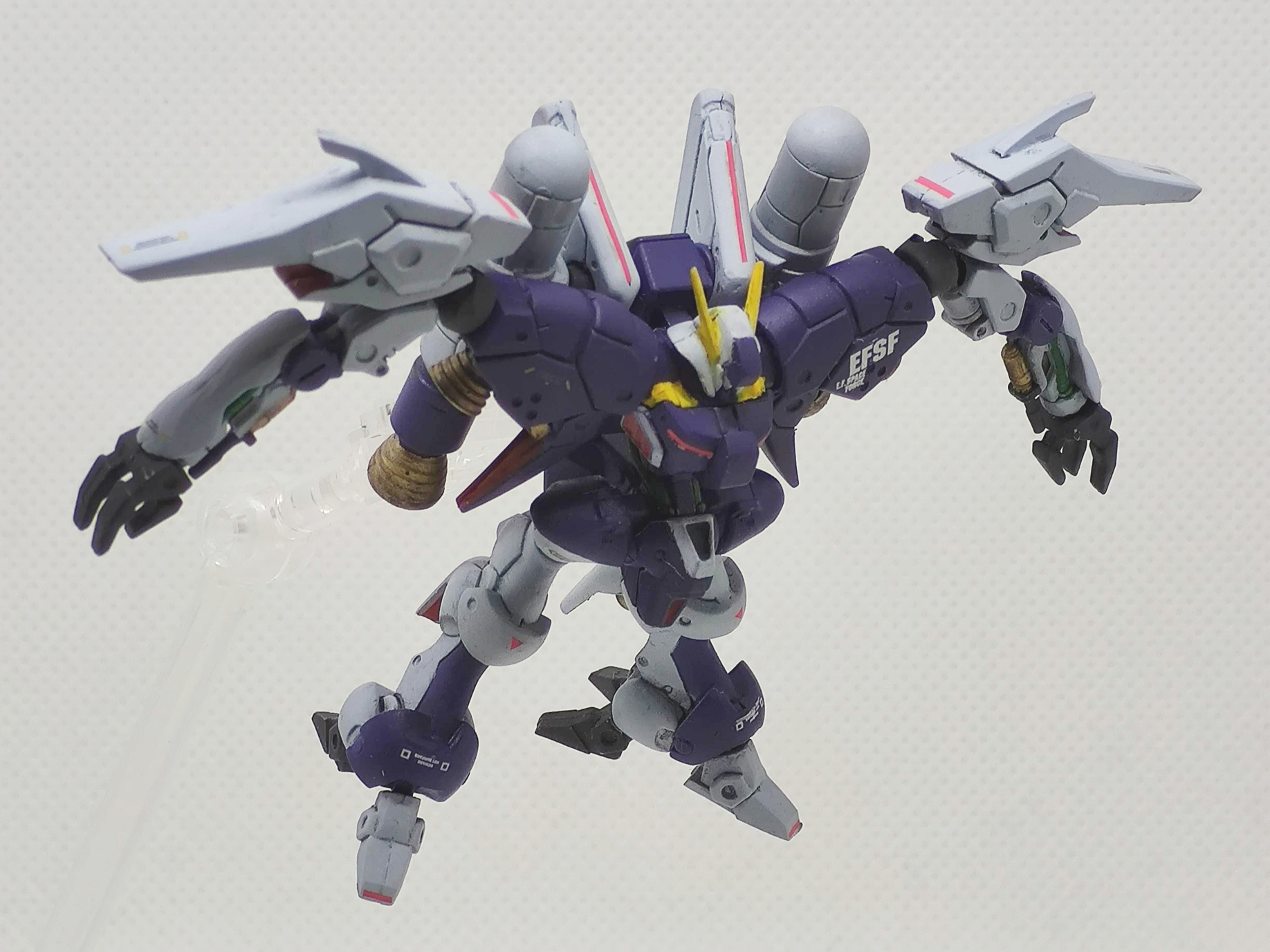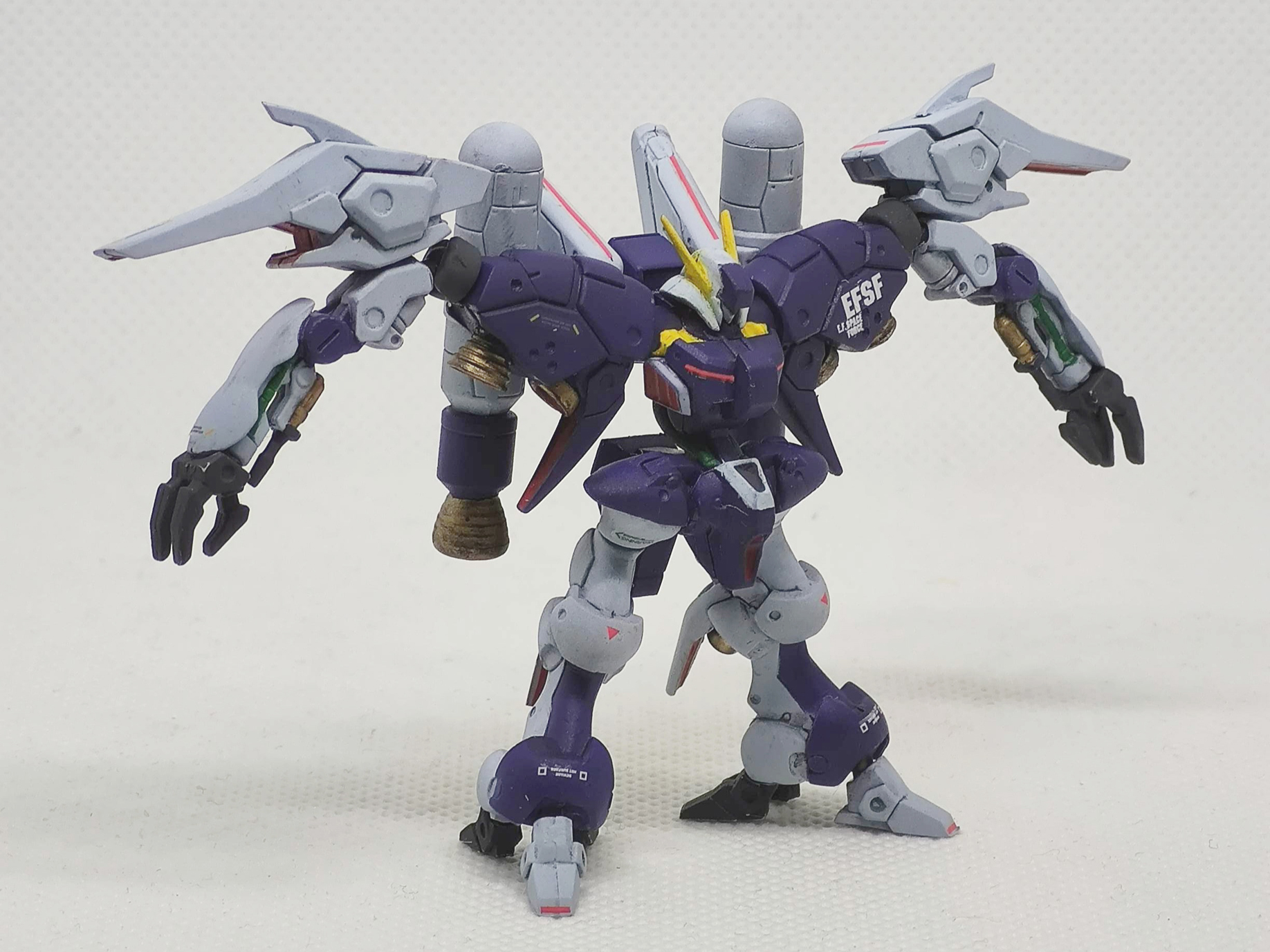 ガンダムアーティファクトのバイアラン・カスタムです。バイアラン・カスタムと言えば大気圏内での滞空性能に特化したMSです。設定では両脇下部に大型のスラスターが2基づつある異形のフォルムが特徴なMSなのですが、アーティファクトの元キットはそれが1基づつになっていたので、腕部を外側に移動させてスラスターを増設する改造をしています。