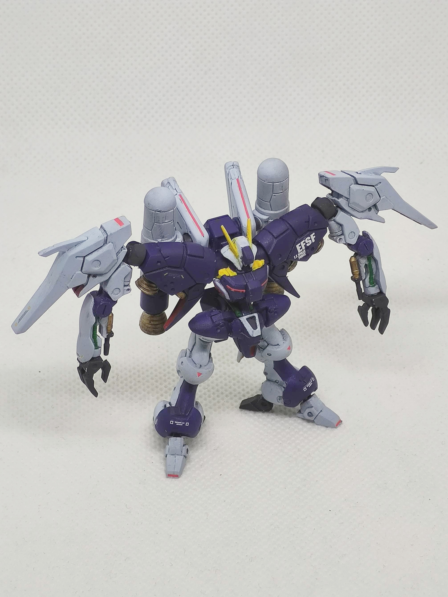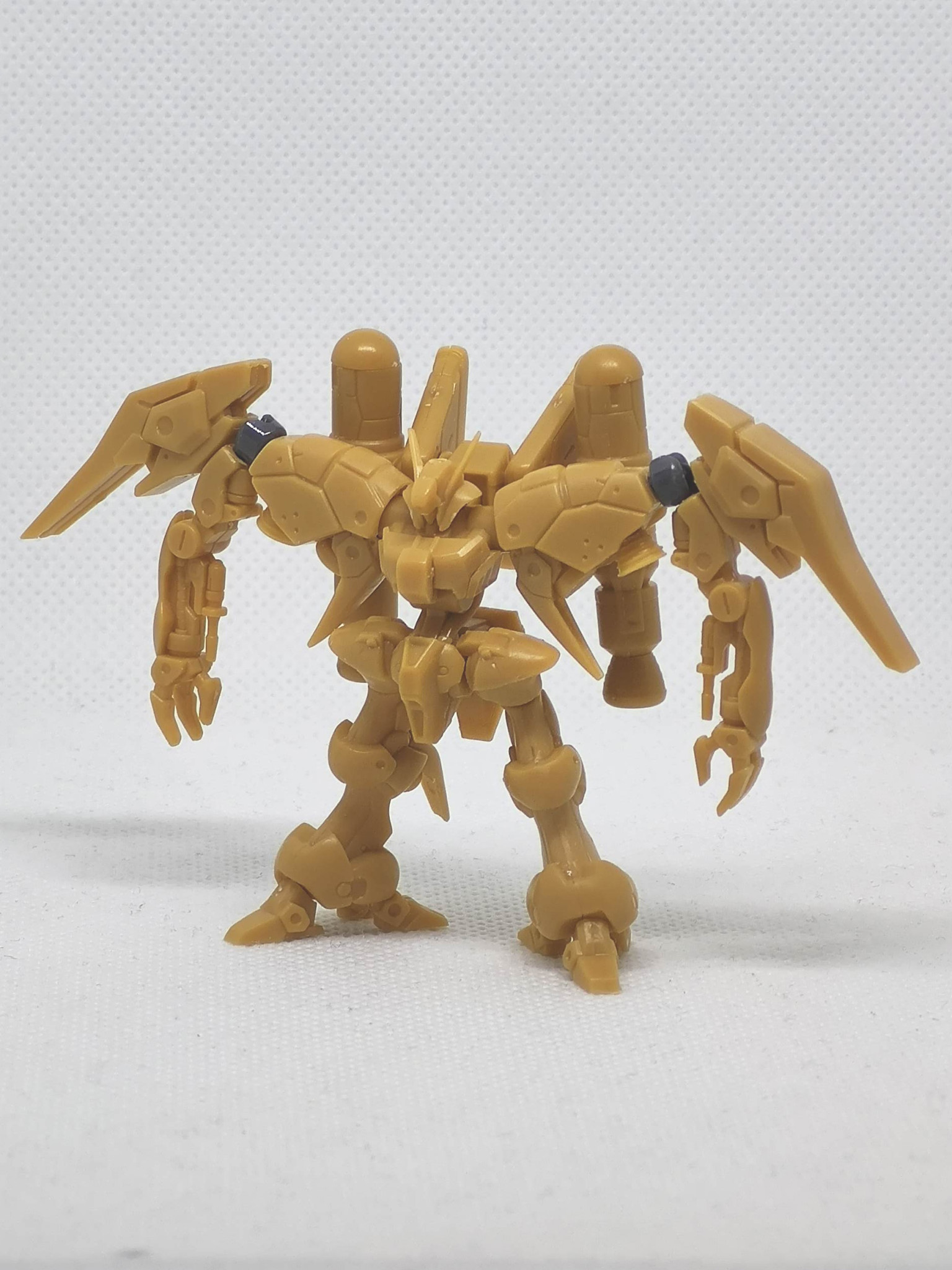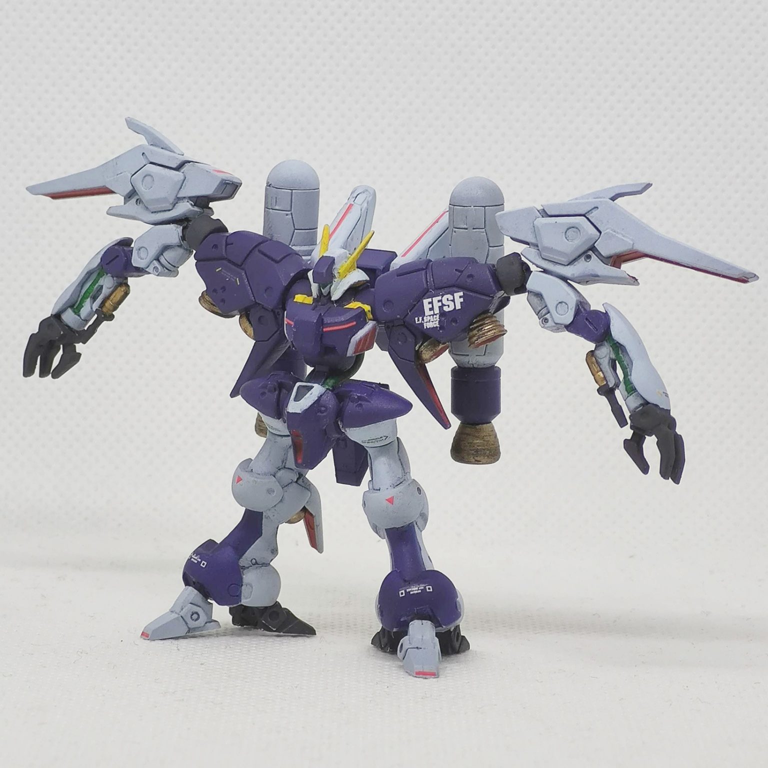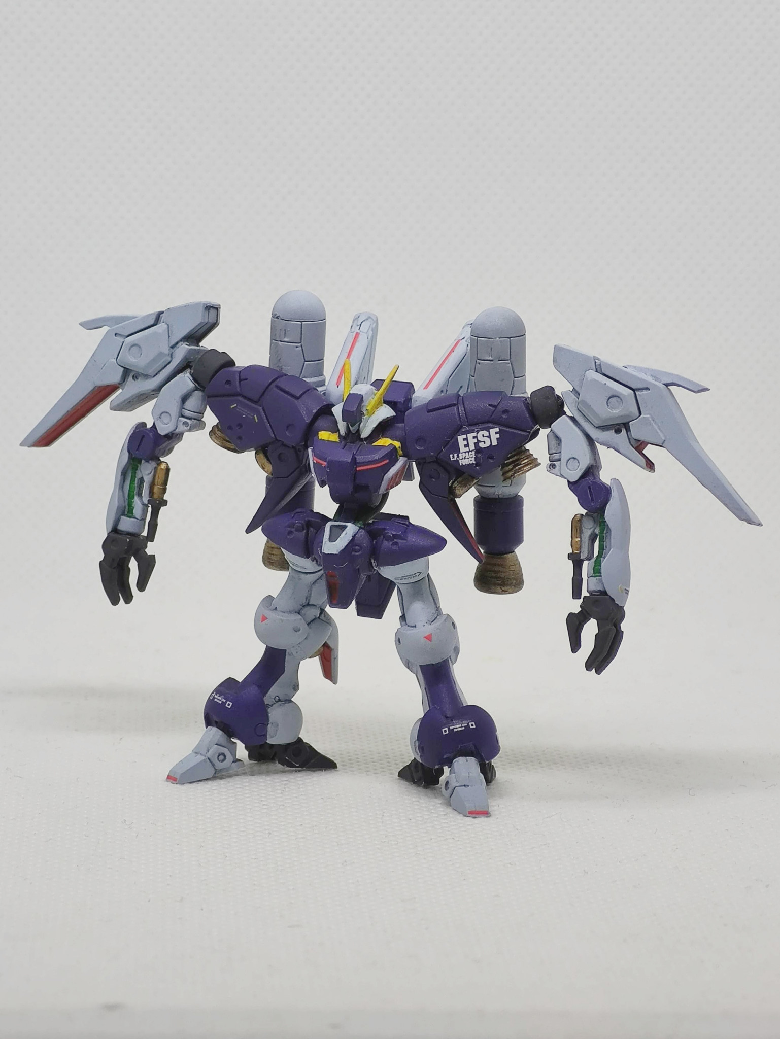 ガンダムアーティファクトのバイアラン・カスタムです。バイアラン・カスタムと言えば大気圏内での滞空性能に特化したMSです。設定では両脇下部に大型のスラスターが2基づつある異形のフォルムが特徴なMSなのですが、アーティファクトの元キットはそれが1基づつになっていたので、腕部を外側に移動させてスラスターを増設する改造をしています。