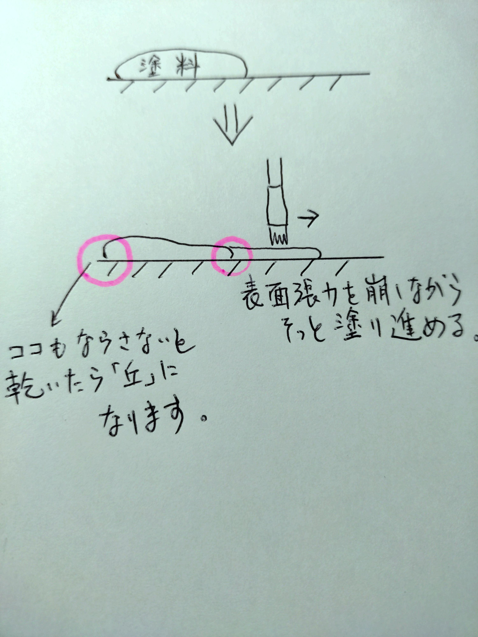 あ、絵ではイメージしやすい様に大げさな表面張力を書いてますが、実際はチョビッとずつやらないと、乾燥後に塗料の丘が出来ます😅