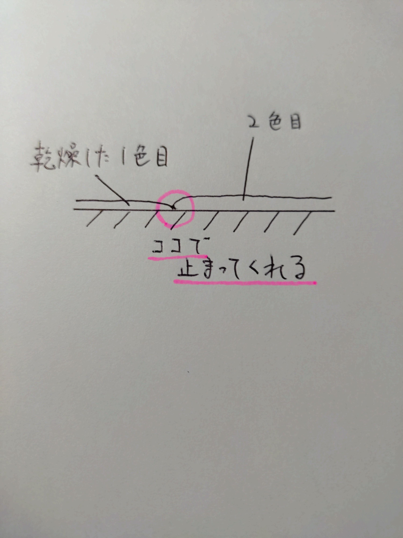でも薄めの塗料(2色目)で1色目の境界線に近付くと、乾燥した1色目の塗膜が防波堤となり、塗料はそこでストップしてくれます😆