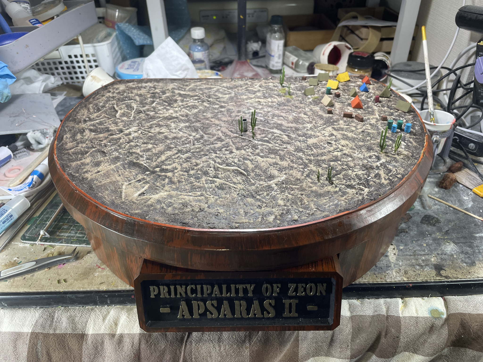 砂をボンド水で固め、マッドバーニッシュで厚めにコーティングしてからドライブラシを何層か重ねています。