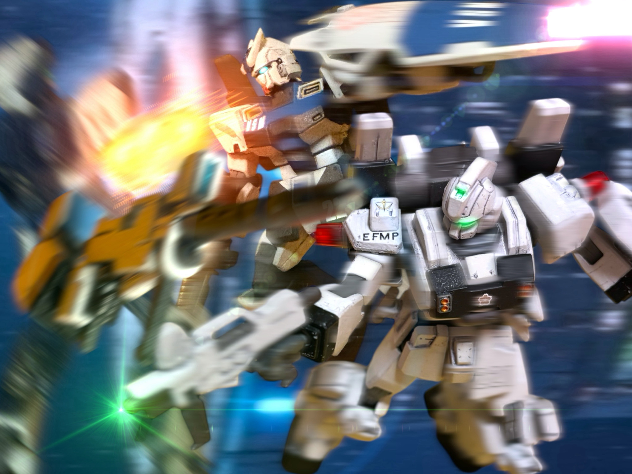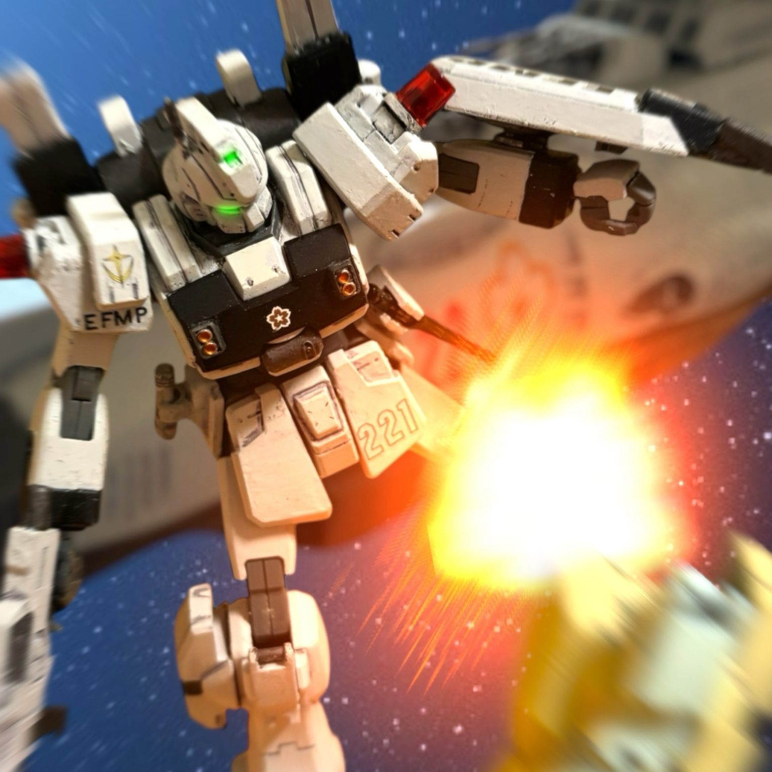 ヘントも、ミヤギ機の背後に迫ったジムにライフルを放つ。ヘントの腕では、殺さずに無力化はできない。威嚇程度だが、敵機が離れたところをミヤギが切り裂き、無力化する。