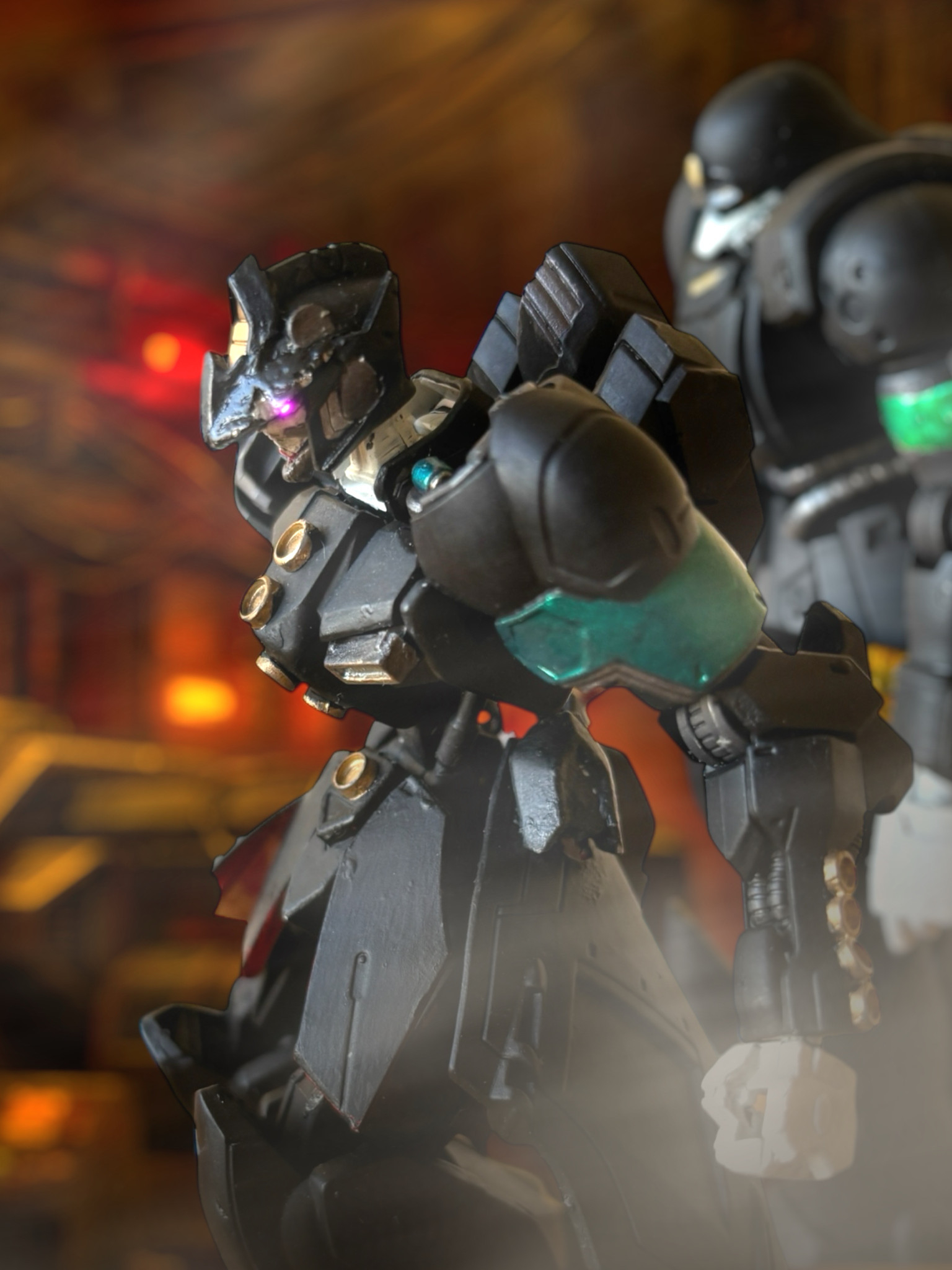 暗く、冷たいデブリ帯の中、ピンクの閃光が闇を切り裂くと、中から黒いMSが2機、姿を表した。
