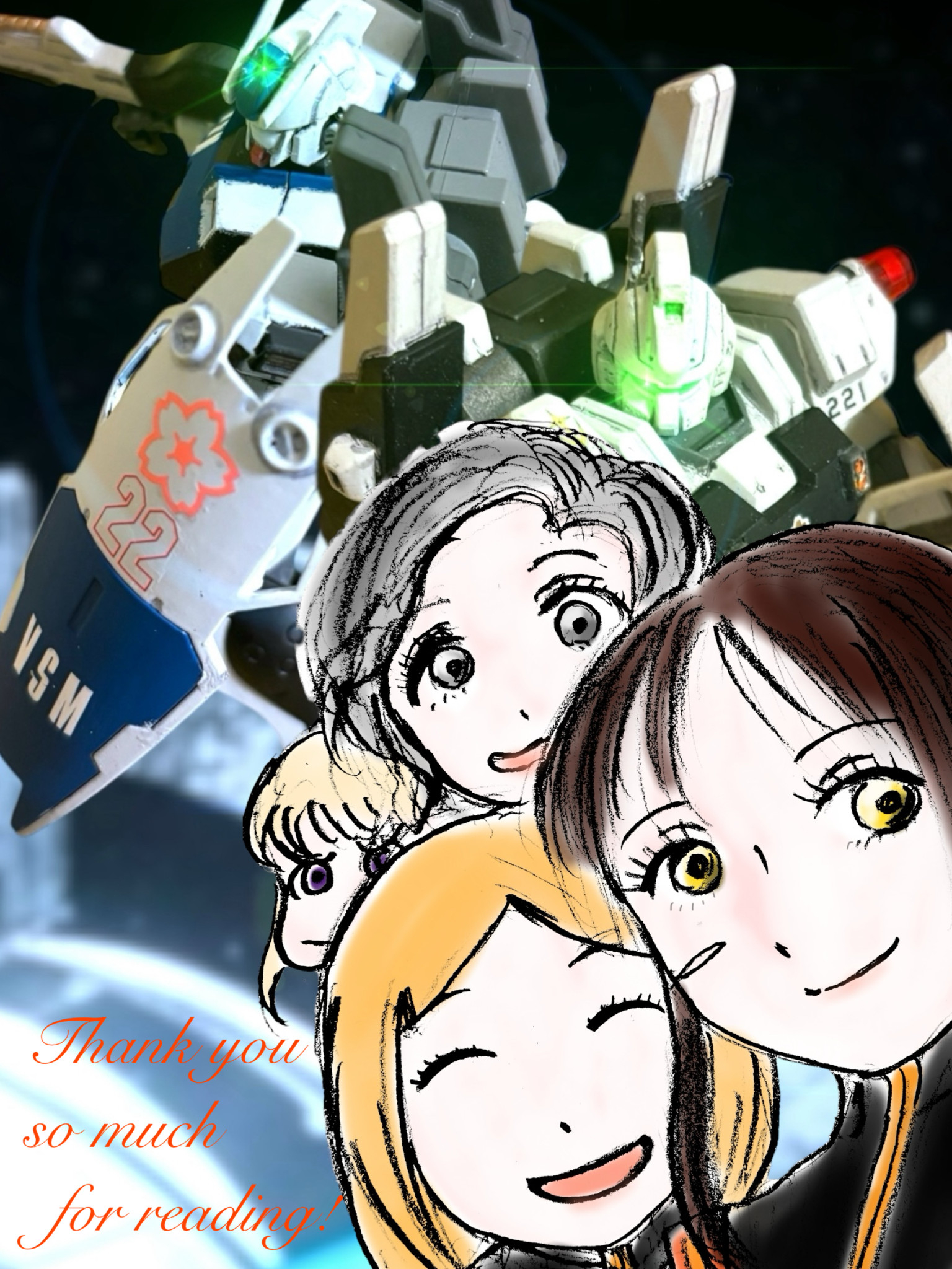 ヘントとミヤギの、戦場での再プロポーズの場面とセリフは最初から決めていて、第4部はどうやってここに行きつくかがスタートでした。8年もだらだらと超遠距離恋愛をするという、リアリティが微塵もない設定からして無理があるうえ……グリプス戦役時代の情報は1年戦争に比べると集めづらかったのもあって、本当に、むちゃくちゃな話だったと思います(gundam-kao10)ツッコまずにそっとしておいてくださった皆様にも感謝です笑
