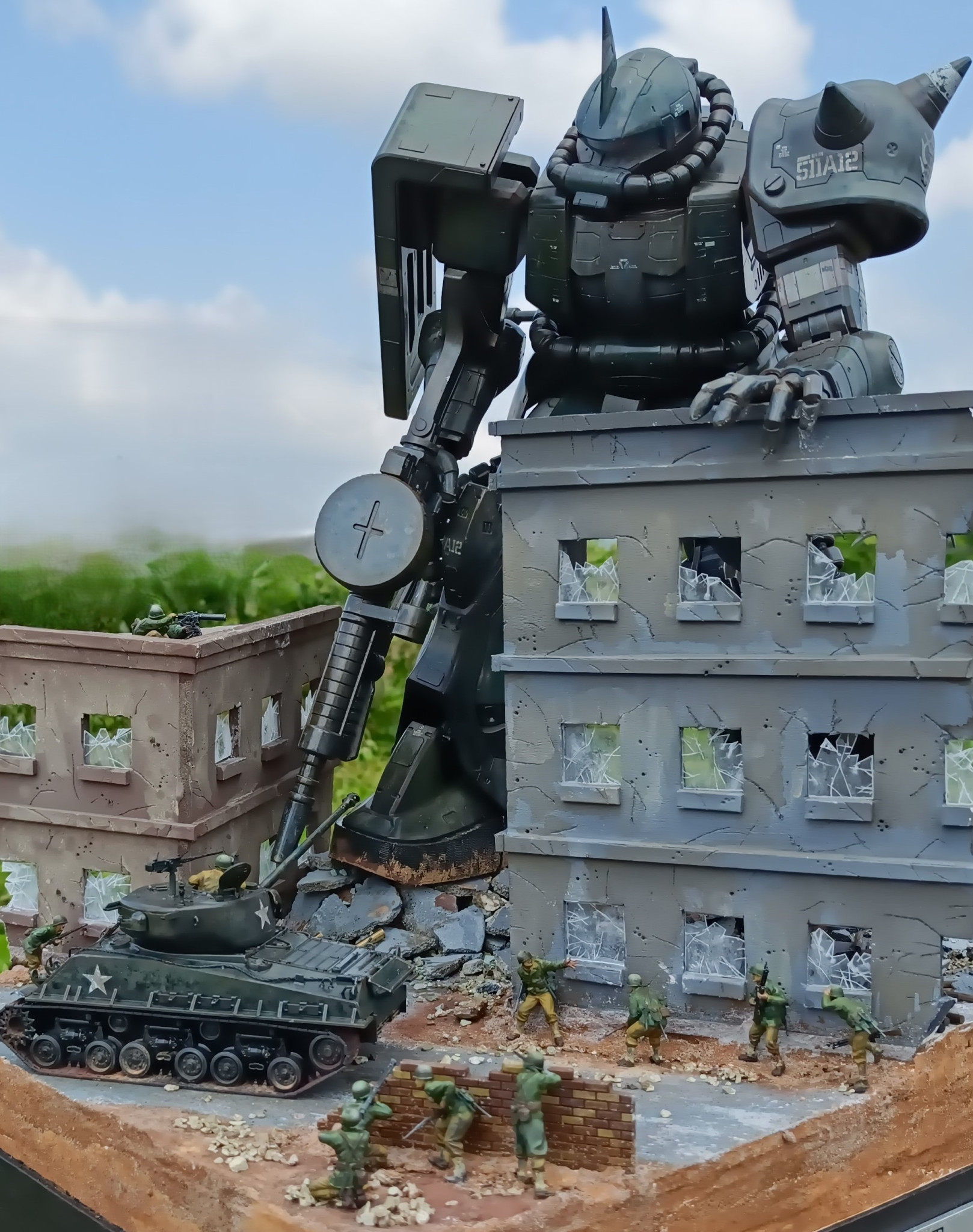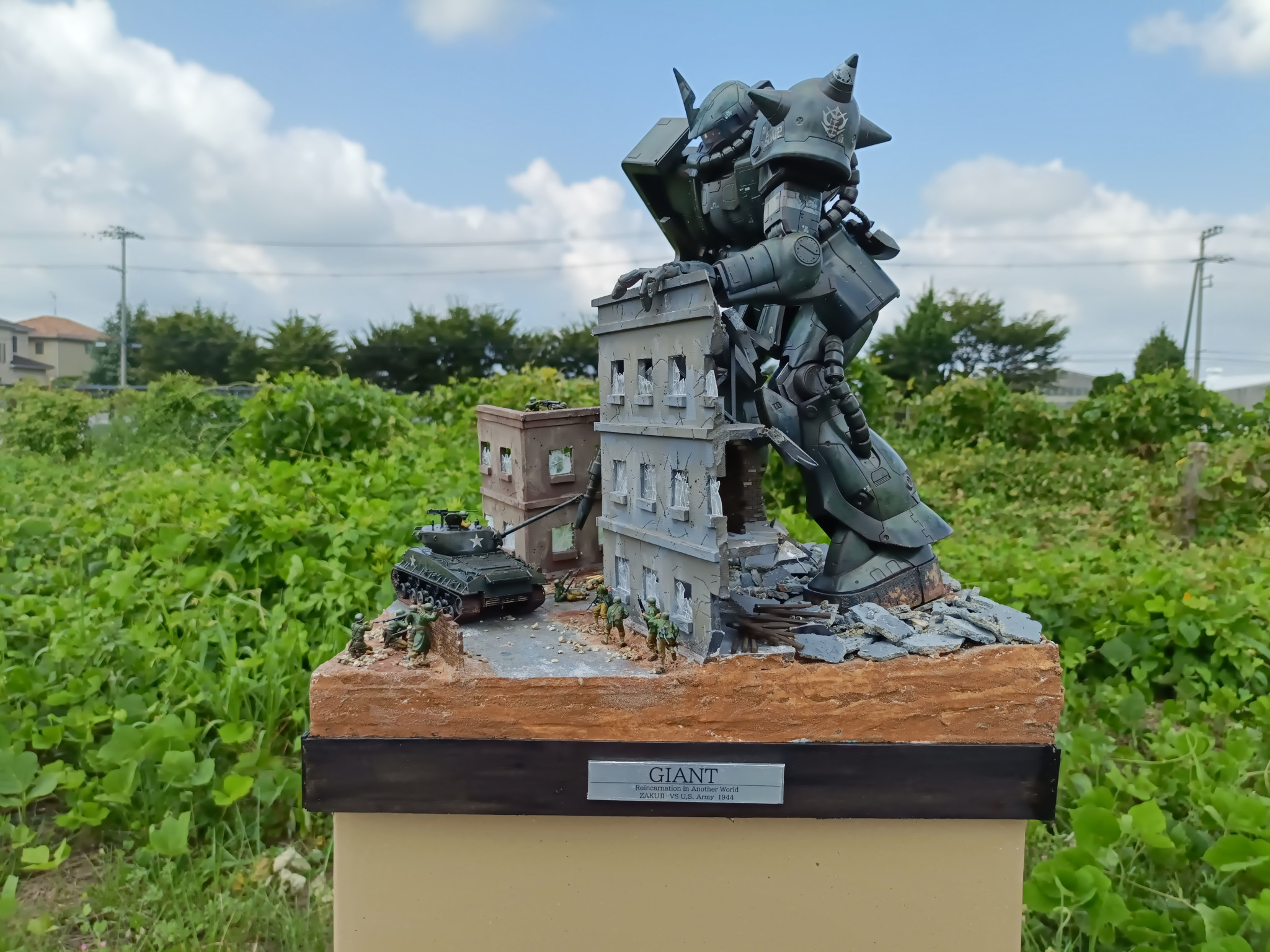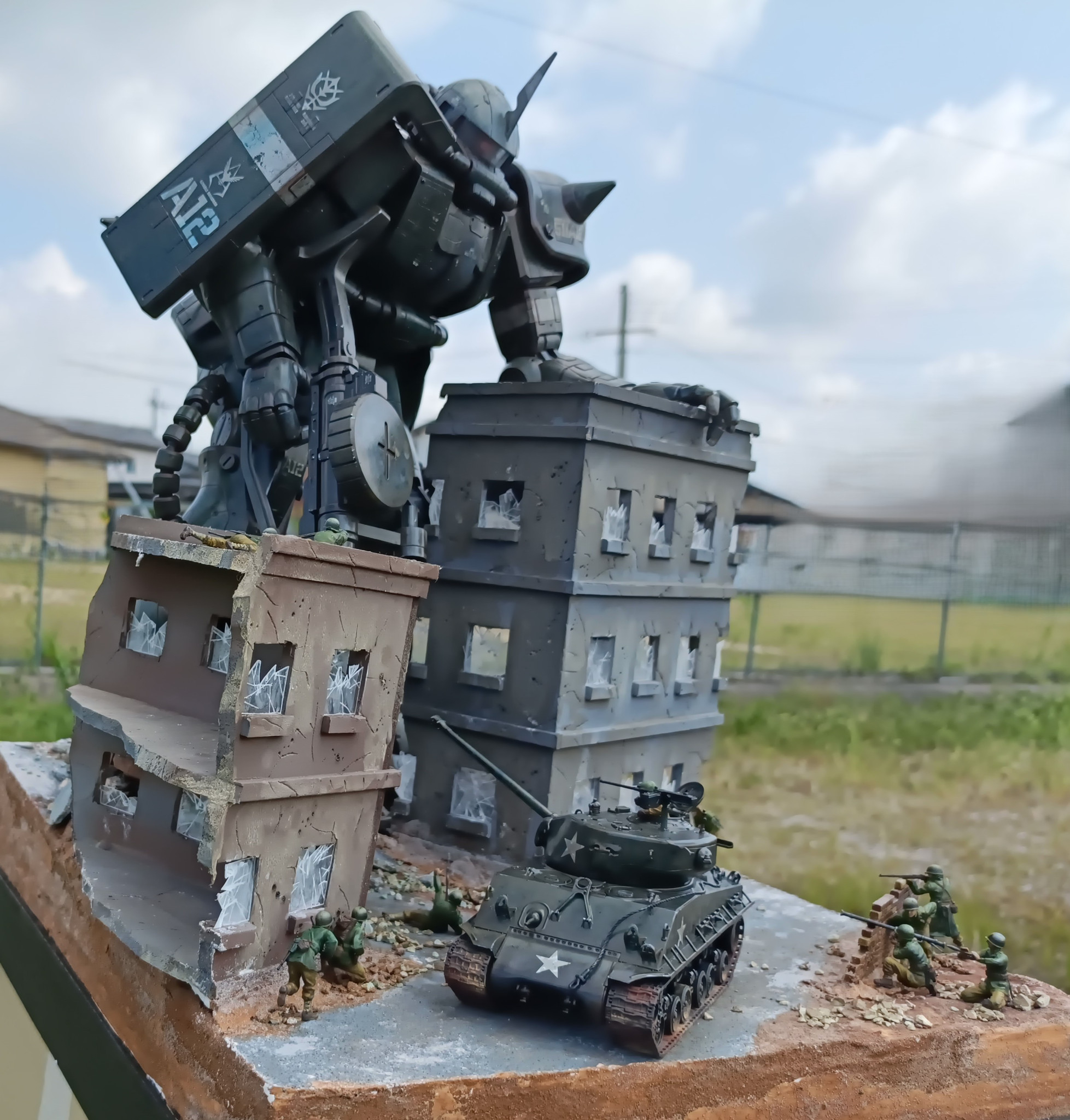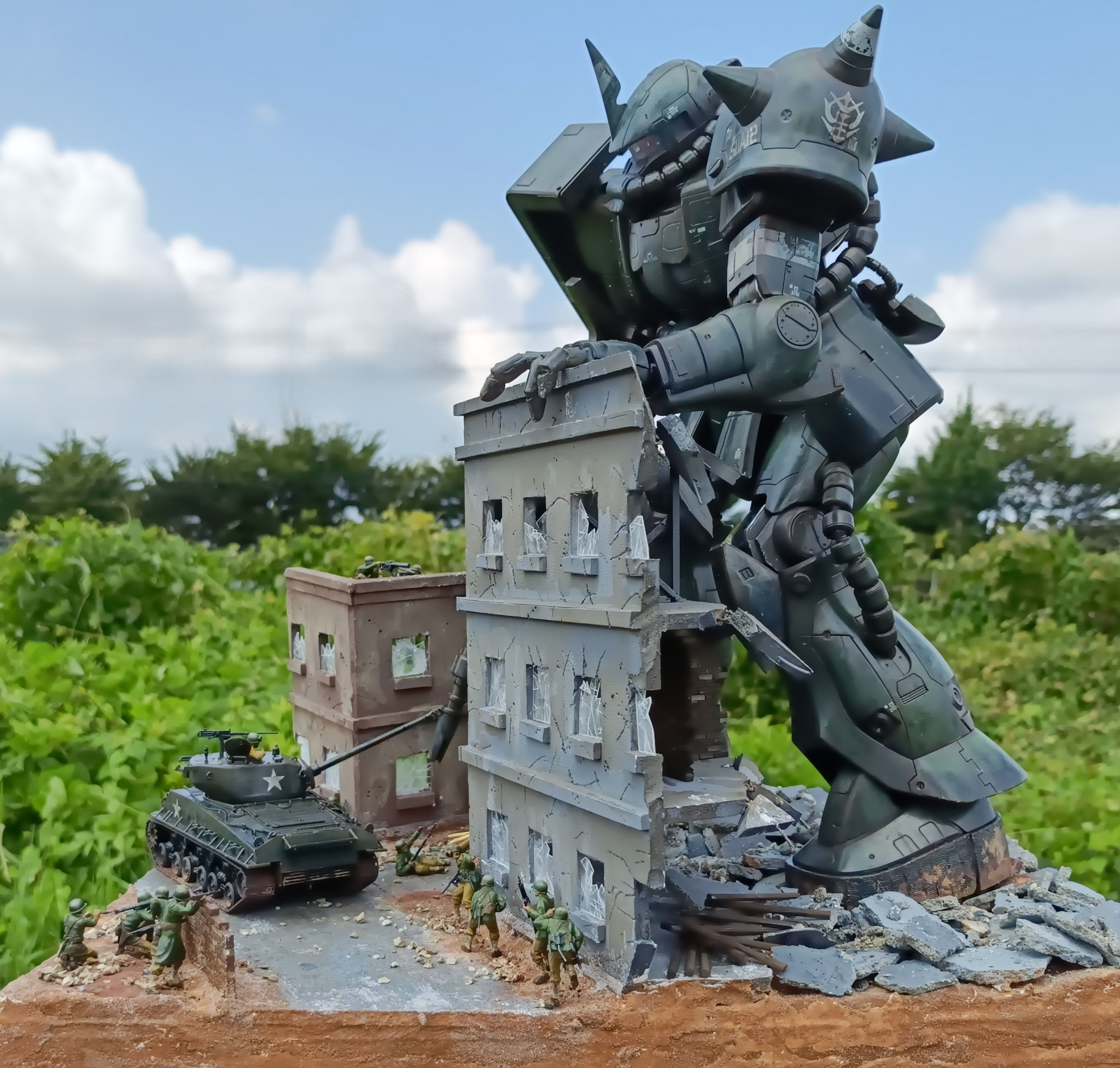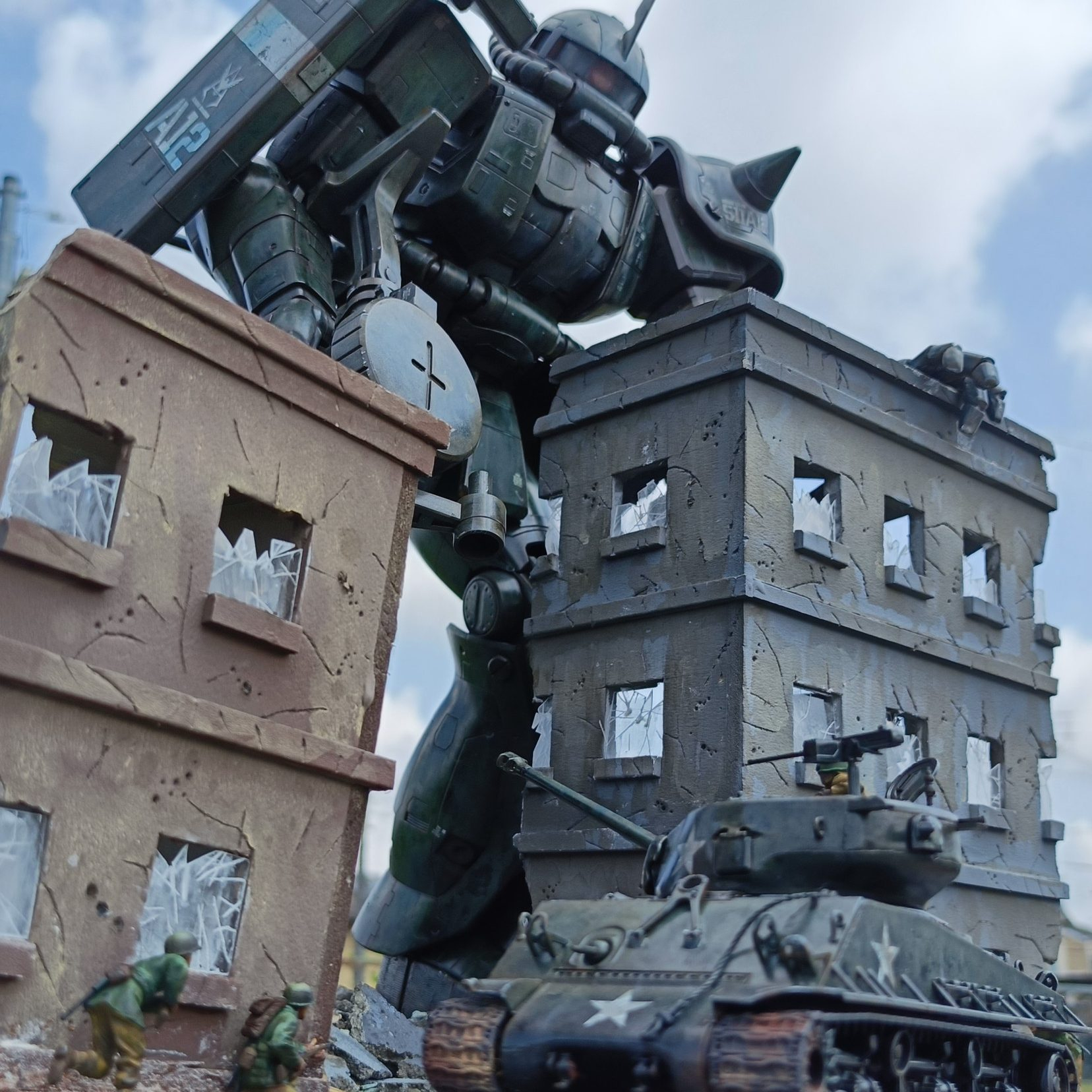 設定は、ザクが第2次世界大戦ヨーロッパ戦線にタイムスリップしたら?というような内容です。フィギュア・シャーマン戦車は同スケールのタミヤ1/48スケールです。