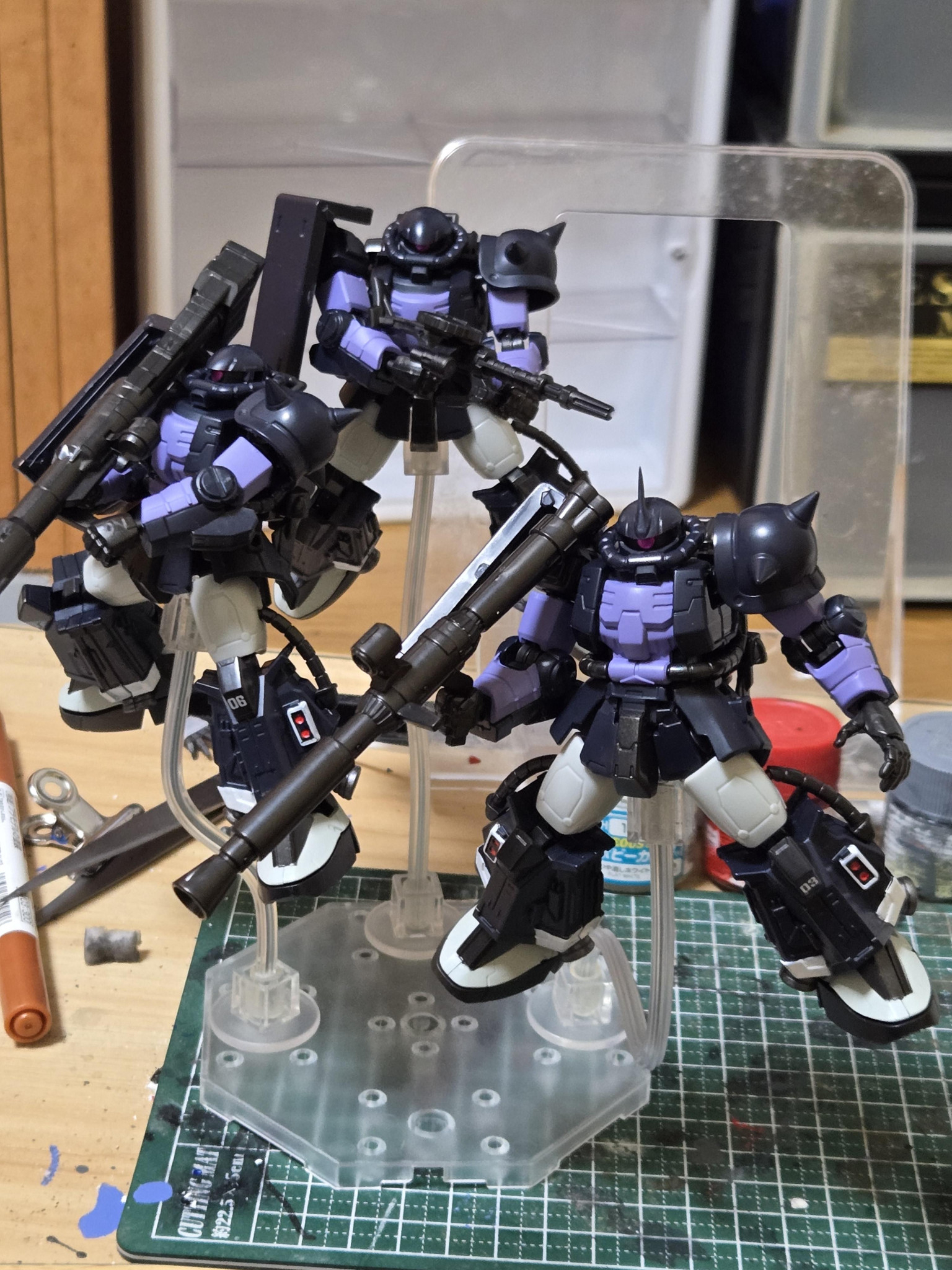 先日発売の食玩Gフレームから待望の黒い三連星の髙機動型ザク✨気合いで3体集めて脚部やランドセル等に部分塗装です
