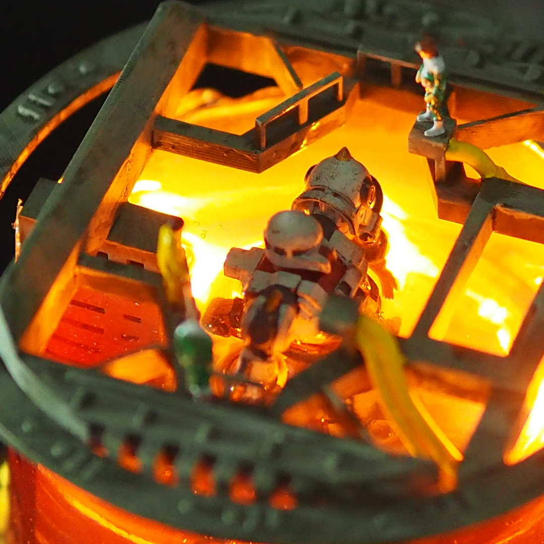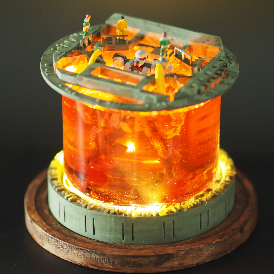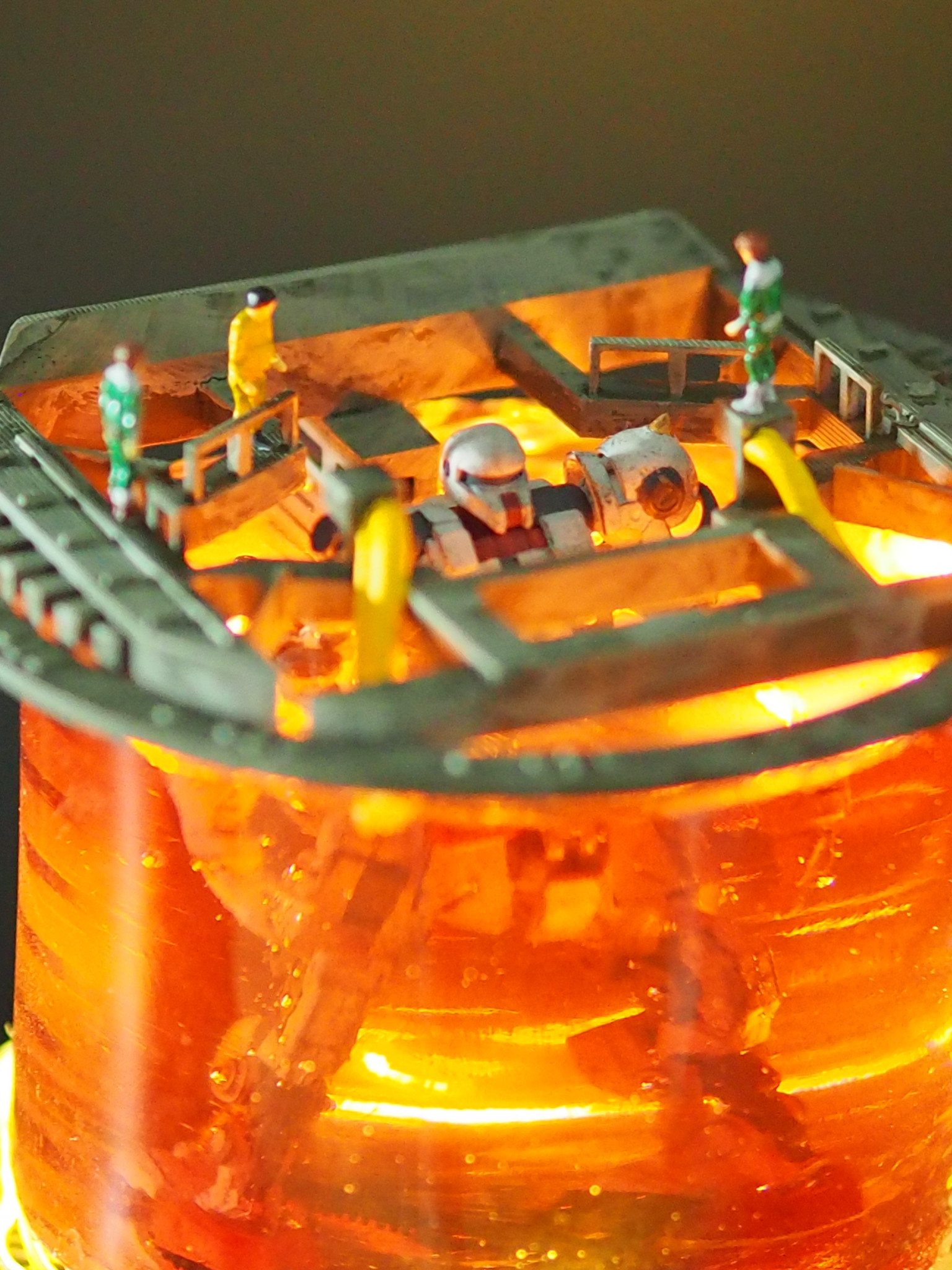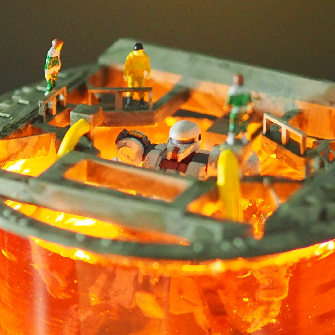 下から木の台座。3Dプリンタで出力した土台、魔法陣ぽくなってます(センス、、、)。ザクはレジン液に沈めて、兵士たちが乗っている足台の部分も一緒に付け込んで硬化させています。入れるの忘れましたが他にLEDライトが有ります。