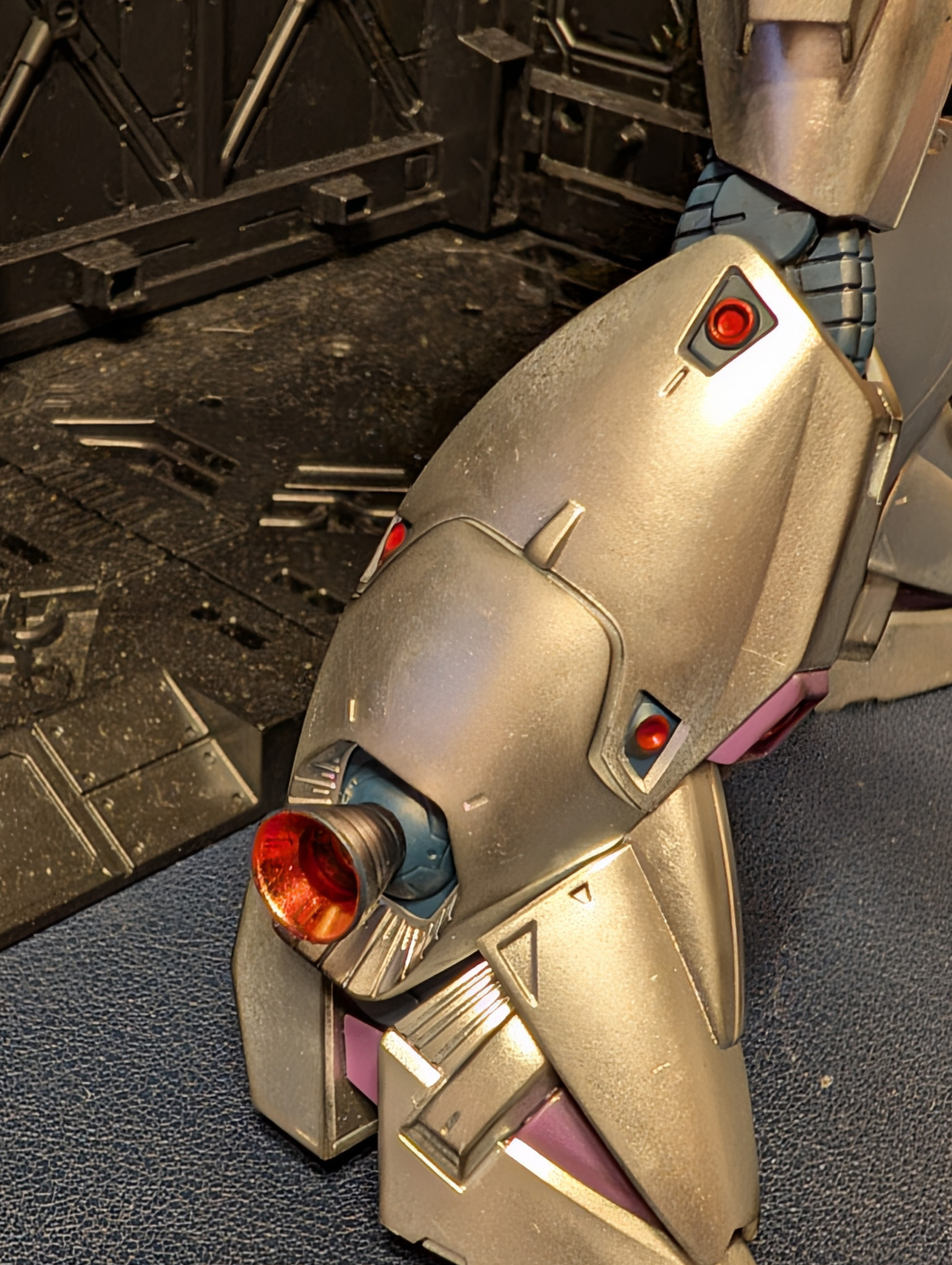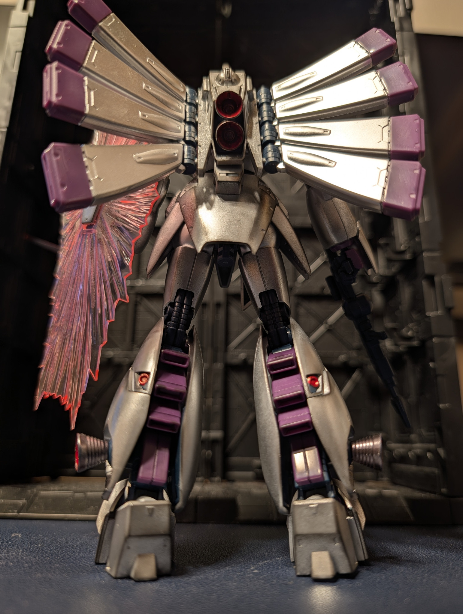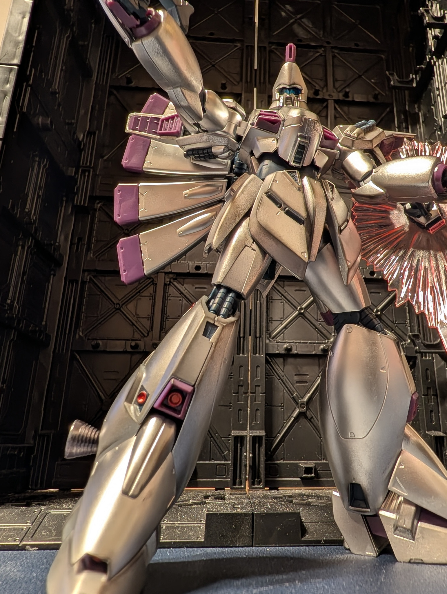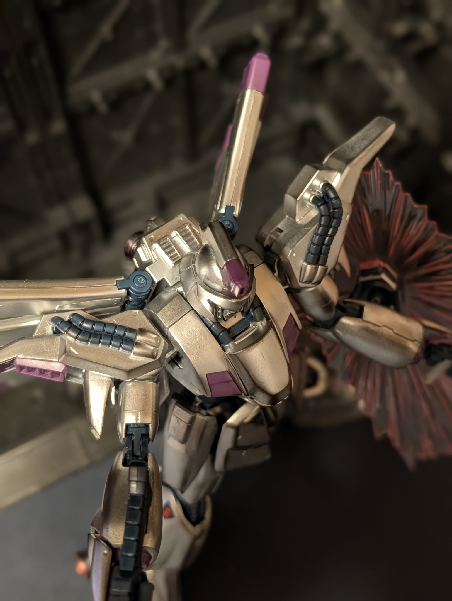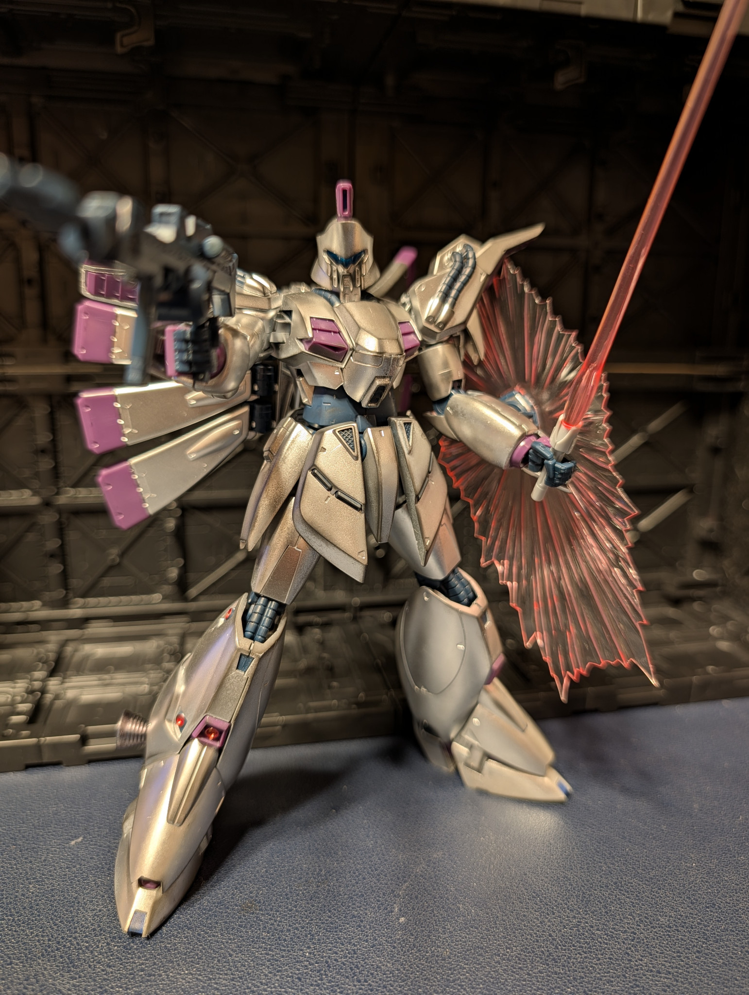 RE/100ビギナギナです。通常カラー品ですが、ガンダムマーカーのシャインシルバーで全身塗装して、エクストラフィニッシュ風にしてみました。