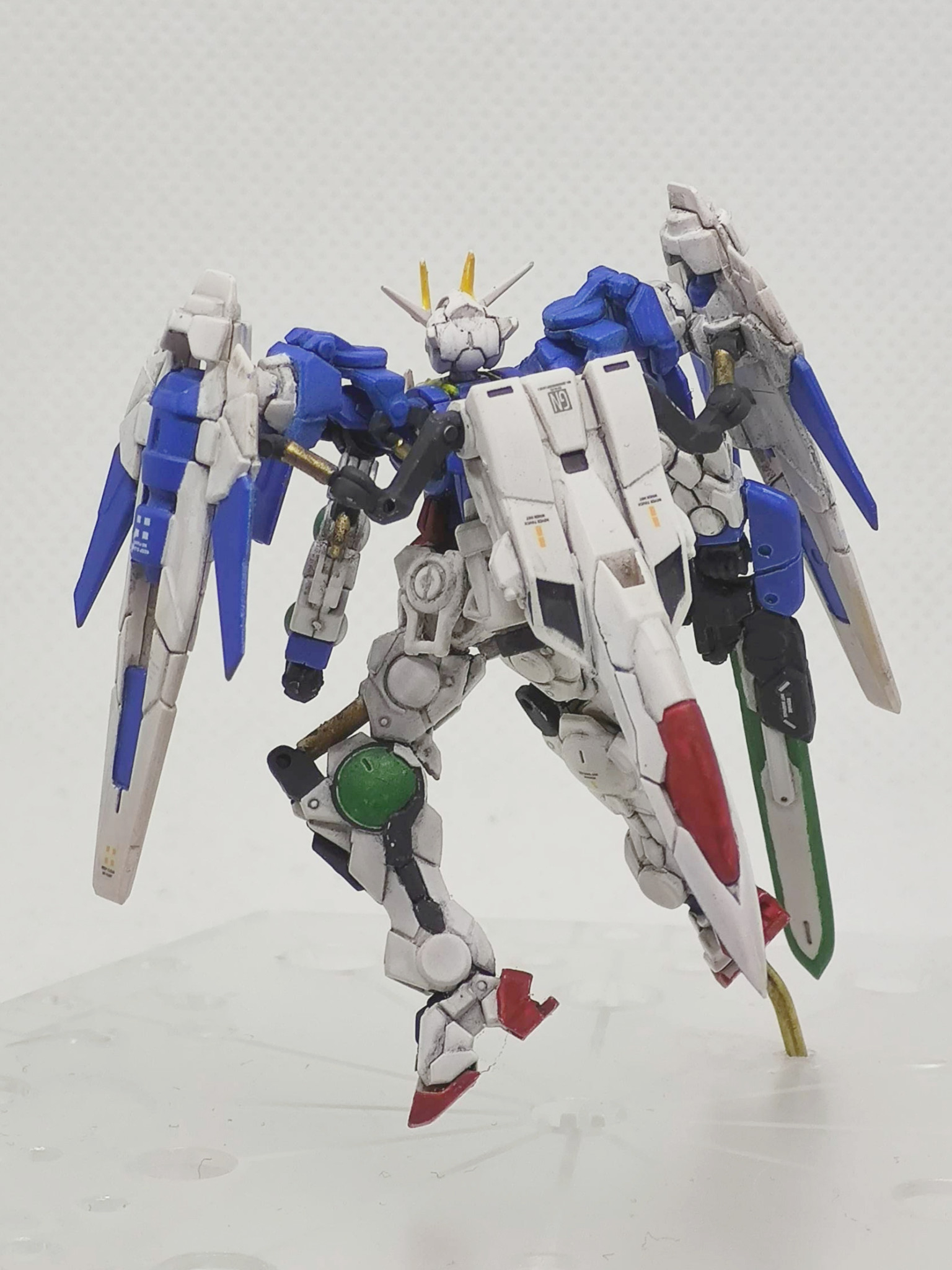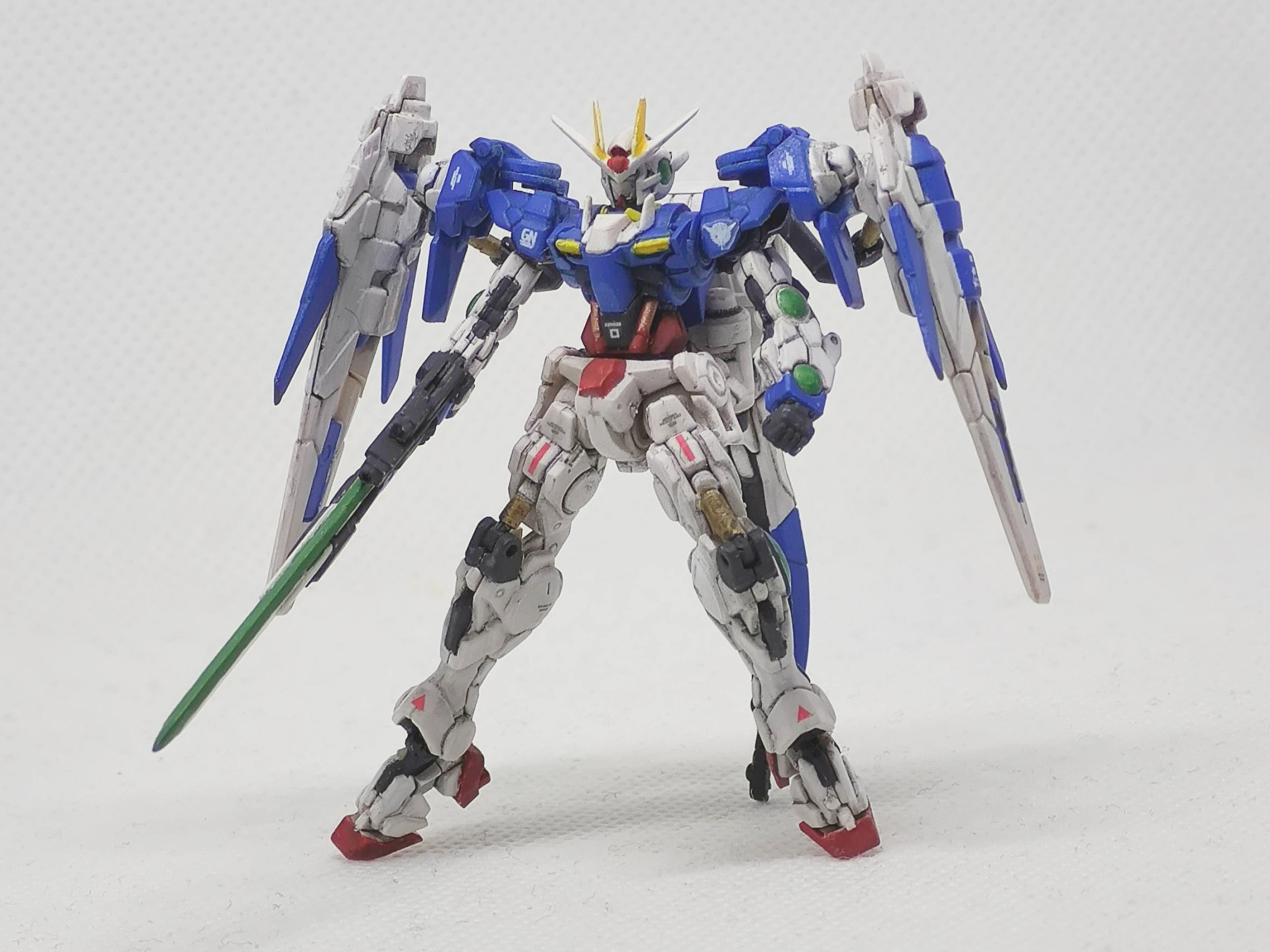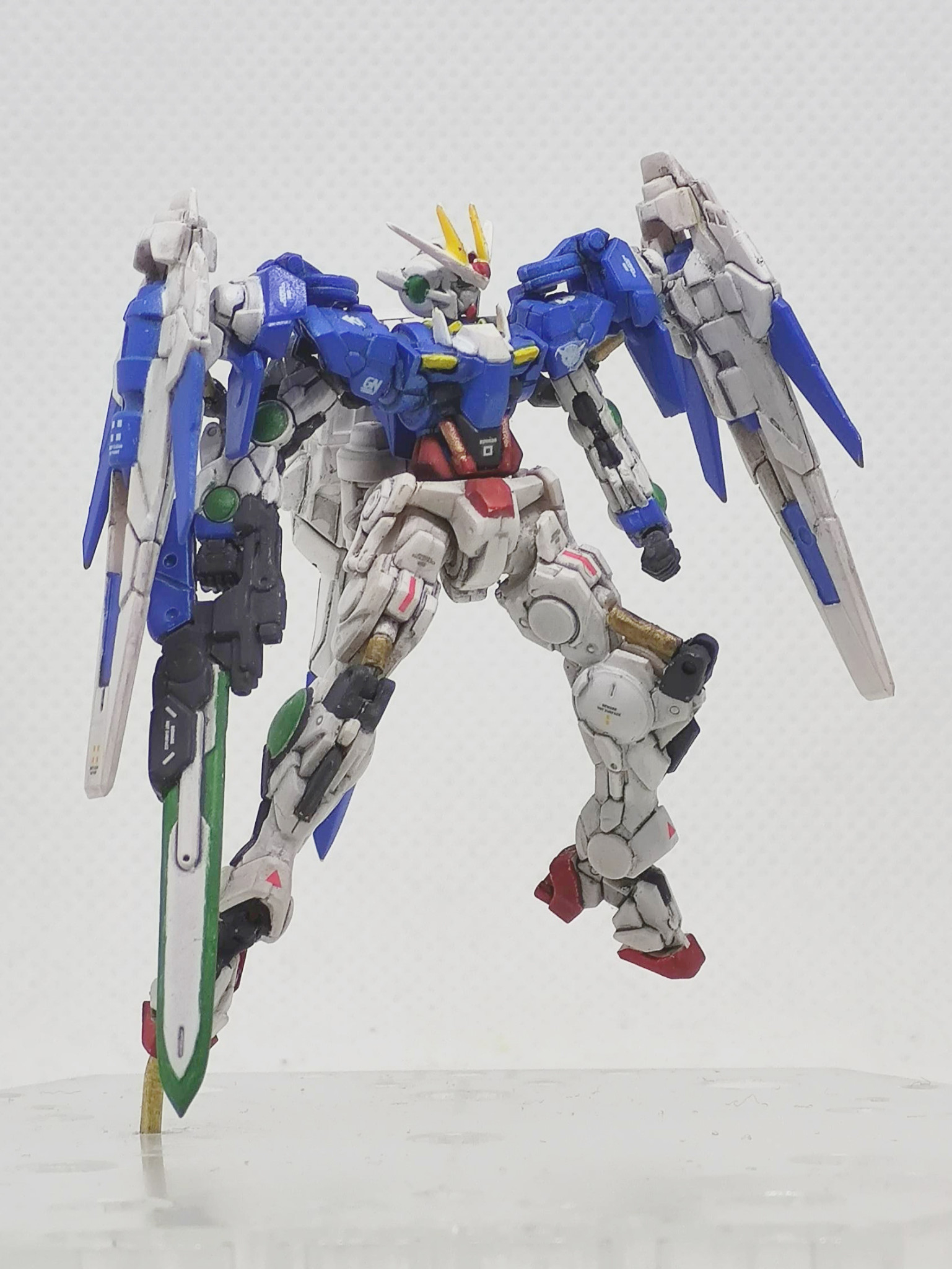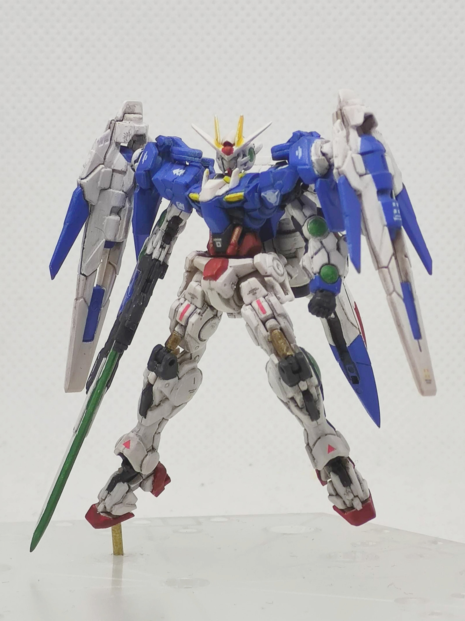ガンダムアーティファクトのダブルオーライザーです。元キットではGNソードを折り畳んだライフルモードだったのでソードを展開した状態に改造しています。あとダブルオーガンダムタイプはGNドライブで飛行が出来るようなので、空中ポーズにしてみました。