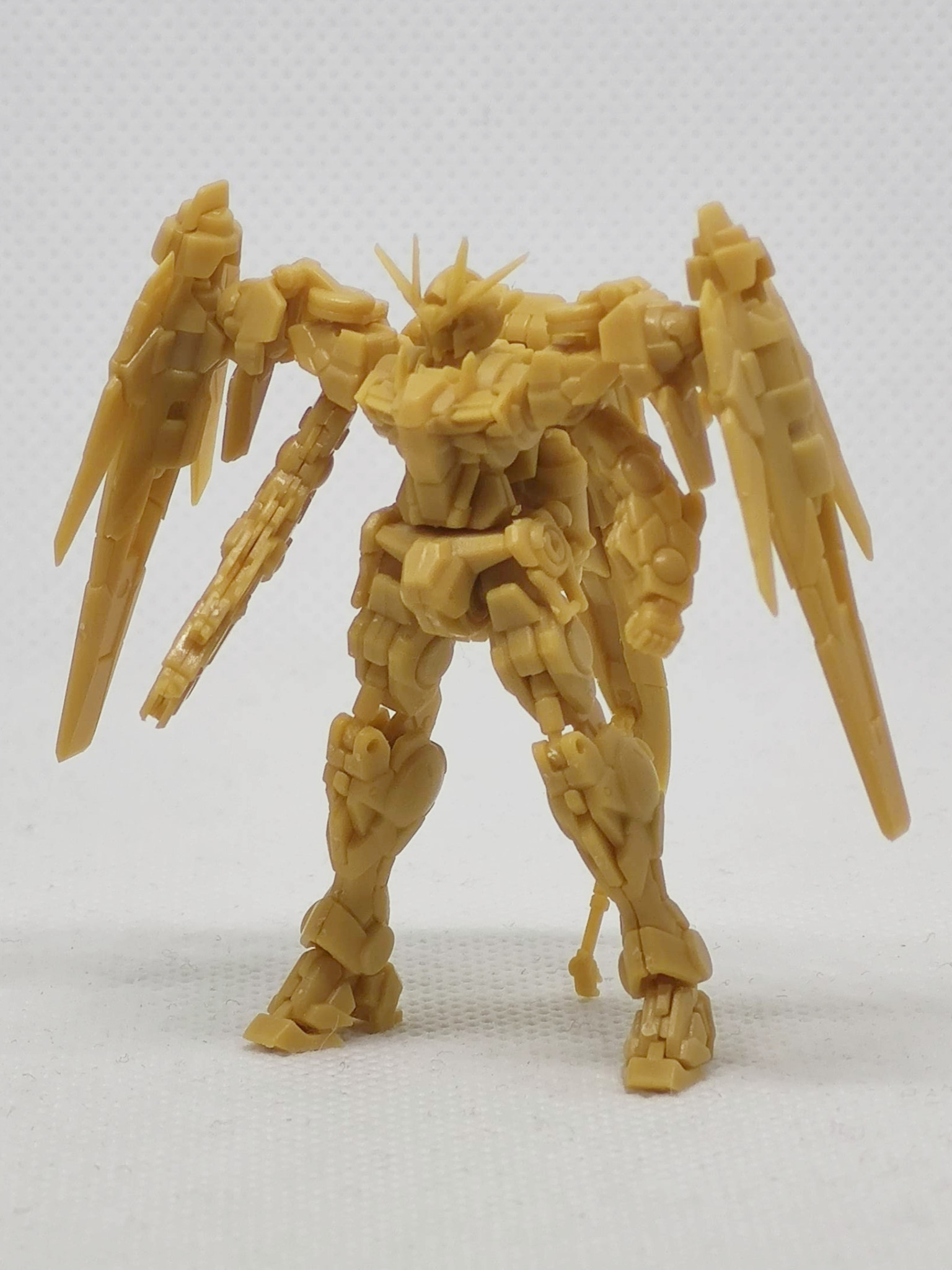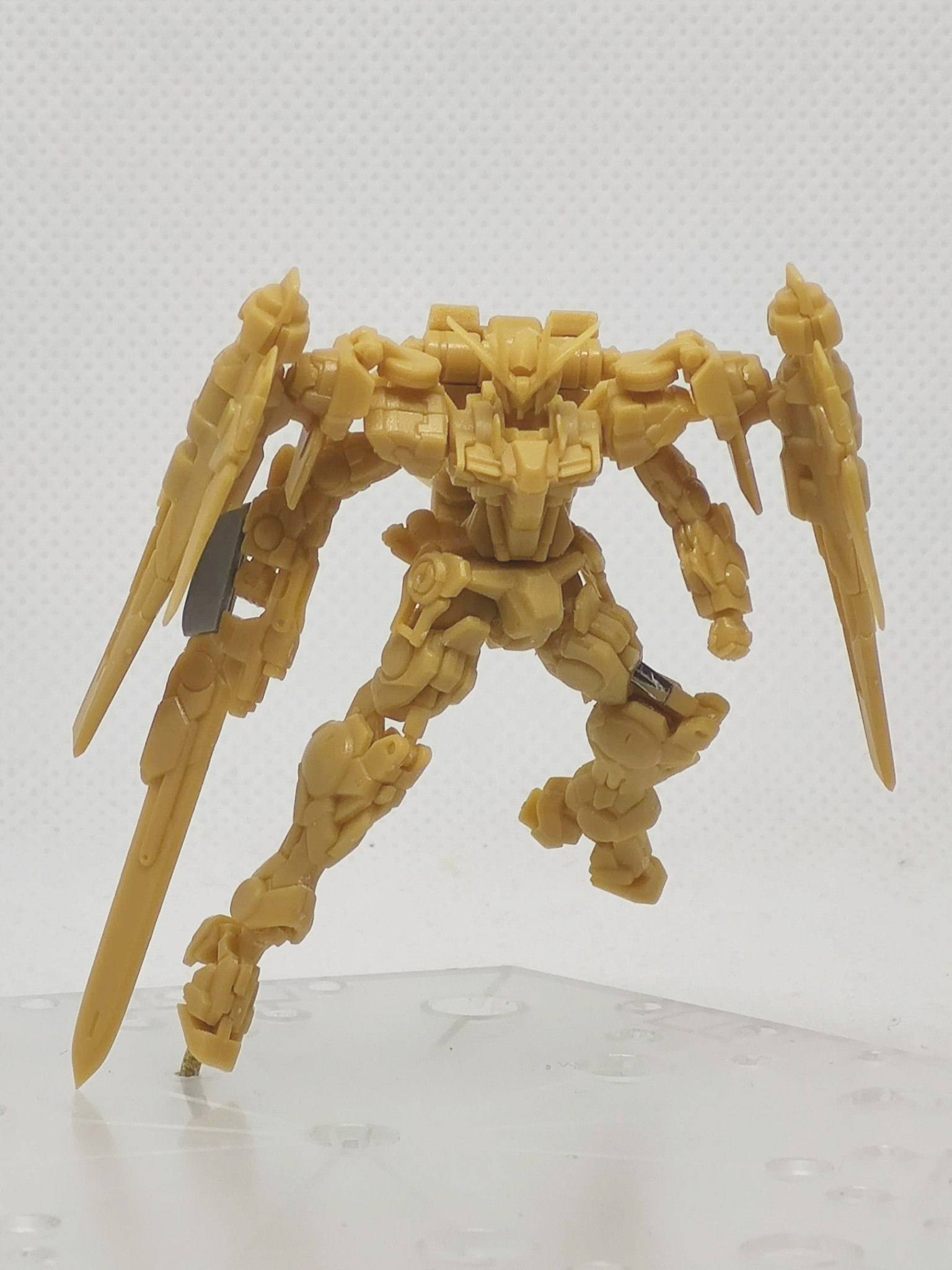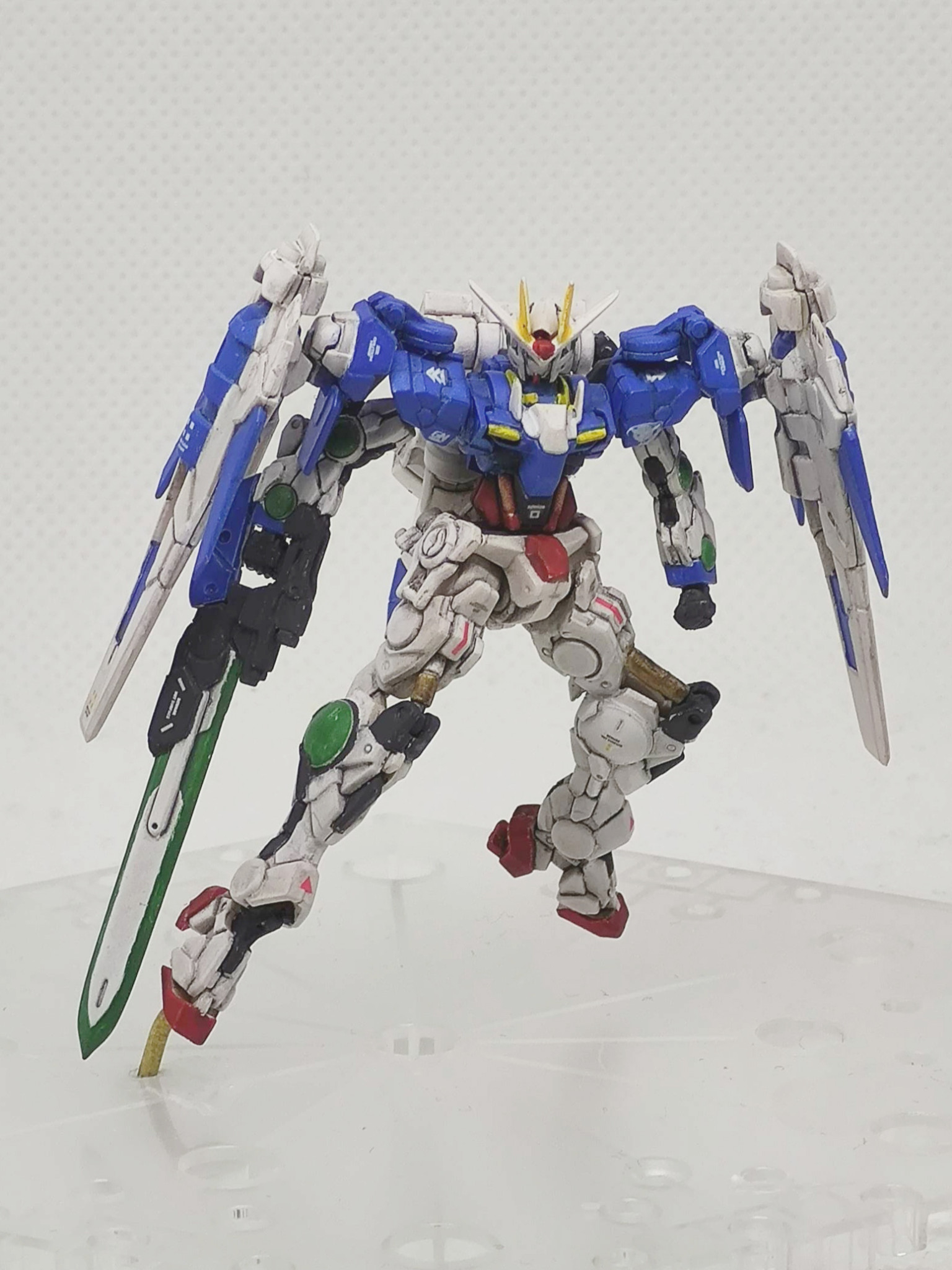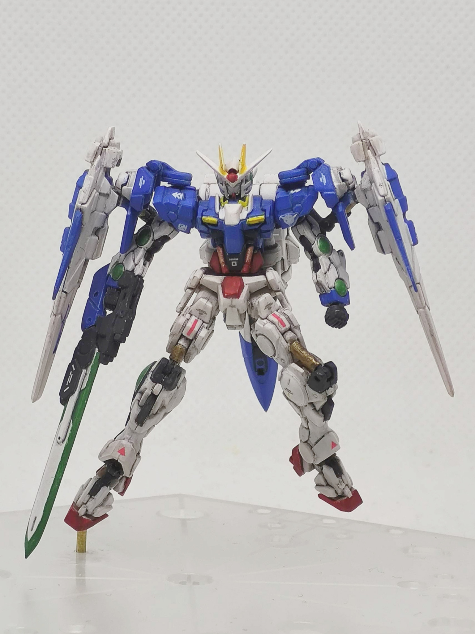 ガンダムアーティファクトのダブルオーライザーです。元キットではGNソードを折り畳んだライフルモードだったのでソードを展開した状態に改造しています。あとダブルオーガンダムタイプはGNドライブで飛行が出来るようなので、空中ポーズにしてみました。