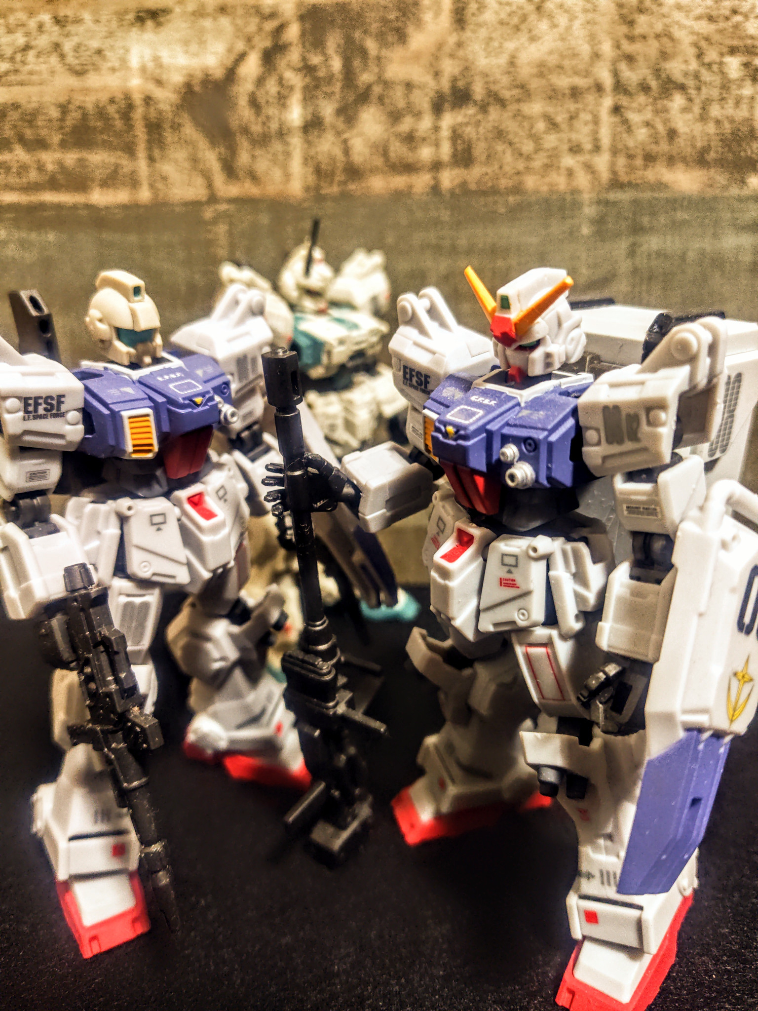 ここからウェザリングして、もう戦いつくした歴戦の勇者っぽさを表現したいんですが、せっかく3体並べているので1機だけ汚すなんて、ねぇ?。