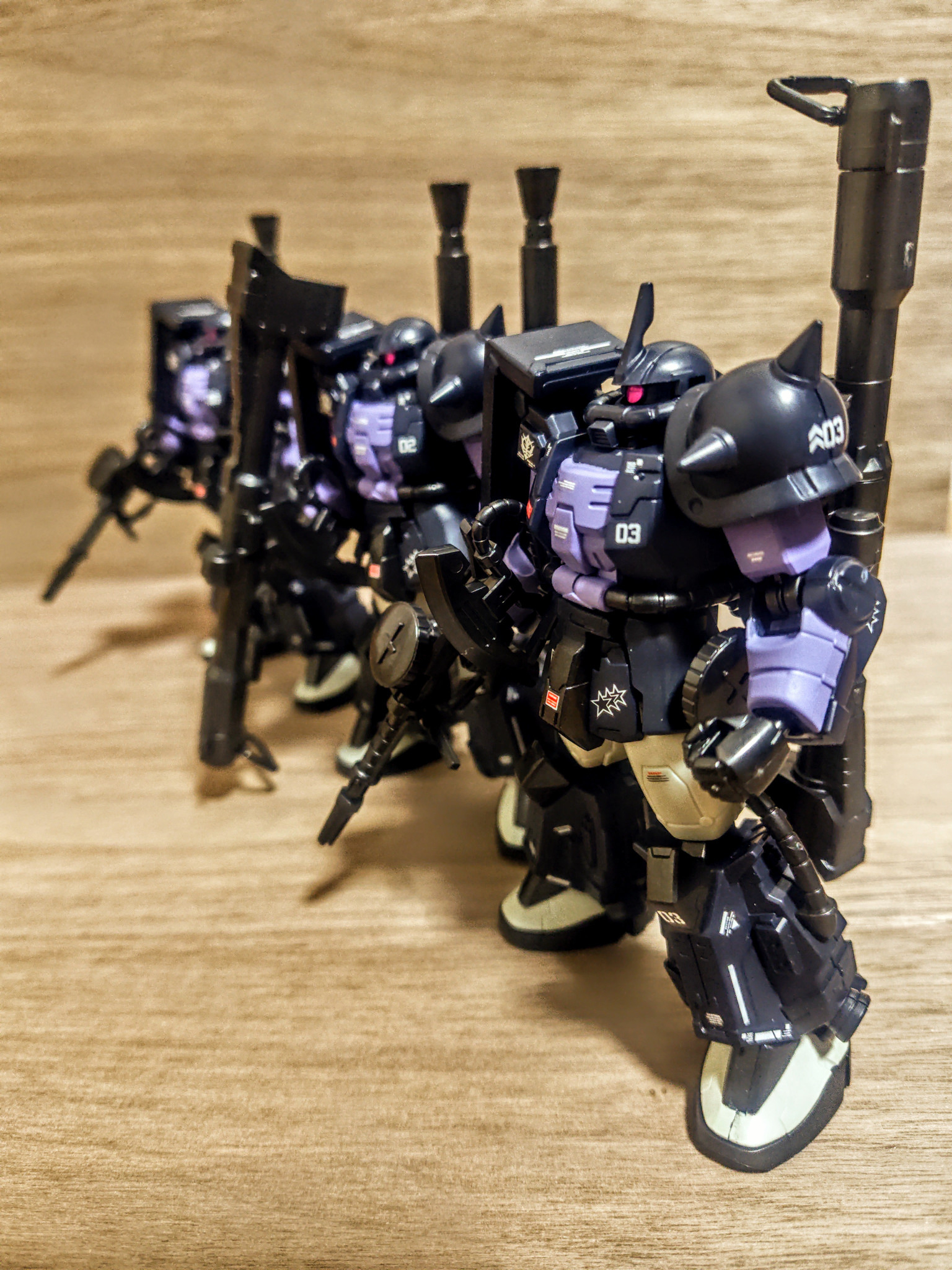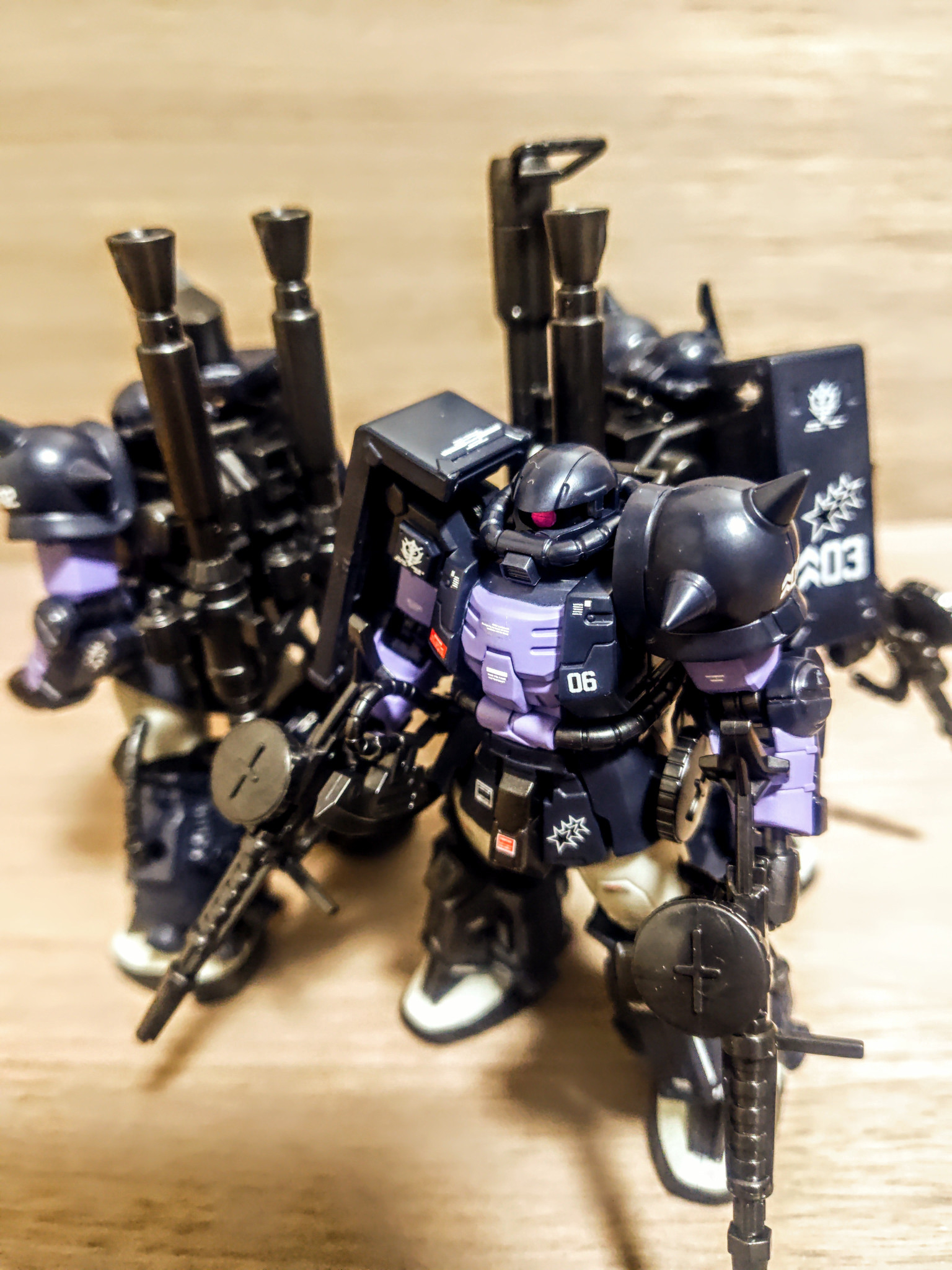 いつものように素組にデカールを貼っていますが、今回は同じチーム(小隊)の中でもこの三人なので、いつも以上に同じ位置に同じものがあるように意識して貼りました。