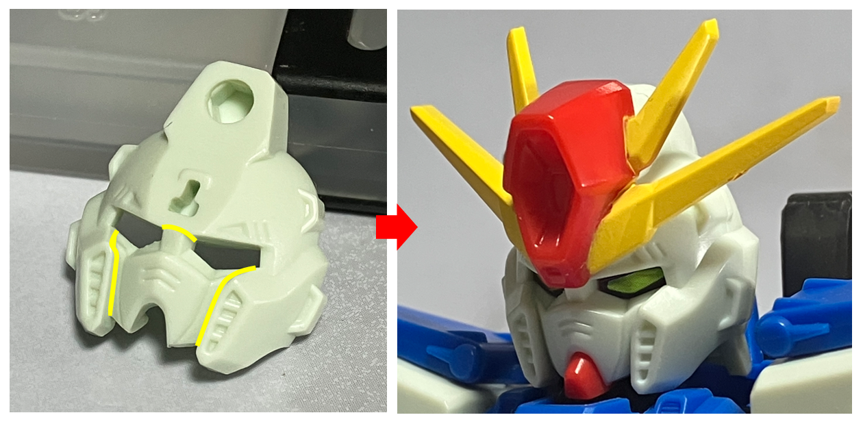 顔がのっぺりしている様に感じたので、写真の黄色線部分をカットし、マスクを少し奥に取り付けています。