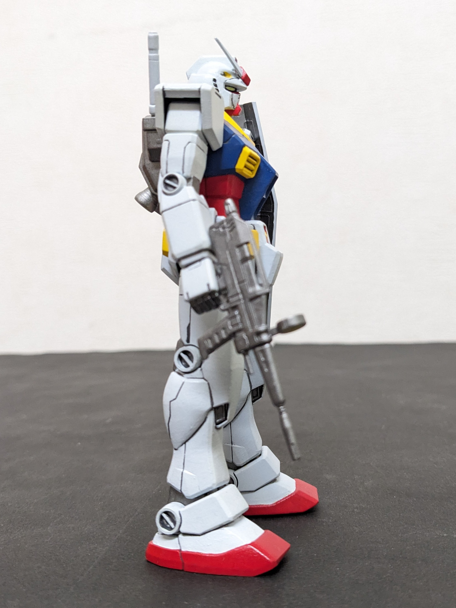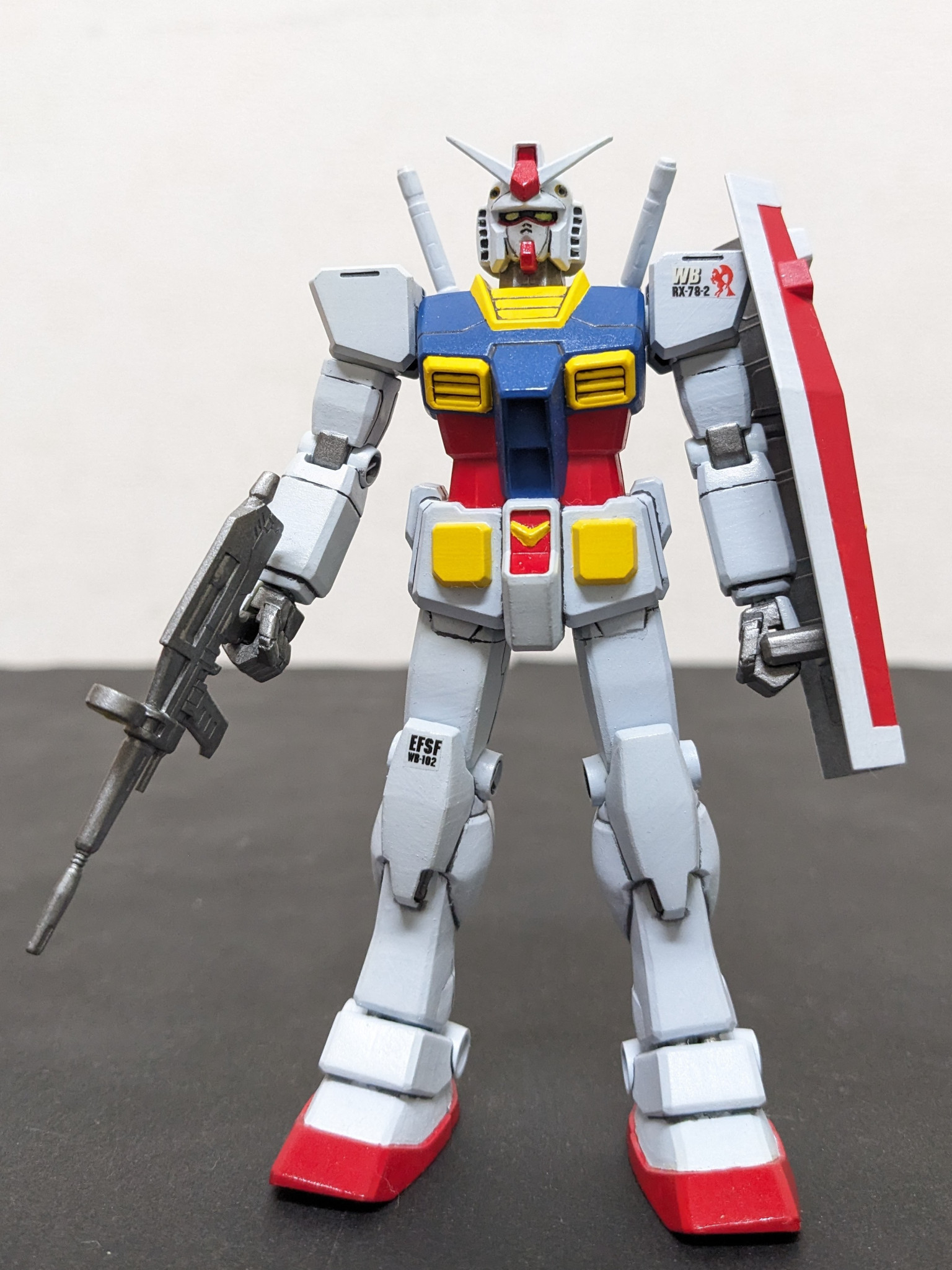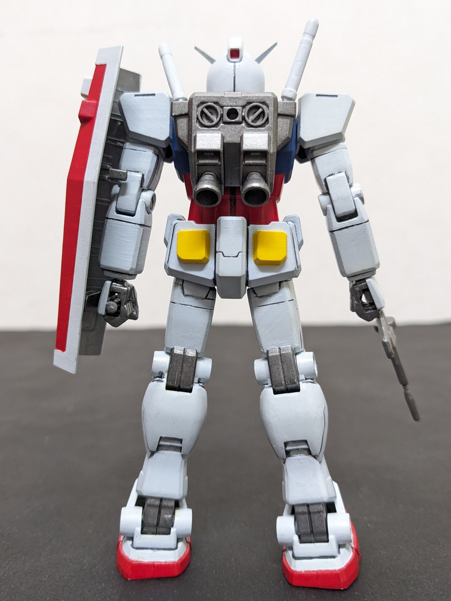 当時エアブラシを使うなんて想定もなく、タミヤカラー水性で筆塗り。赤青黄とガンメタはビンそのまま、白は微量青を入れた気がする。
