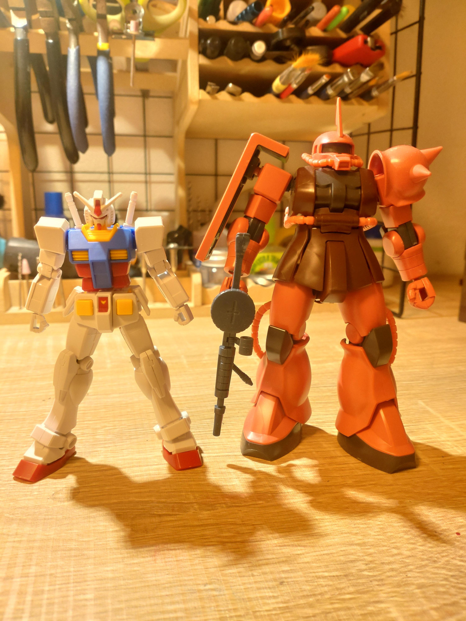 素組みでHGシャアザクとの大きさ比較。かなり小ぶりなのと脚のモナカ感が特徴的ですね。