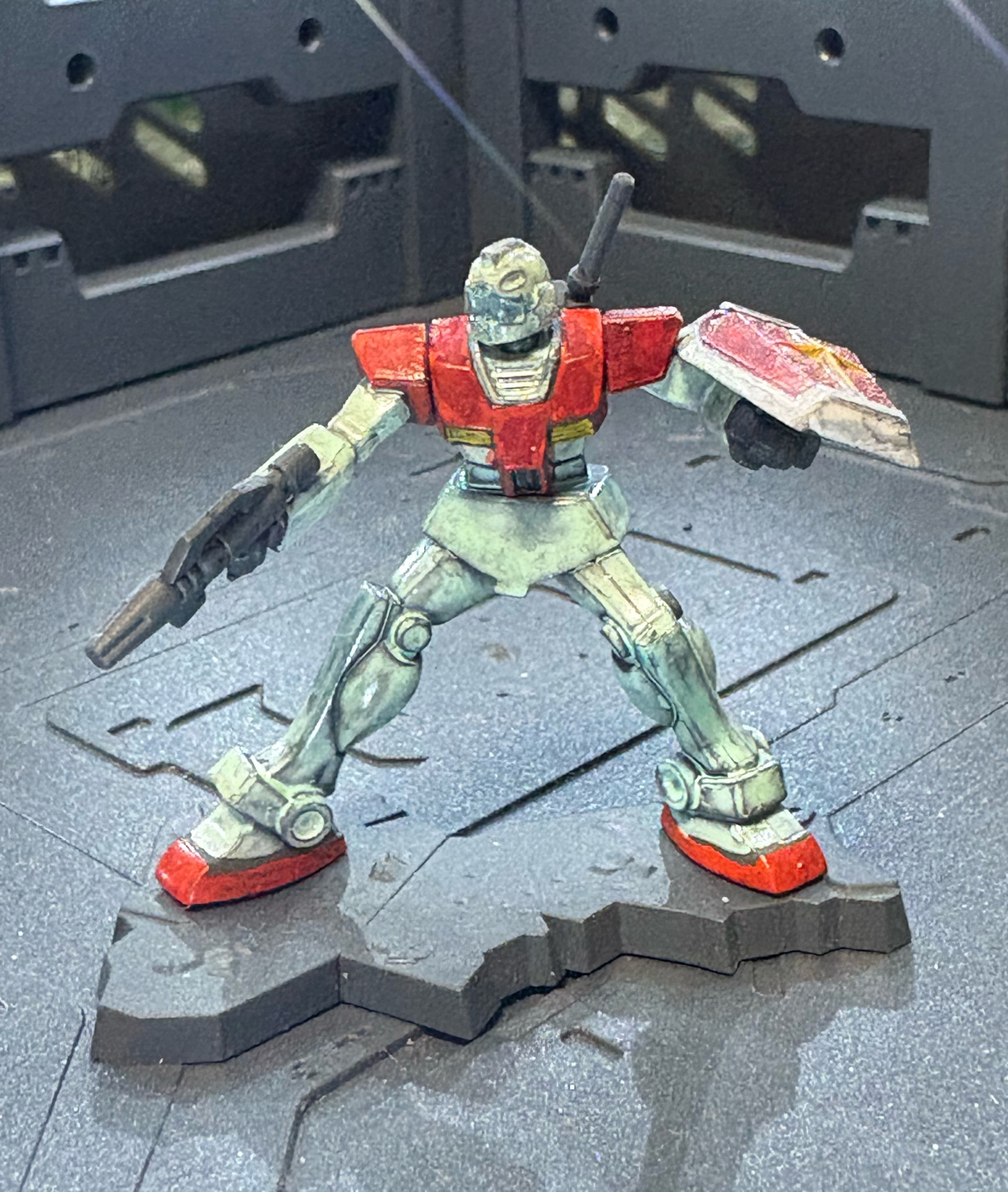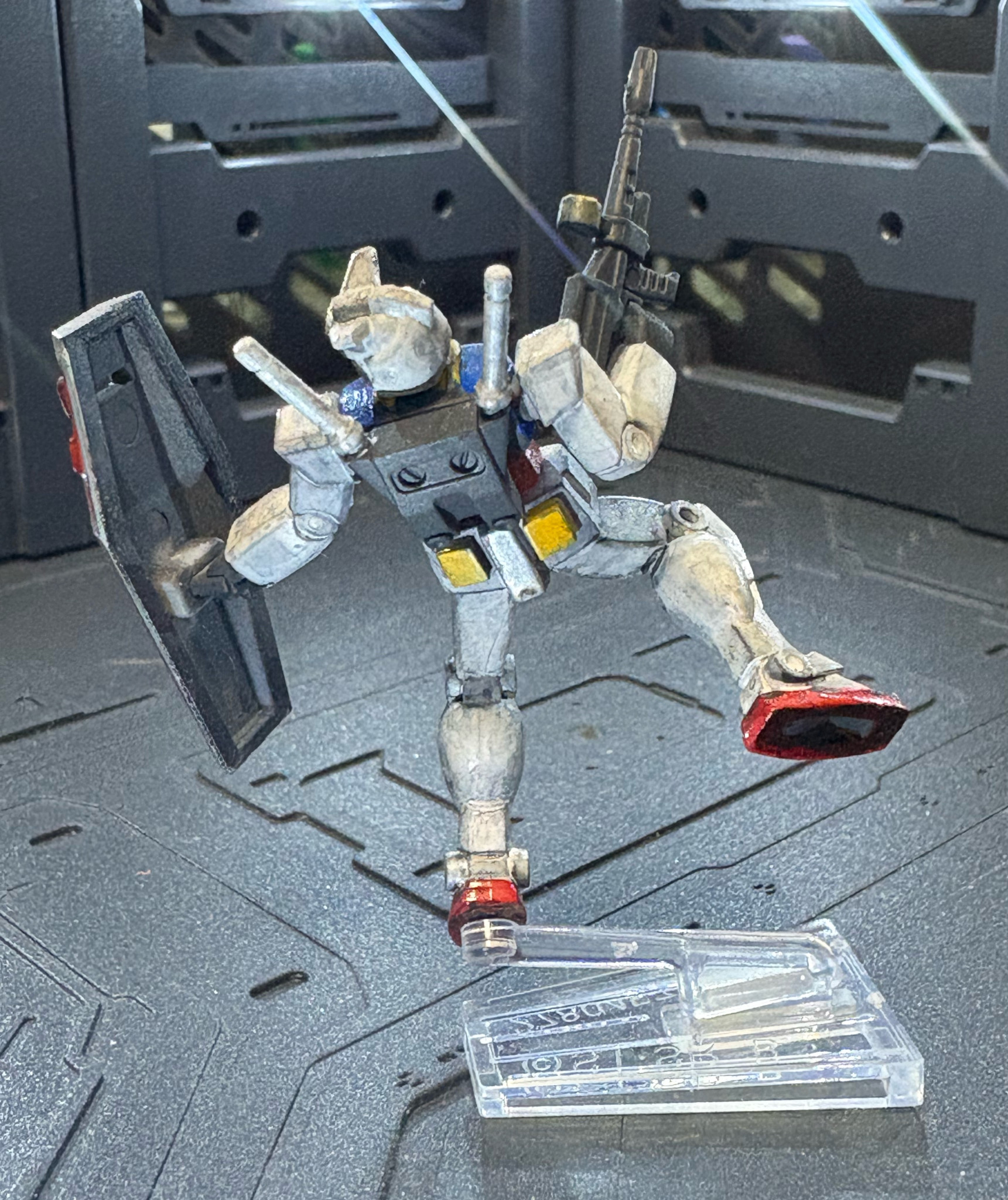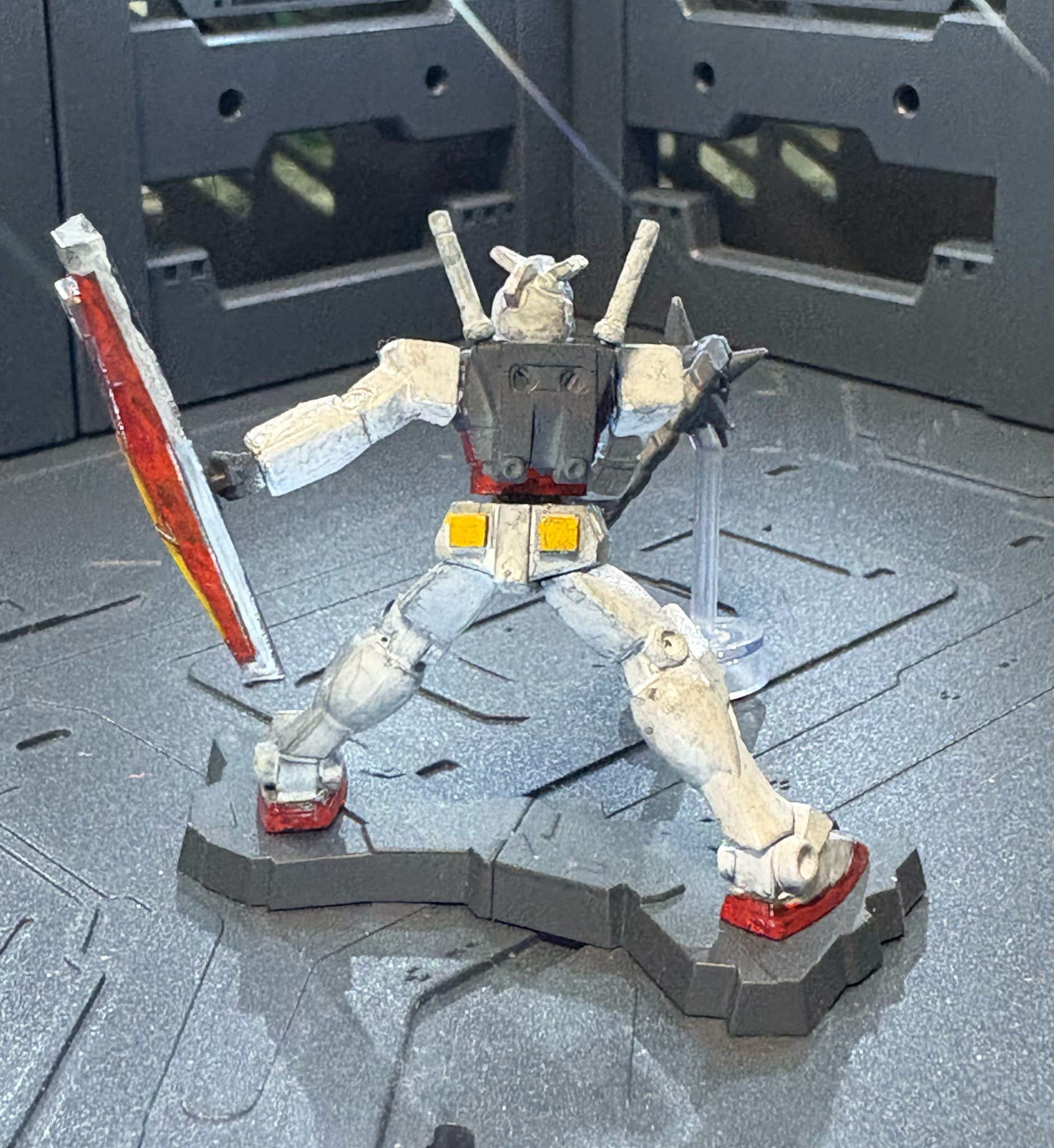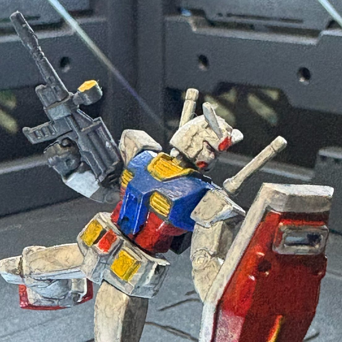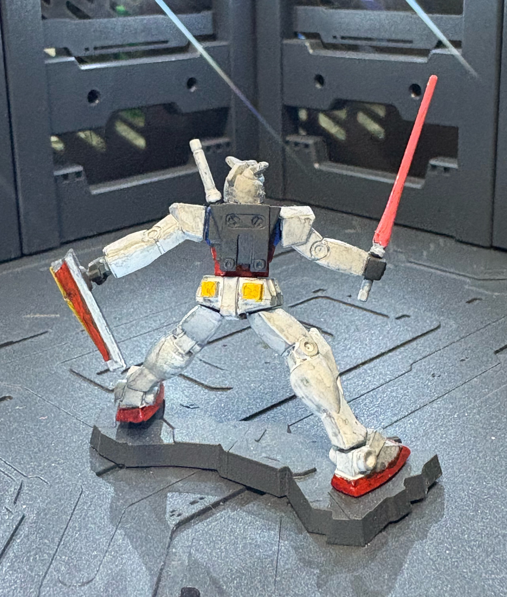 ガンダムチョコサプを塗り上げて完成させました。ラッカーサフから、買い貯めてあまり使わなくなったガンダムマーカーを筆塗りし、アッセンブルカラーのシェイドで仕上げてみました。
