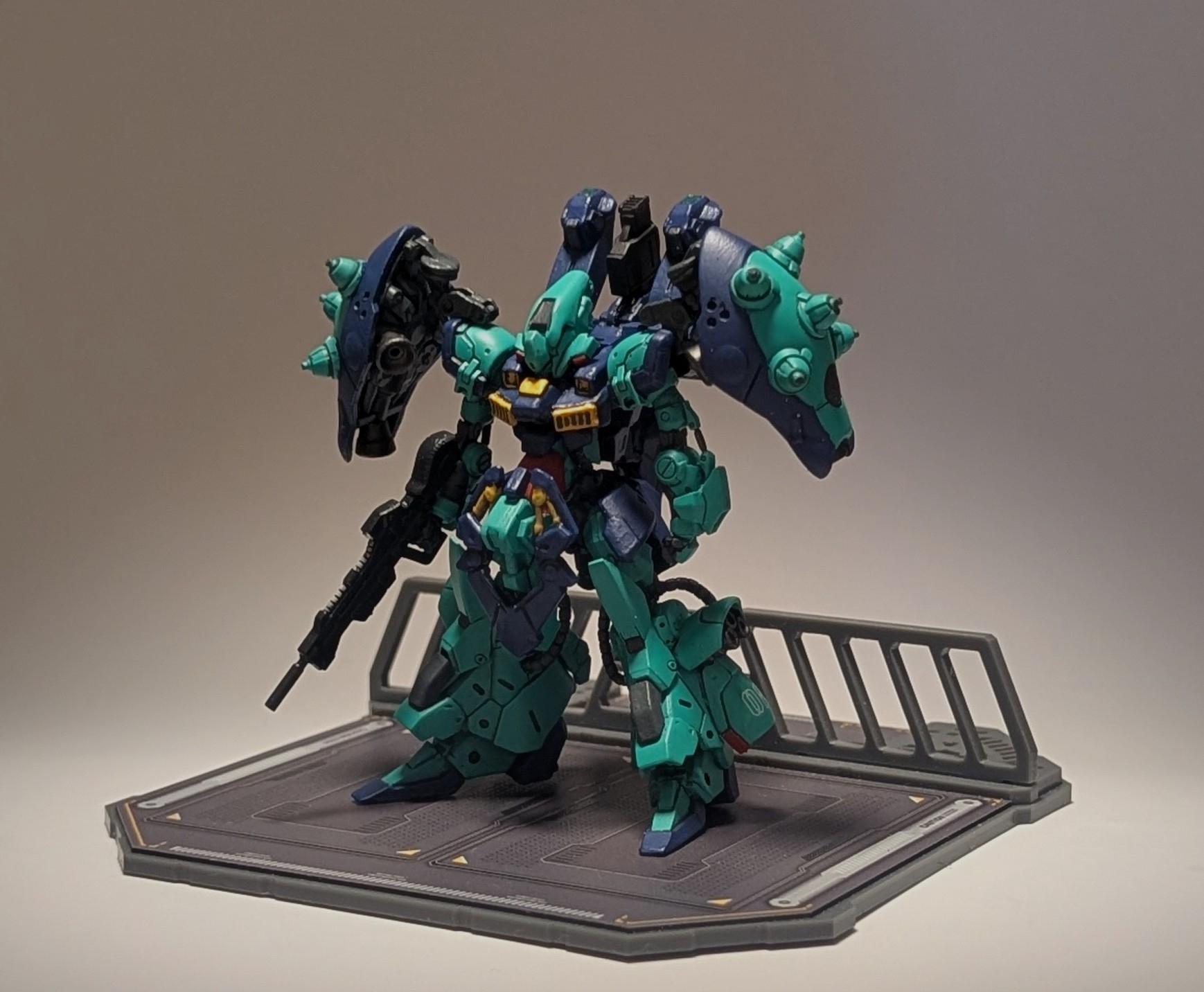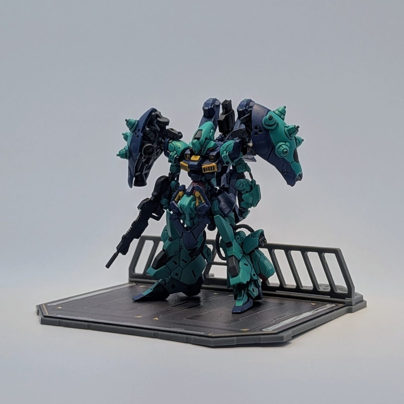 特徴:突如として現れたネオ・ジオン総帥シャア・アズナブルの近衛騎士「白仮面」の専用機。シャアの搭乗していたディジェ・トラバーシアとリック・ディジェのパーツを組み合わせ、白仮面自らが調整し完成した機体である。性能はサザビーにも引けを取らないほどであり近衛騎士に相応しい高性能な機体に仕上がっている。機体の操縦系にはサイコフレームが使用されており、従来のMSに比べ追従性が大幅に向上している。当初はファンネルの搭載は予定されていなかったが、コックピットにサイコフレームの使用が許可されたためサザビーの後継機の予備パーツを使うことでファンネル搭載機として完成した。しかし予定よりコストが大幅に掛かってしまったため、ファンネル以外の武装はグリプス戦役時代の物を改良した中古品である。