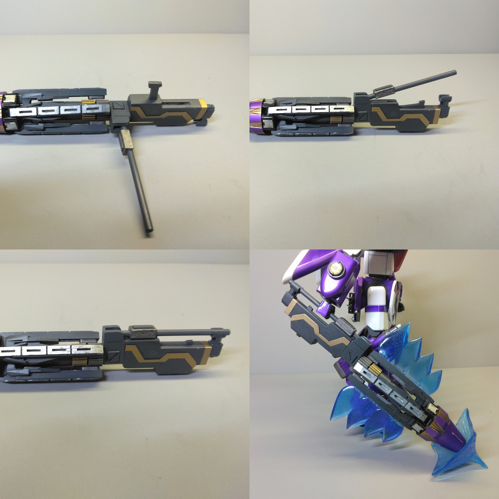 メイングリップは格納、フォアグリップもたたんで銃床と接続して、剣のような斧のようなランスのような形状になります。が、やはりこんなでかい武器を振り回せるか怪しい、ロマン成分多めの機能です。