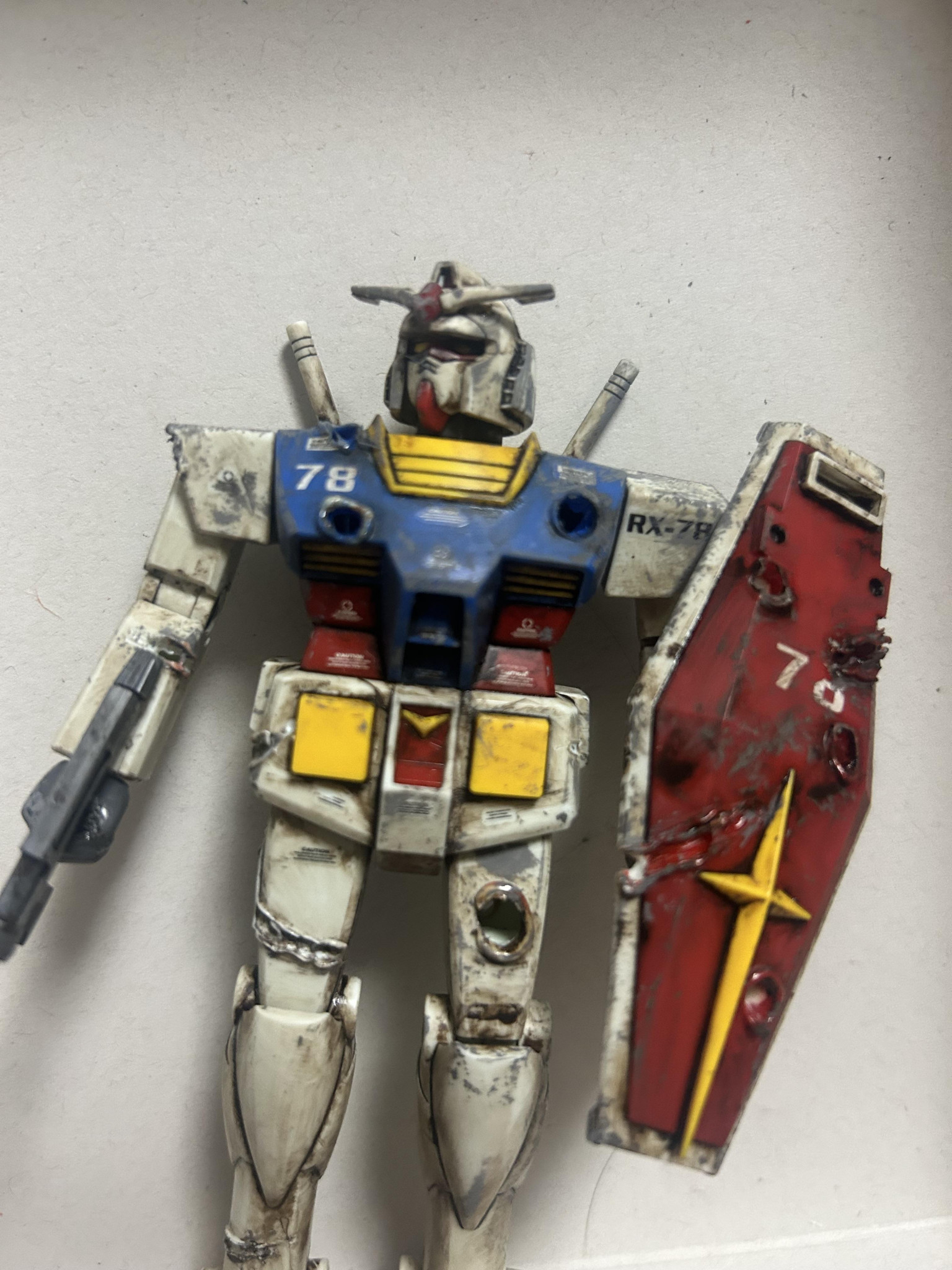ある程度決まったところで汚し塗装&はんだこてで銃跡とサーベル跡をなるべく表現。今回もダークブラウンとスポンジチッピング、ドライブラシで工夫。