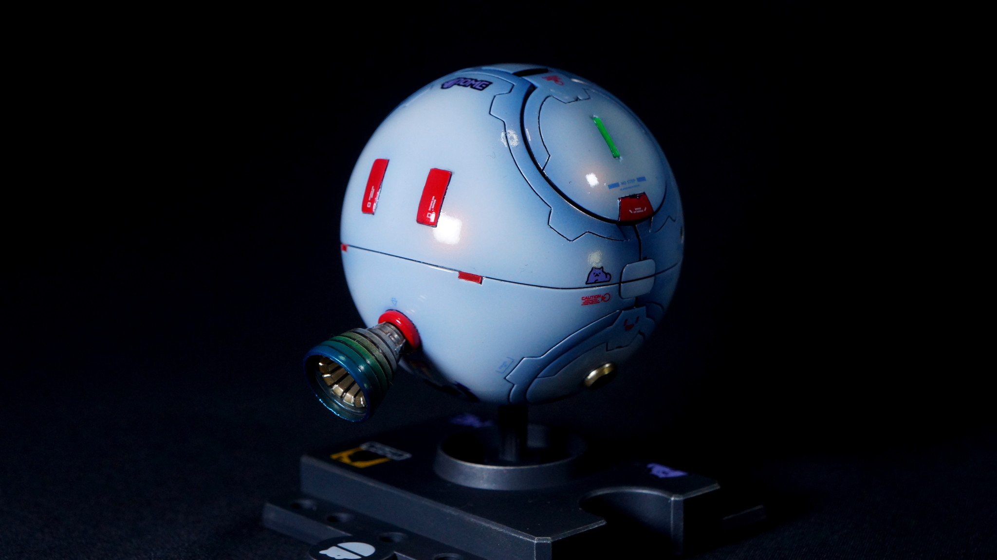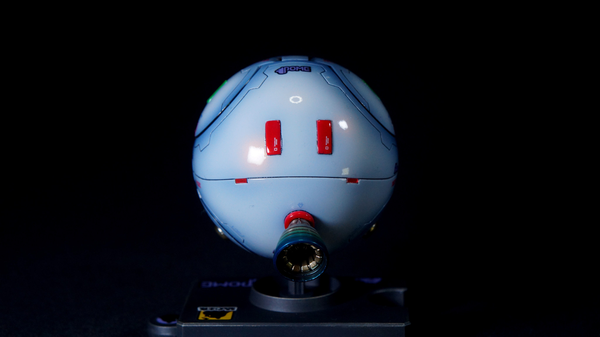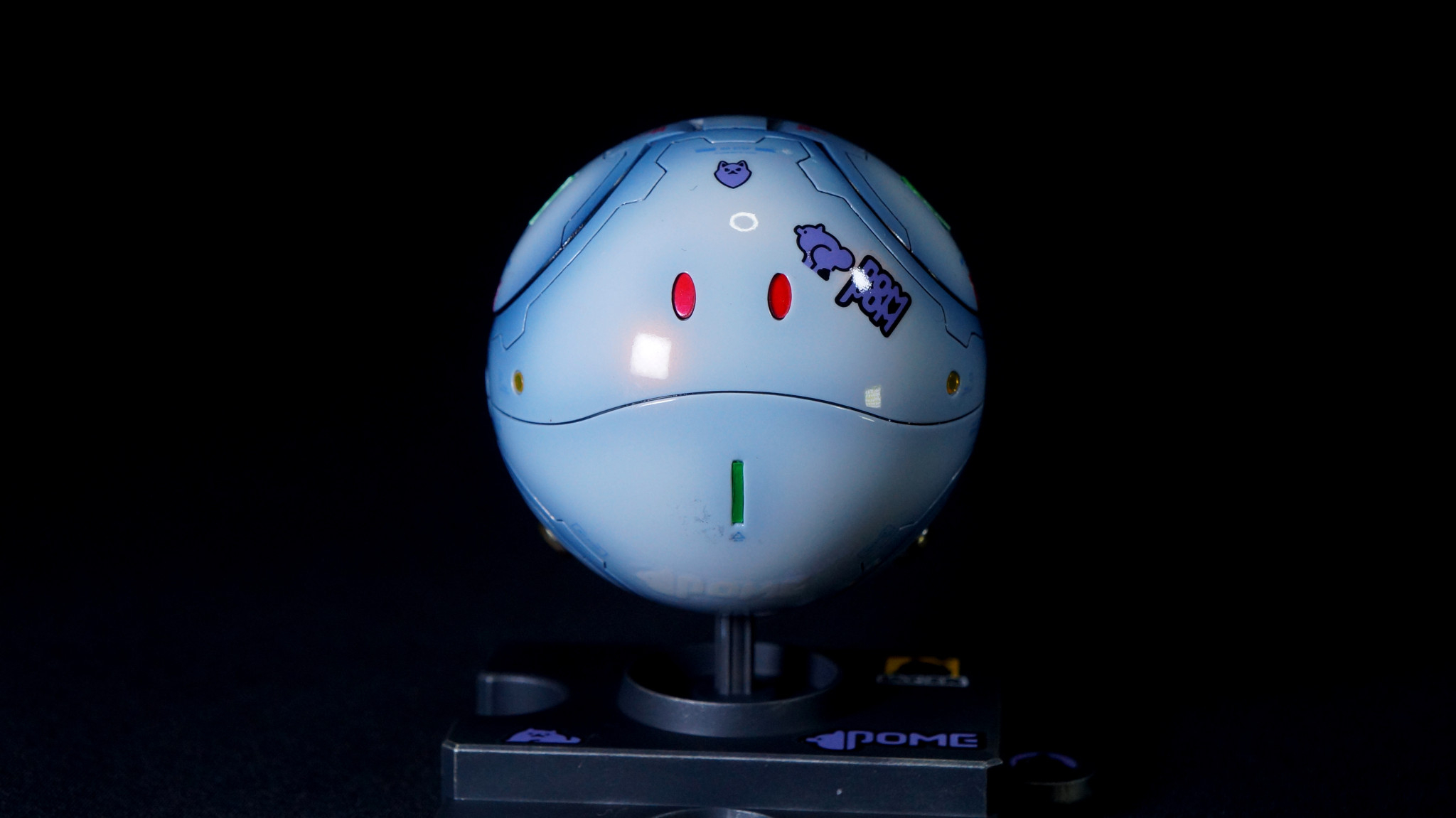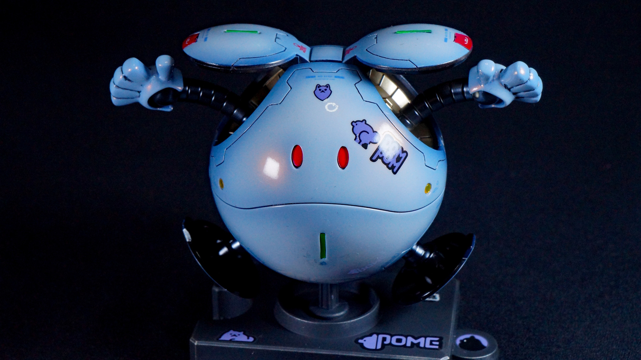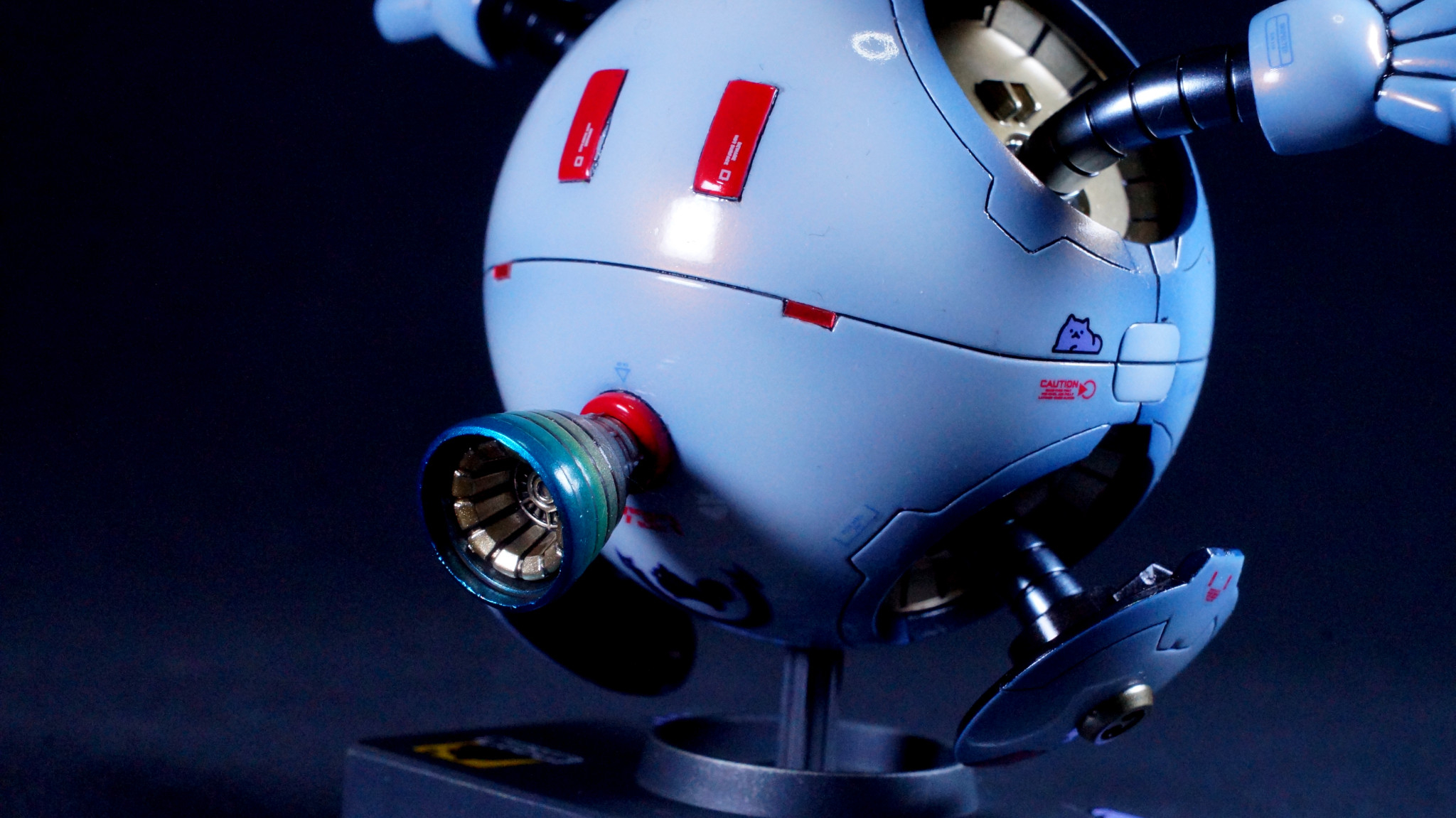 ポメラニアンズの白いハロをイメージして目を赤くし、GQuuuuuuXのガンダムデカールに付属している大量のポメラニアンズのデカールを消費するためにたくさん貼ってみました。台座にも貼っています。たぶん、ここで使わなかったら、この先使い道が…。(zaku-kao4)デカールを貼った後に光沢クリアでトップコートしています。