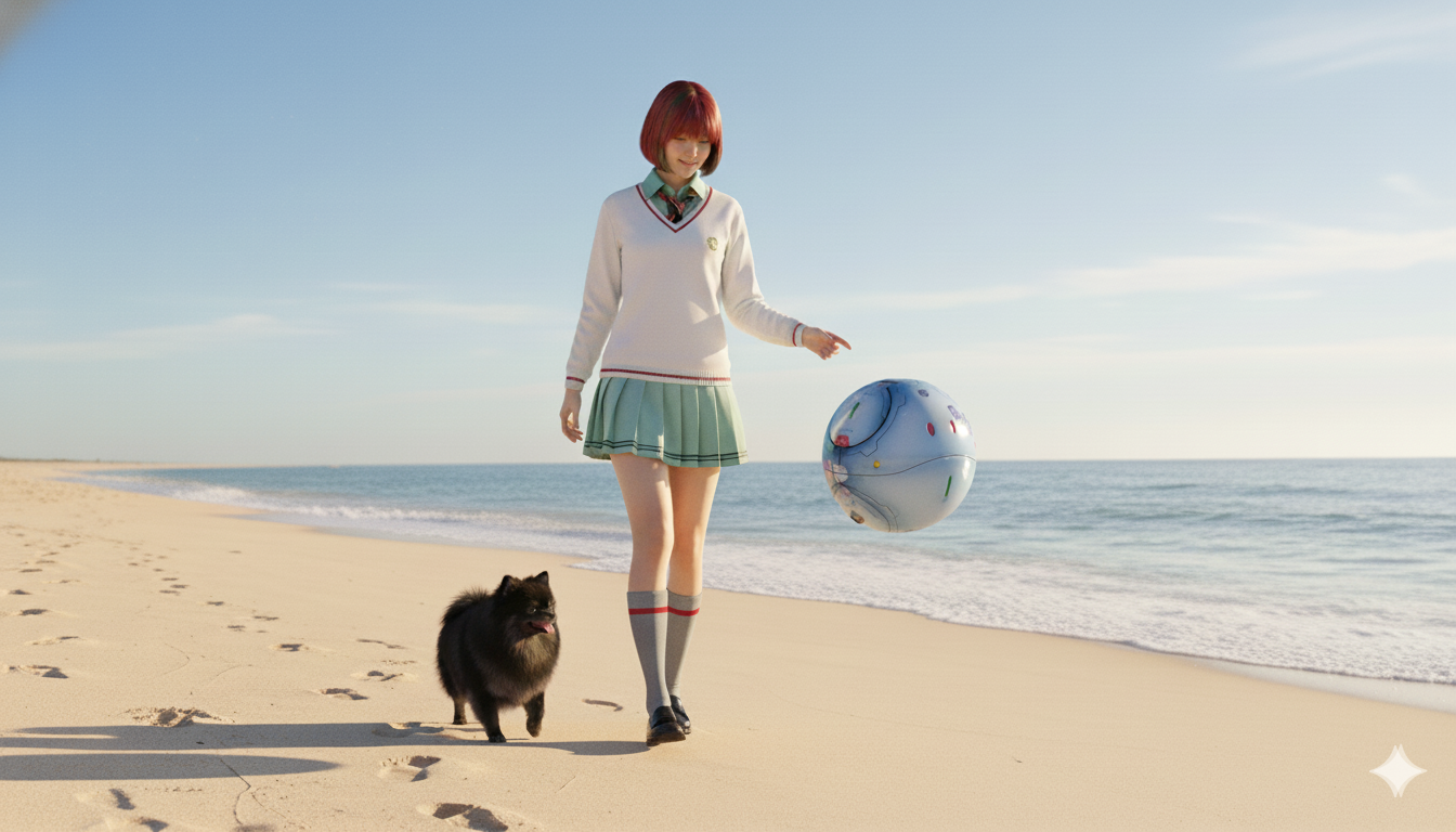 平和に地球の浜辺を散歩しているワンシーン。登場人物はすべてNano Bananaを使用した画像生成ツールで作成しています。マチュの特徴を入力してそれっぽい髪、服装の女性を作ってもらいました。顔には一切注文をつけていないので、特に似てはいません。(zaku-kao4)ポメラニアンは黒いポメラニアンを指示しただけになります。