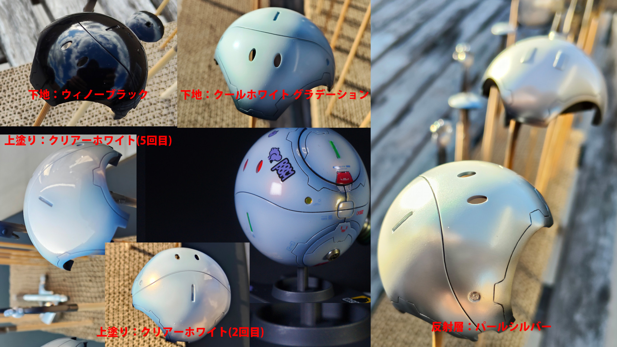 前述したような手順で塗装しております。繰り返しになりますが、今回の工夫点は下地の白グラデーションです。これによって、パールシルバーが白っぽく発色するようになり、白いキャンディ塗装ができました。(zaku-kao2)