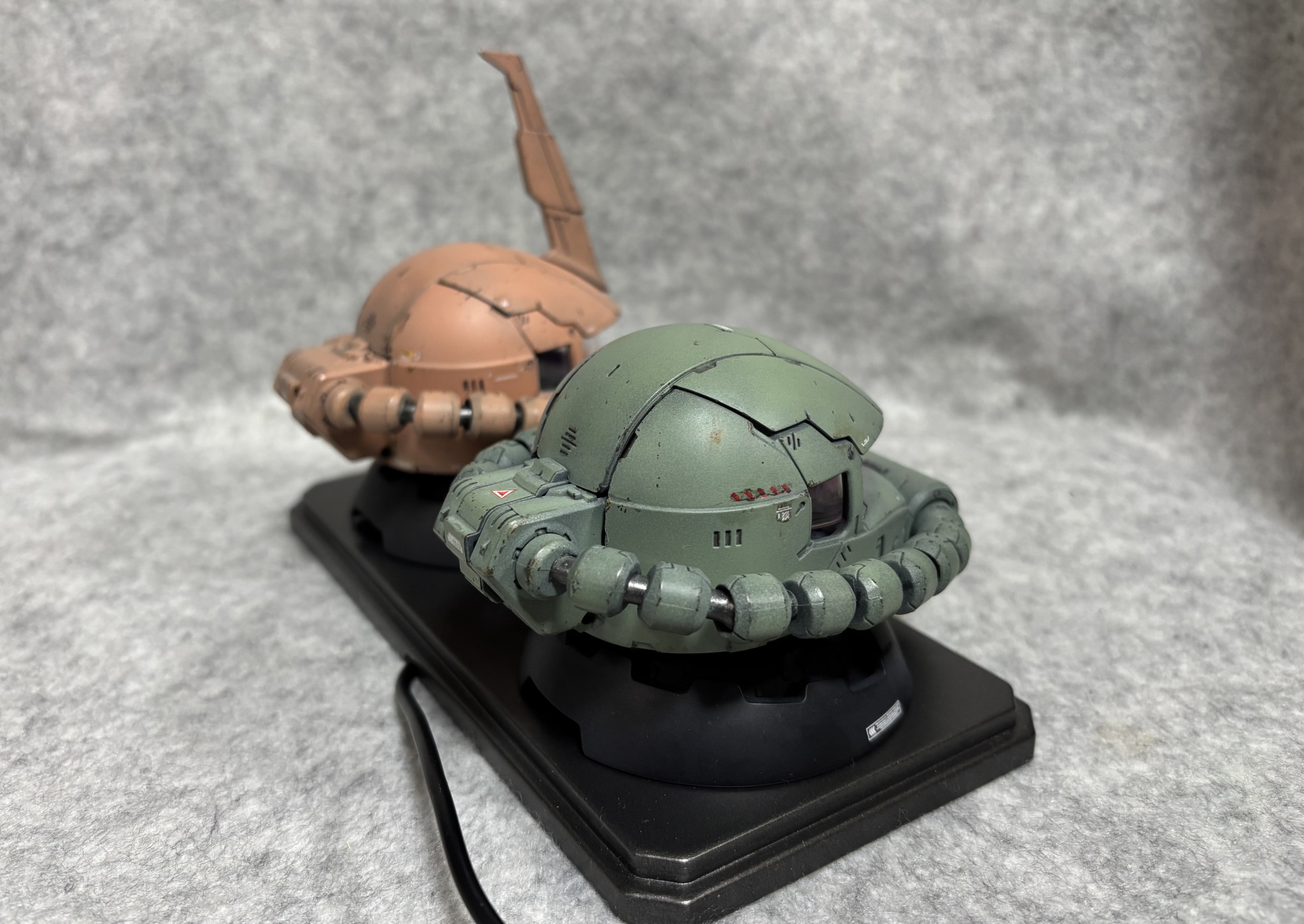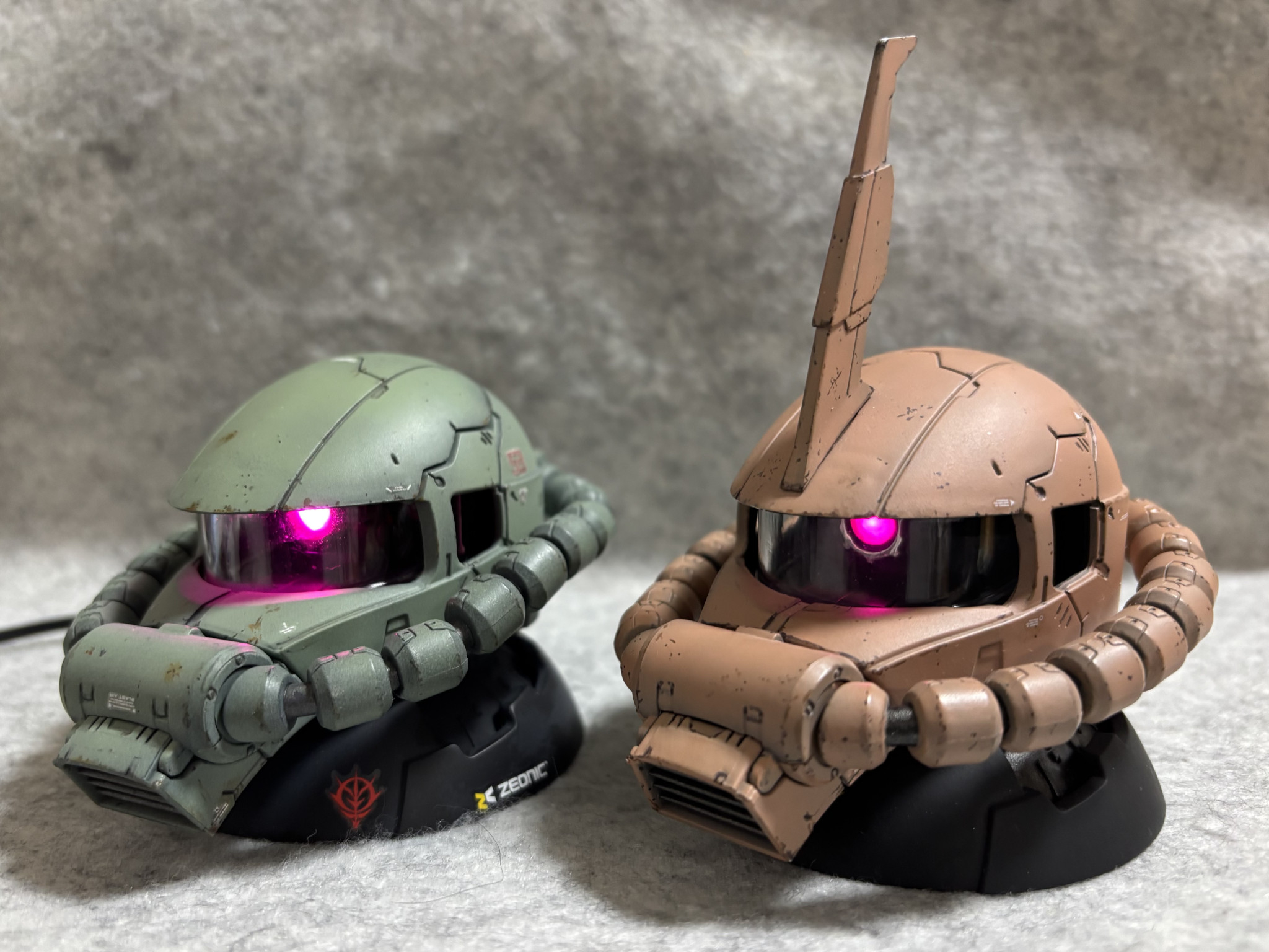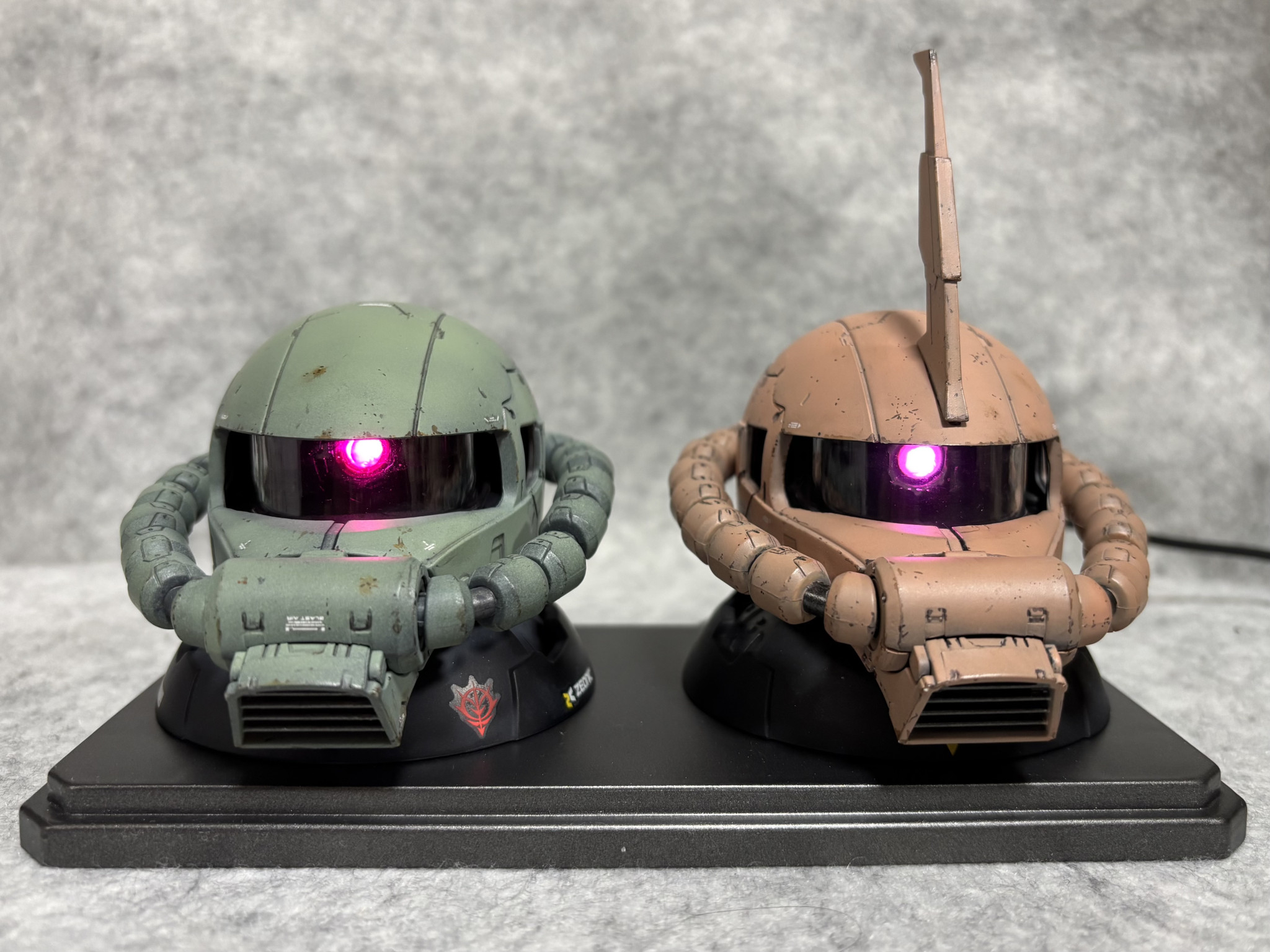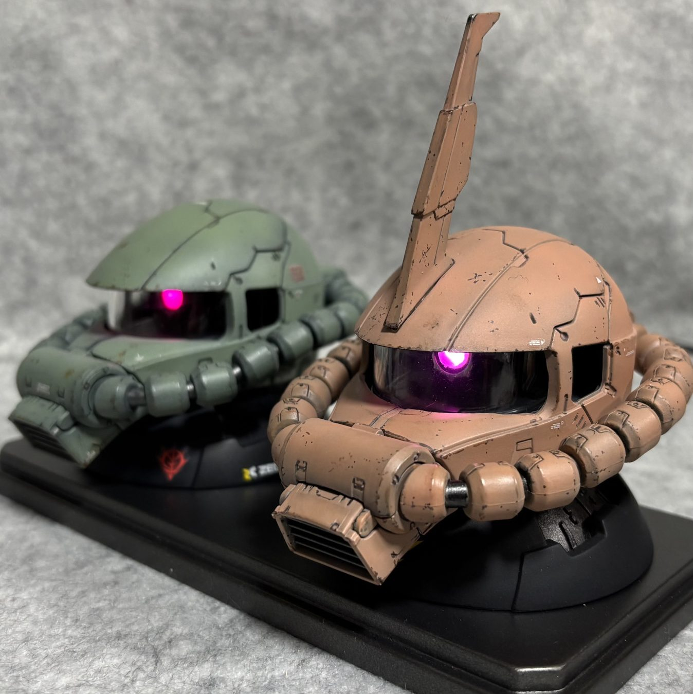 ガシャポンのザクヘッドのモノアイをぐぽ〜んと発光させ✨2つ並べてディスプレイしました🥰