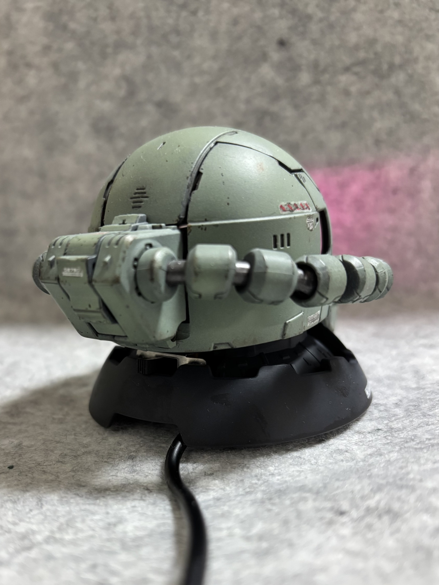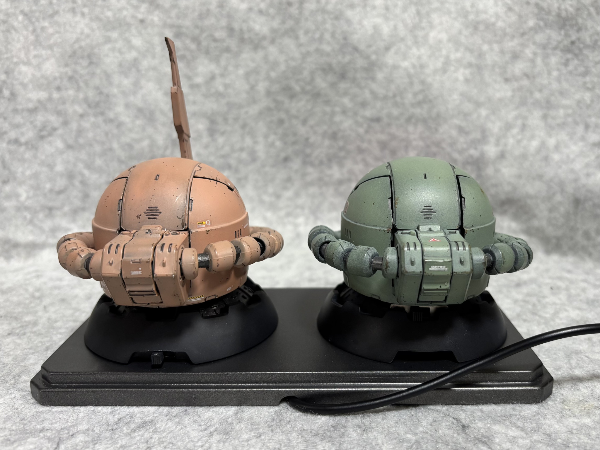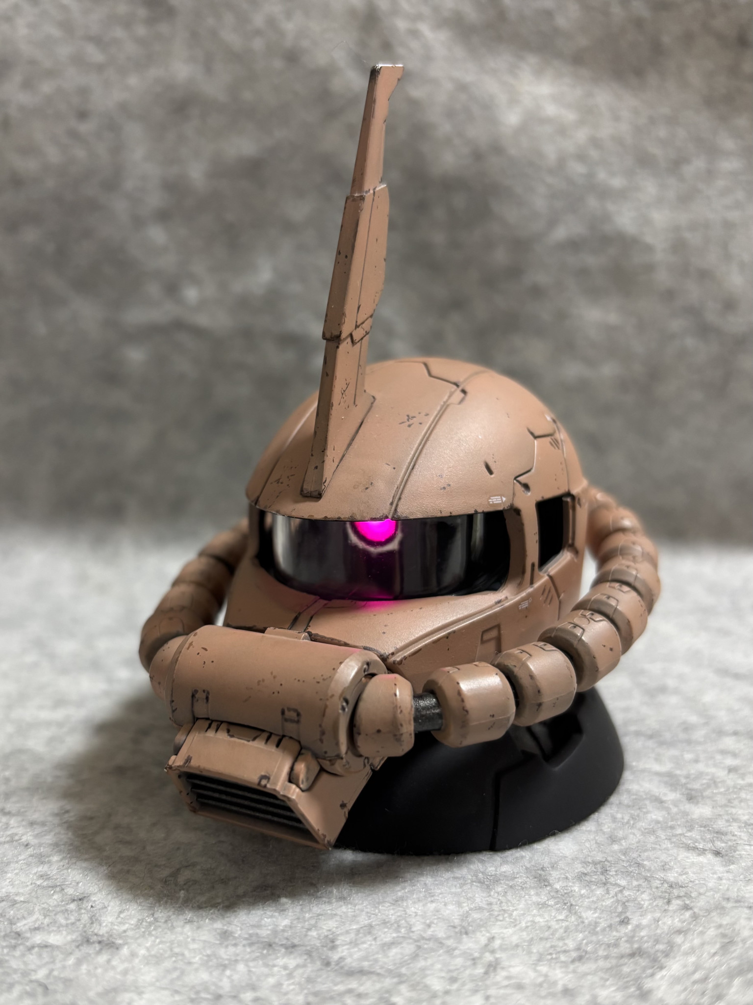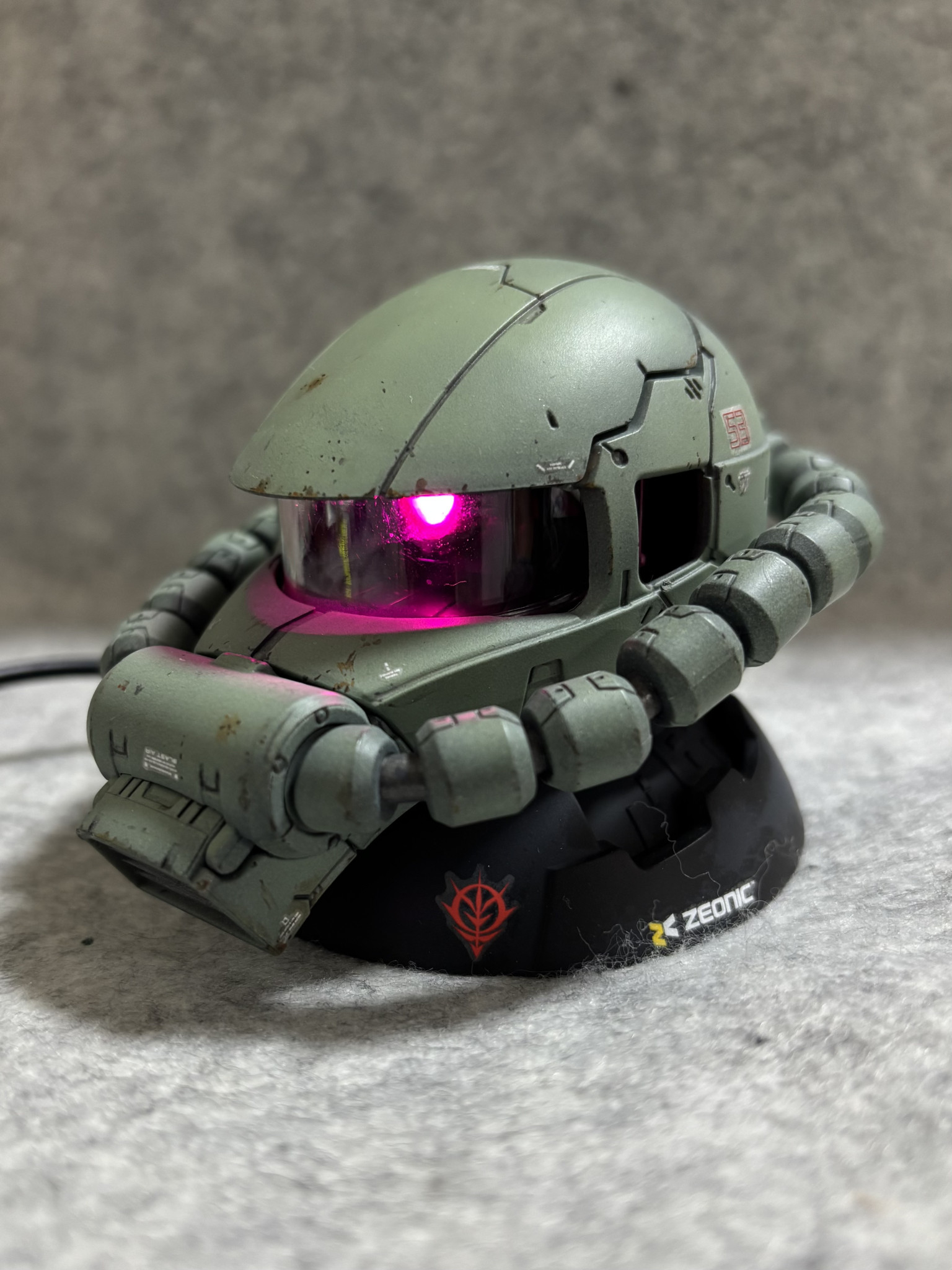 ガシャポンのザクヘッドのモノアイをぐぽ〜んと発光させ✨2つ並べてディスプレイしました🥰
