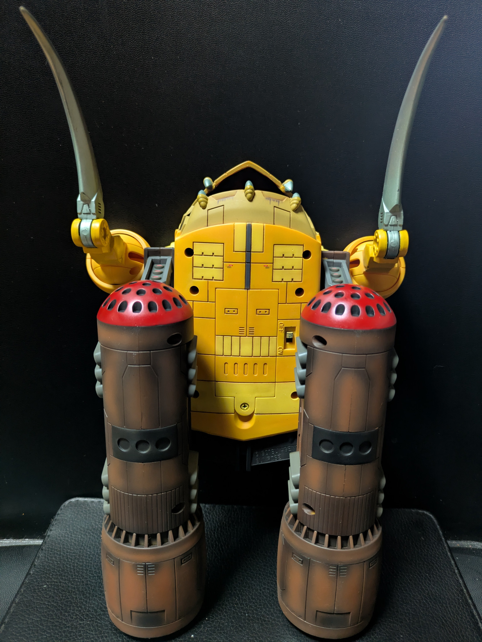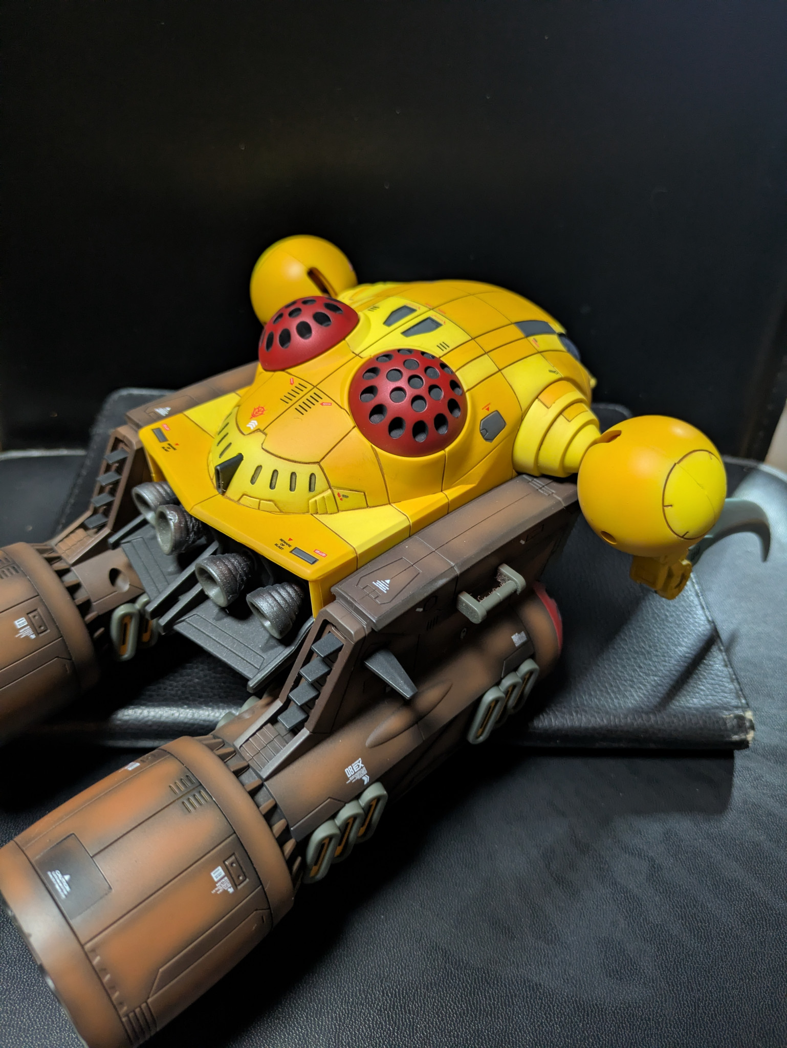 ちょっとオーバーディティールのパネルラインを敢えて逆手に取って塗り分けました。下部のブースター部も本体と殆ど変わらないイエローのため、ブラウンを基調としたアニメ設定カラーに変更しました。