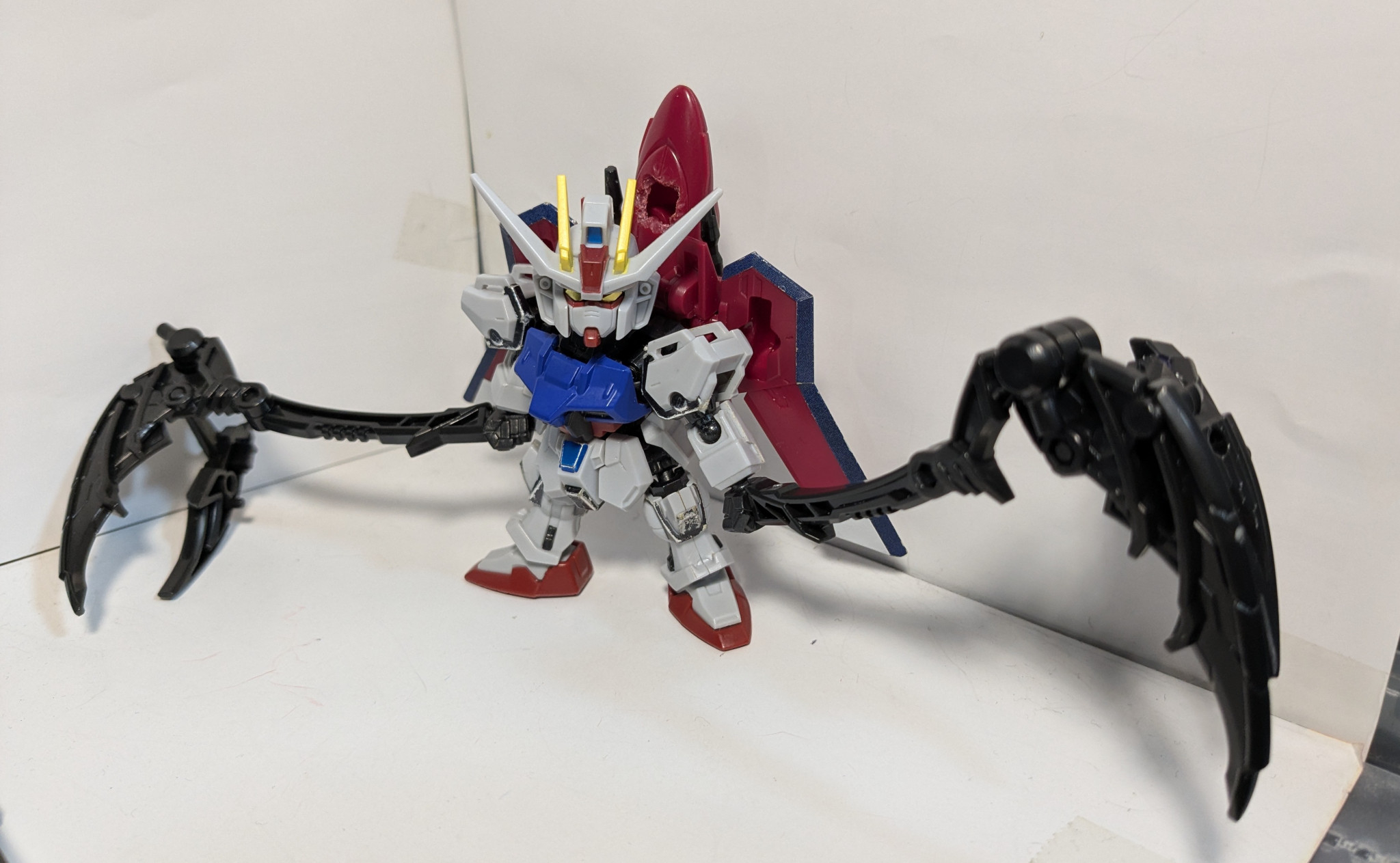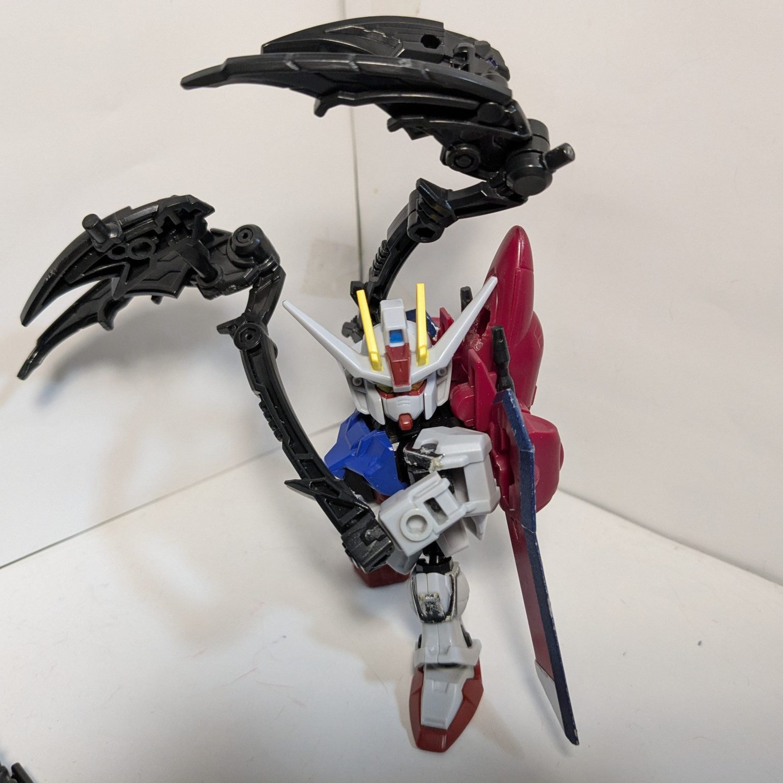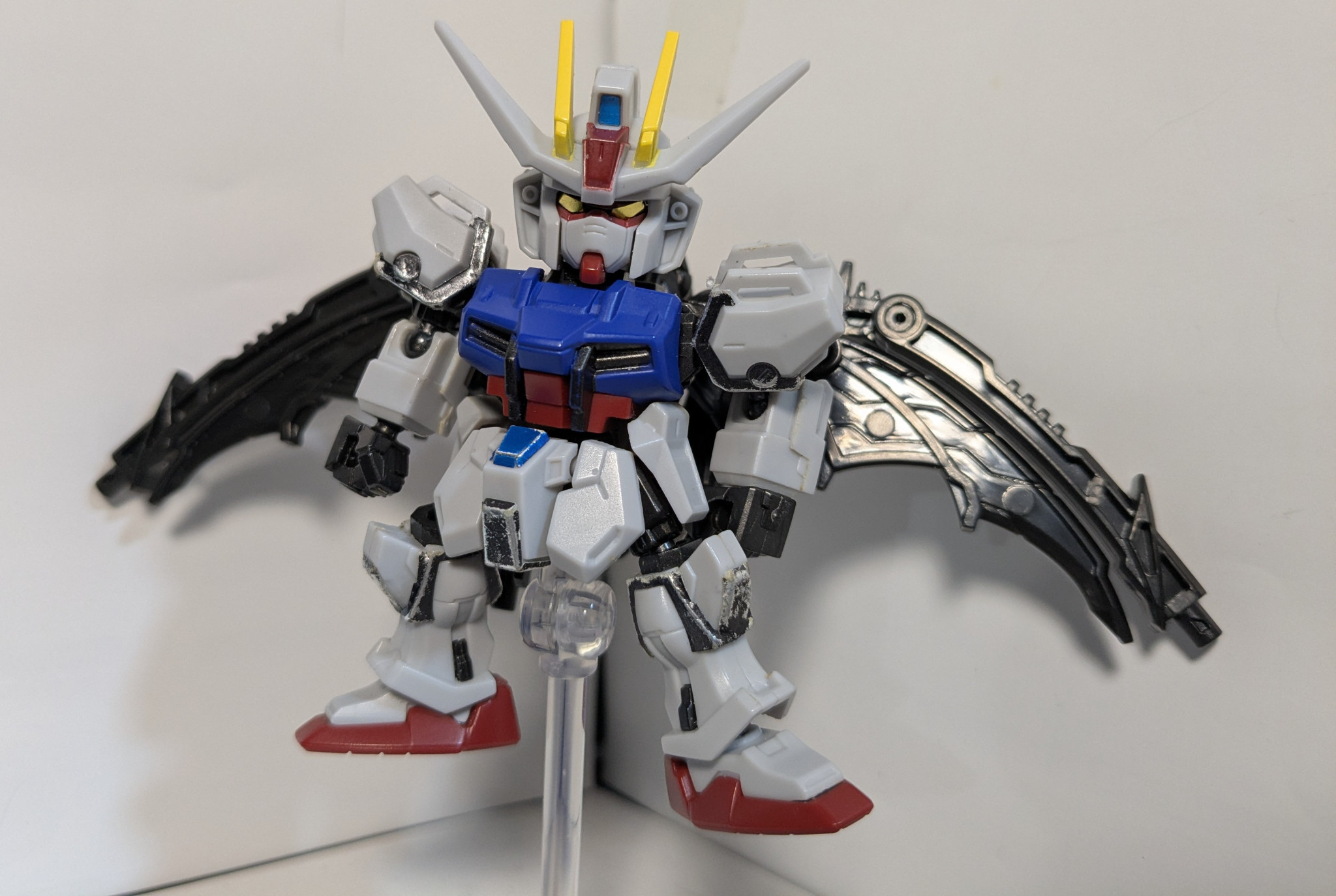 ガチャのカプセルガーディアンとMJを組み合わせてみました。機体コンセプトはレイダー、カラミティ、フォビドゥンをストライカーパックとして運用かつ自律型AIにより各環境に適したサポートメカが合体するという風に考えました。