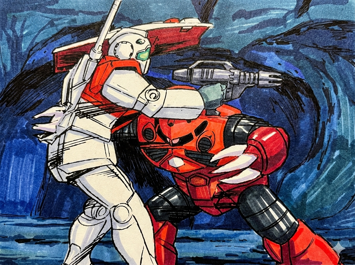 これ見て思ったんよねー。「ん?こうはならんやろ!?ジムの装甲って紙なん?」って…「お腹を貫くなら…やっぱフルパワーでいかんと無理なんちゃう??」って…。