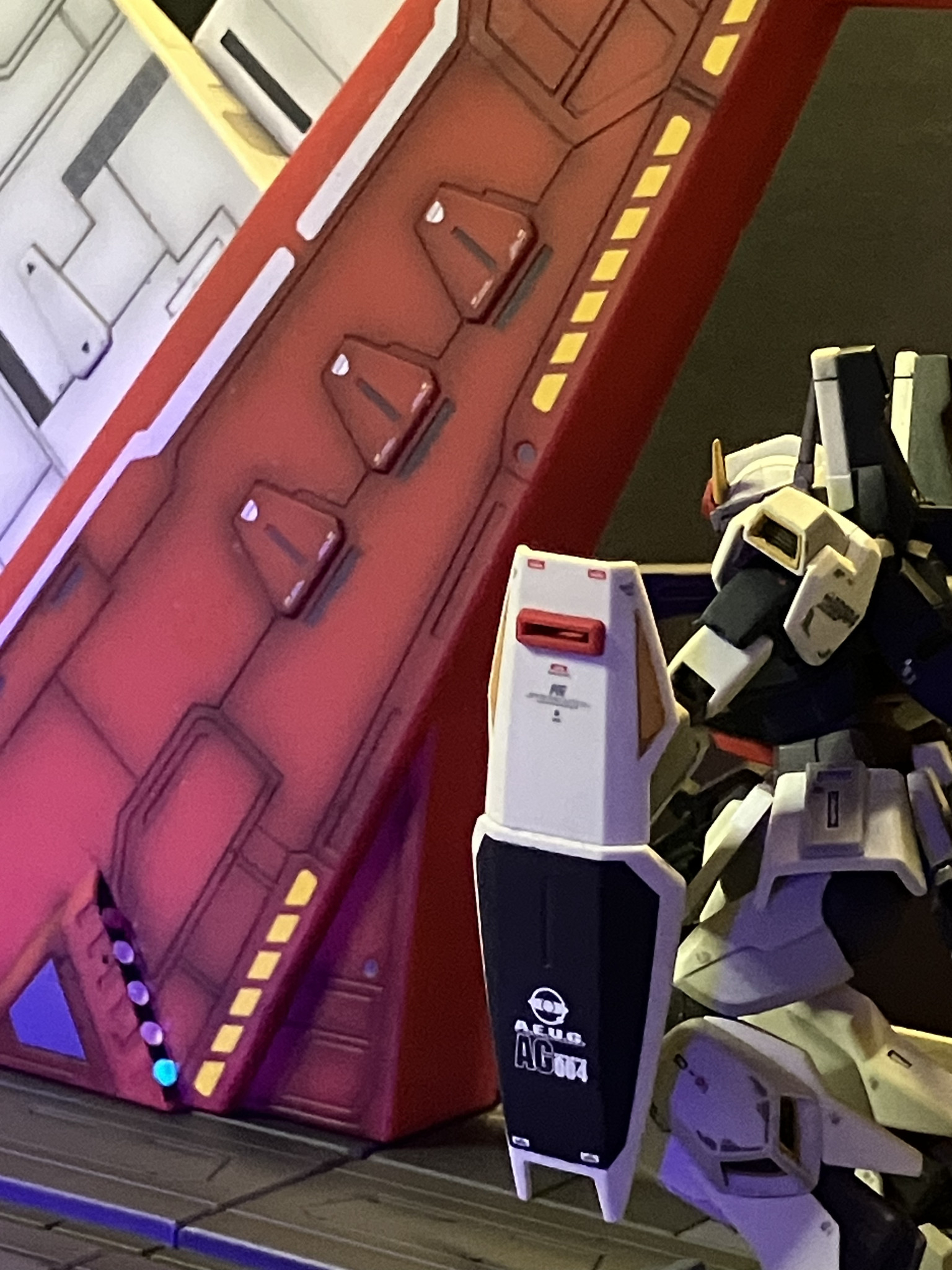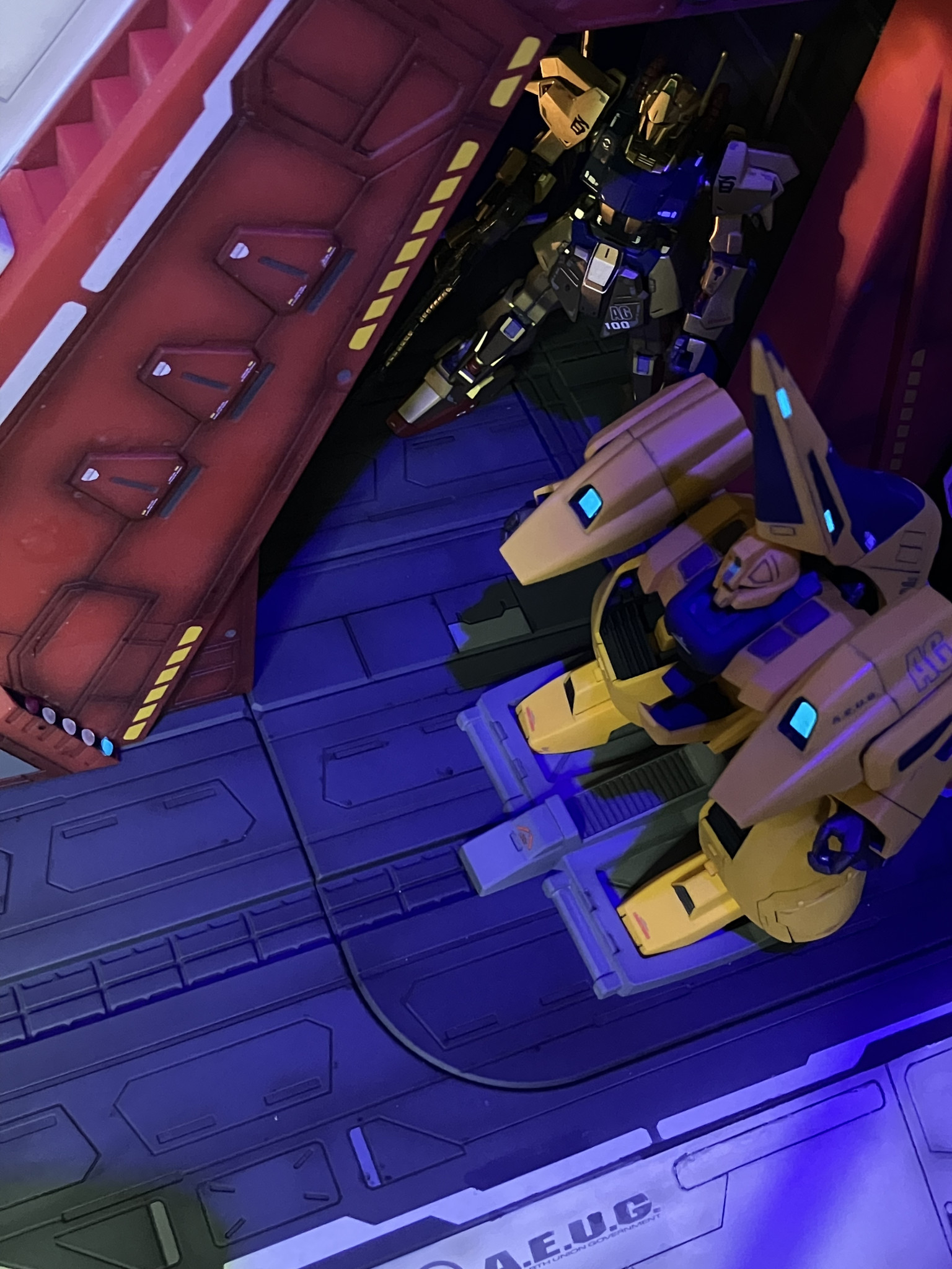 HGUC メタス まっすぐ立つと背中のとんがりがゲートの軒に当たります。しゃがむとカワイイ