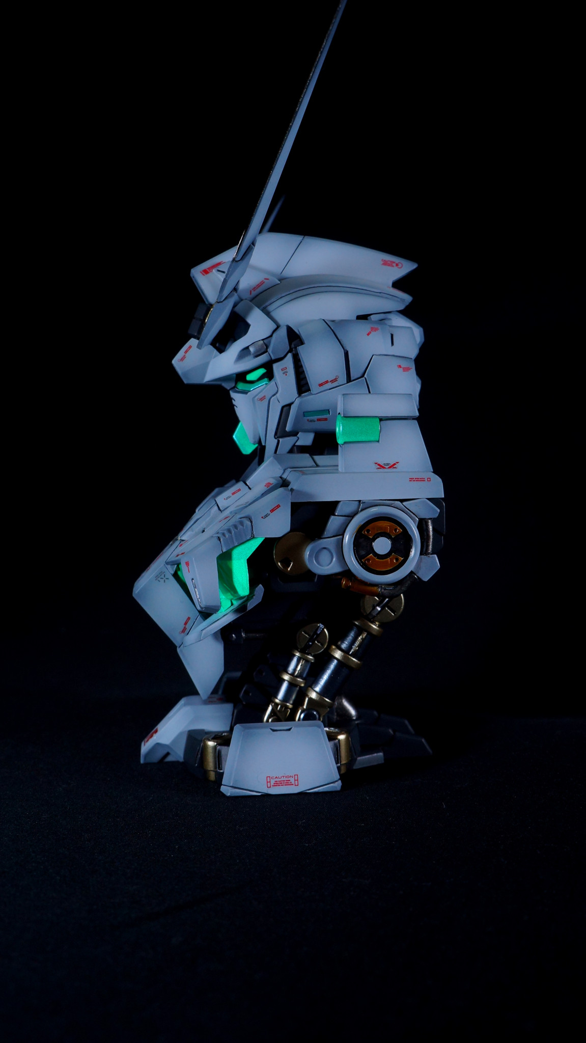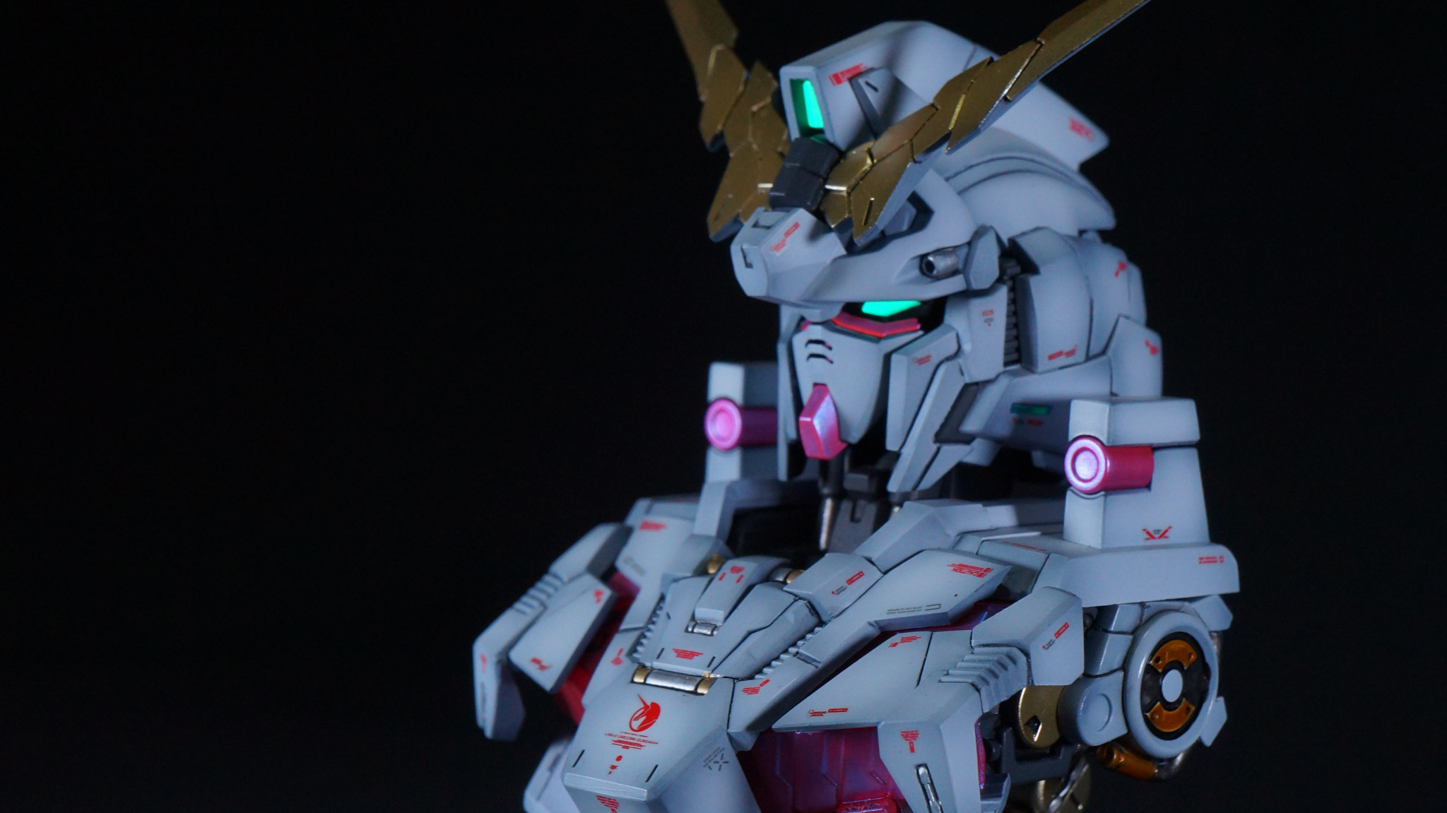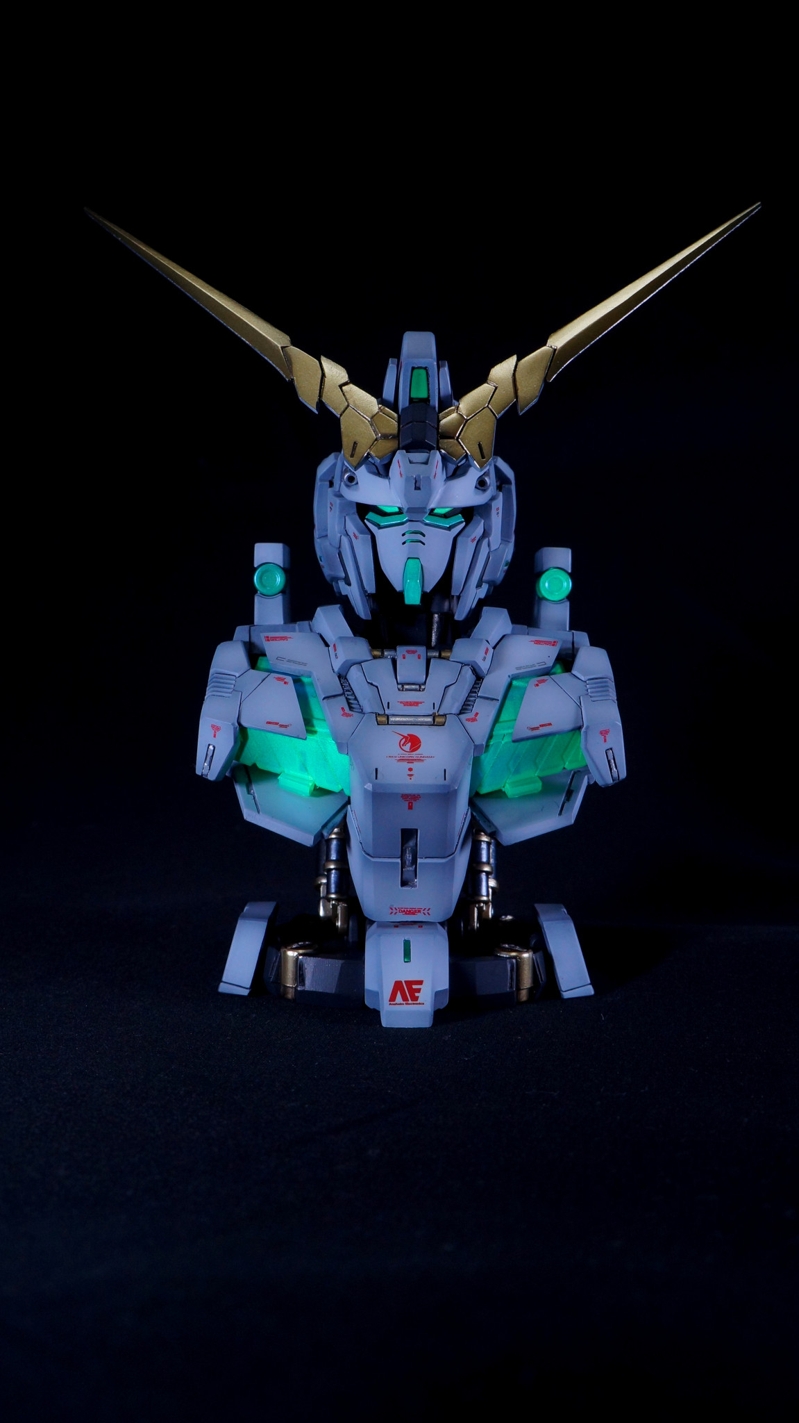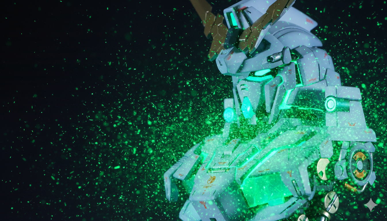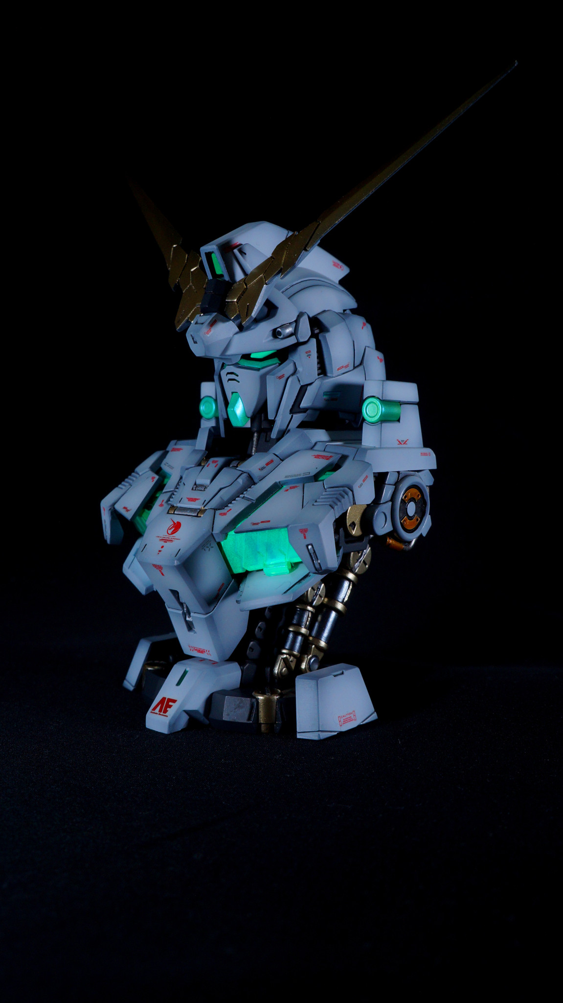 昨年末のユニコーンモードに続いて、MSメカニカルバストDX ユニコーンガンダム デストロイモードを全塗装、ディテールアップ、艶消し仕上げで作成しました。サイコフレームは最終決戦時の緑色にしております。ユニコーンモードは外装に付属しているフレームを使用していましたが、こちらは別売りの内部フレームを使用していますので、幾分情報量がアップしております。