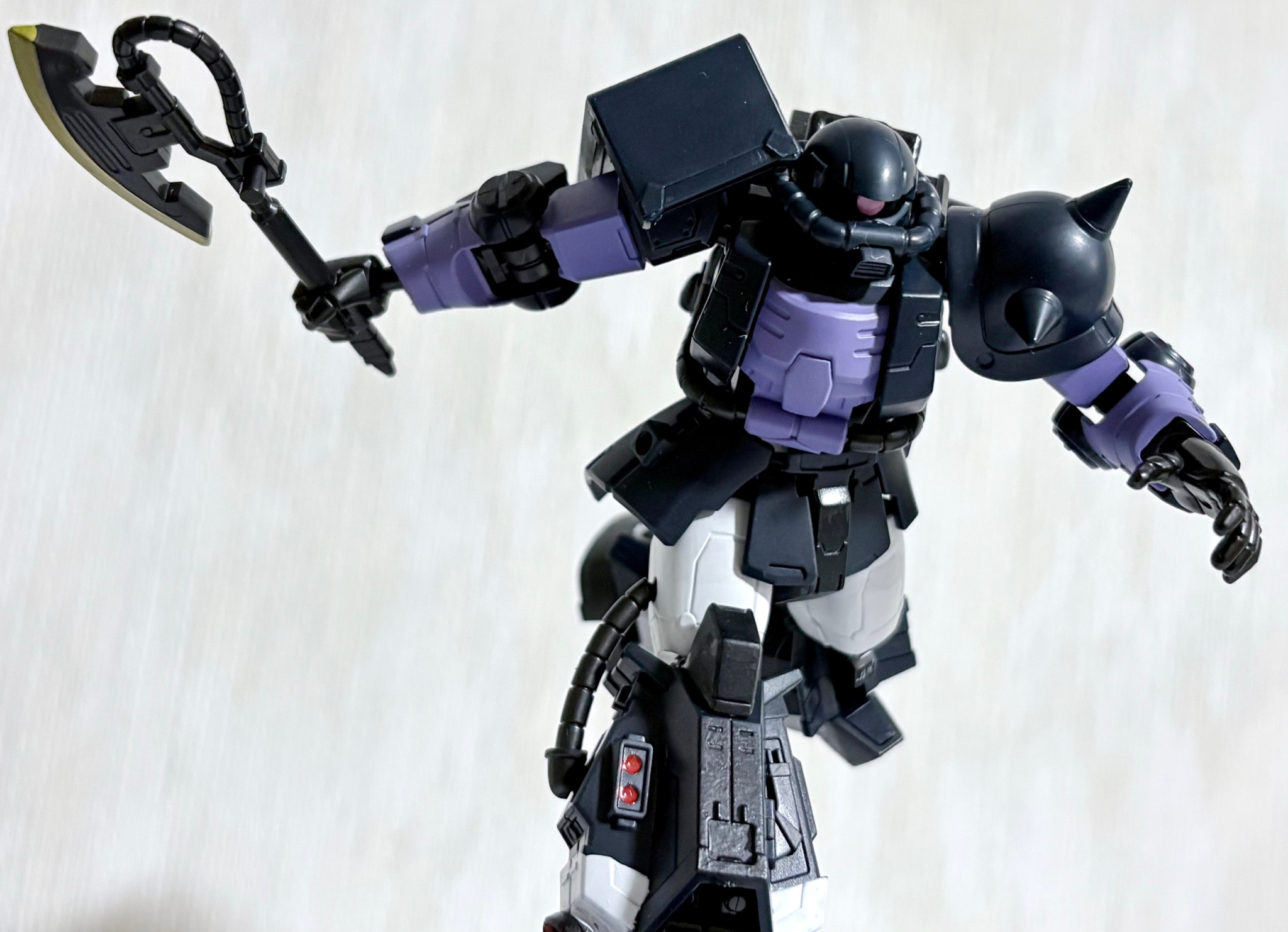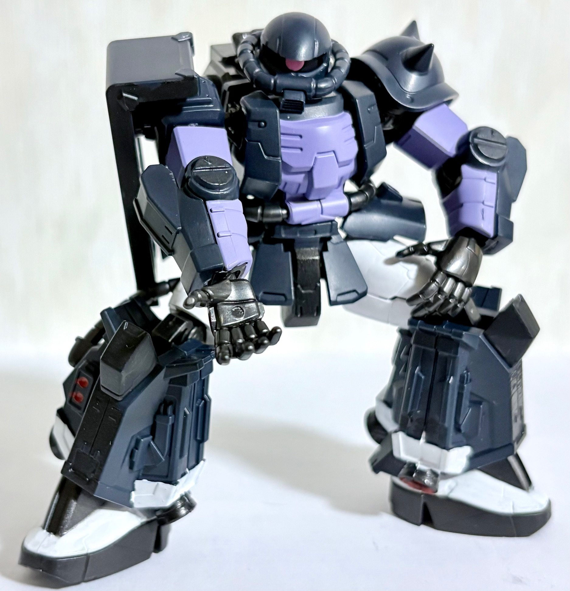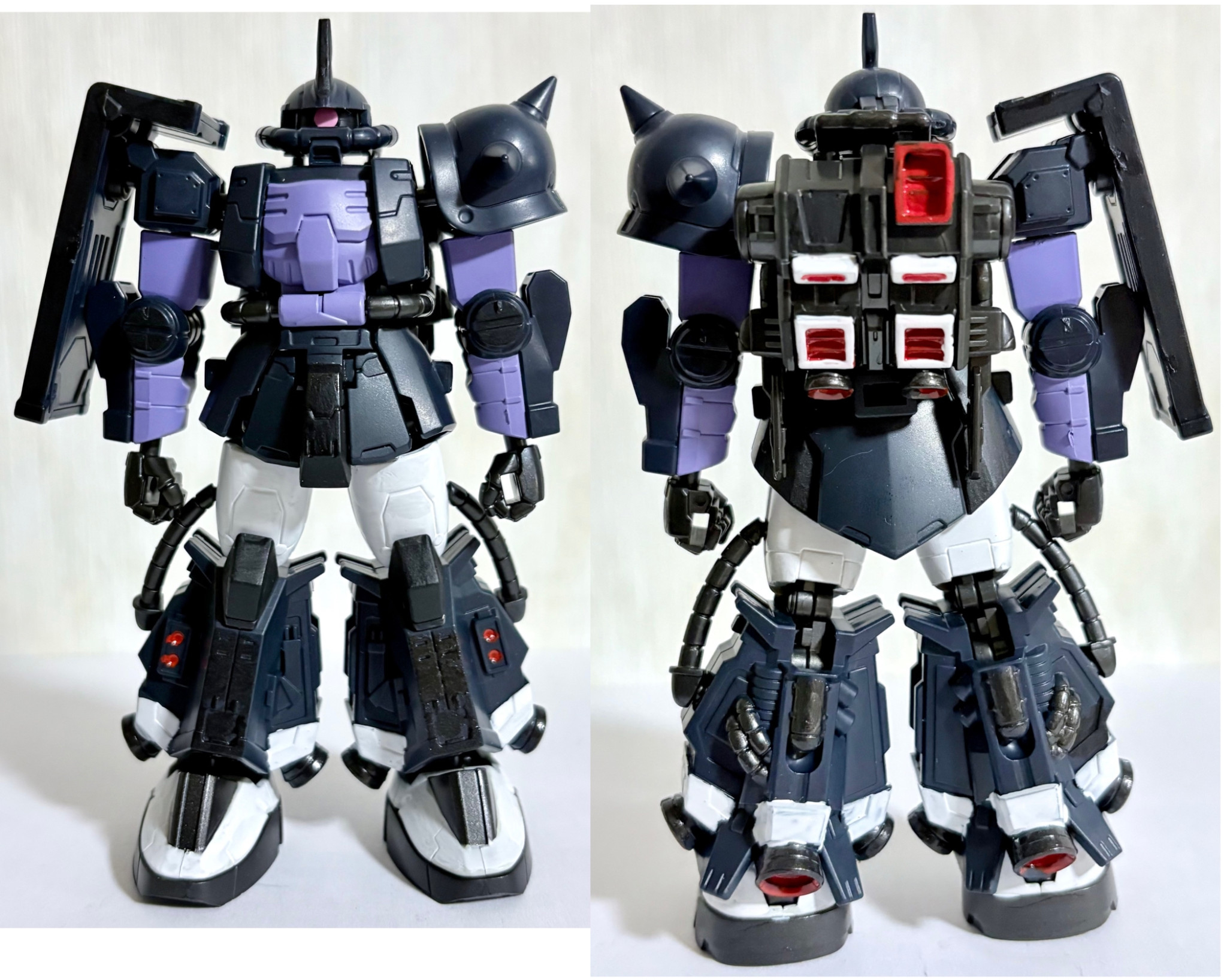 当初はノーマルザクと同じカラーリングで塗装しようと思ったが、没個性化するのでボツにしたのと黒い三連星専用機の渋い色合いにヤラれたので、部分塗装で済ませた。