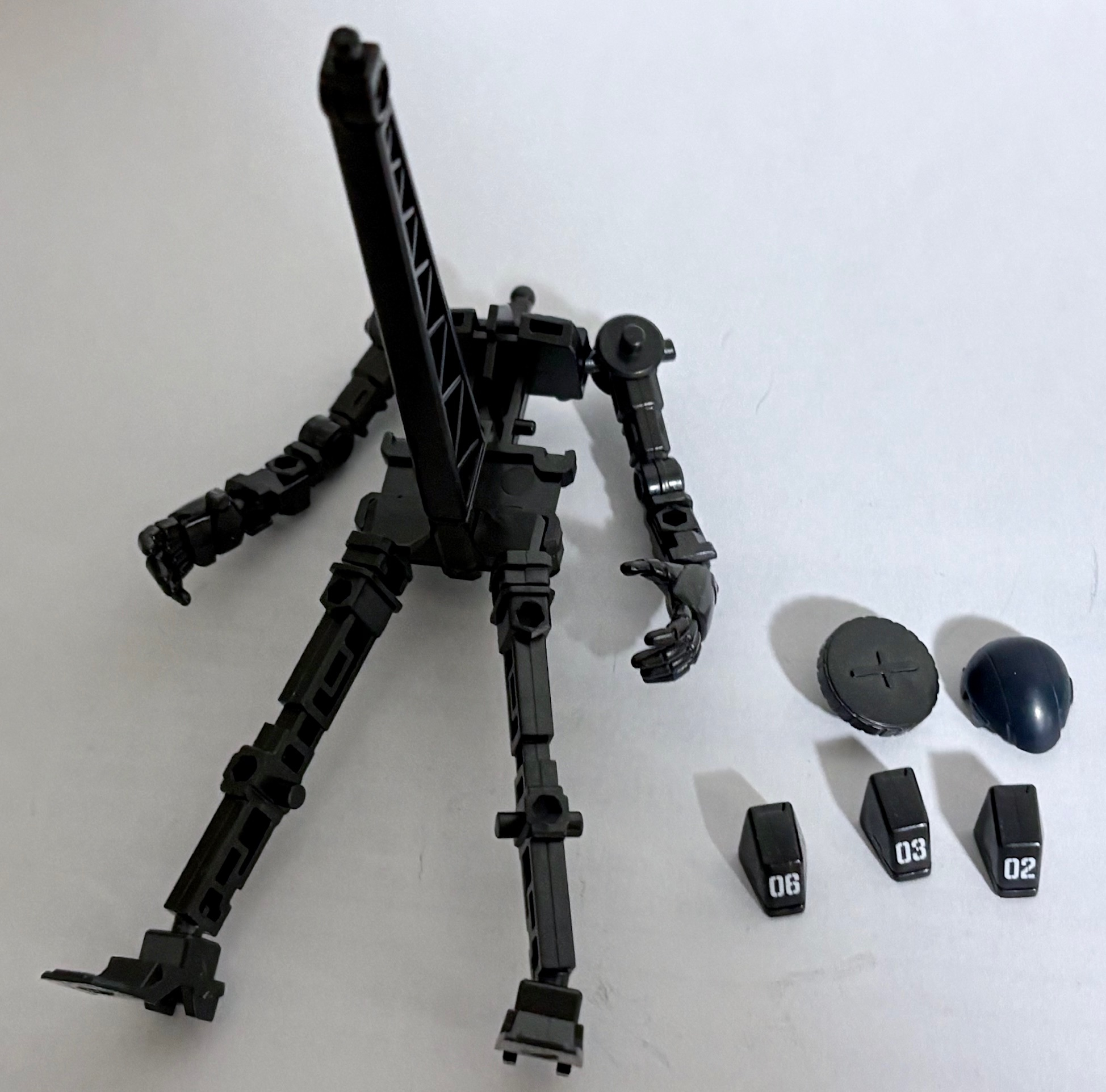 フレームスタンドとザクマシンガンのマガジン、通常のザク頭、ガイア、マッシュ、オルテガそれぞれのナンバーが付いた膝パーツも付属する。