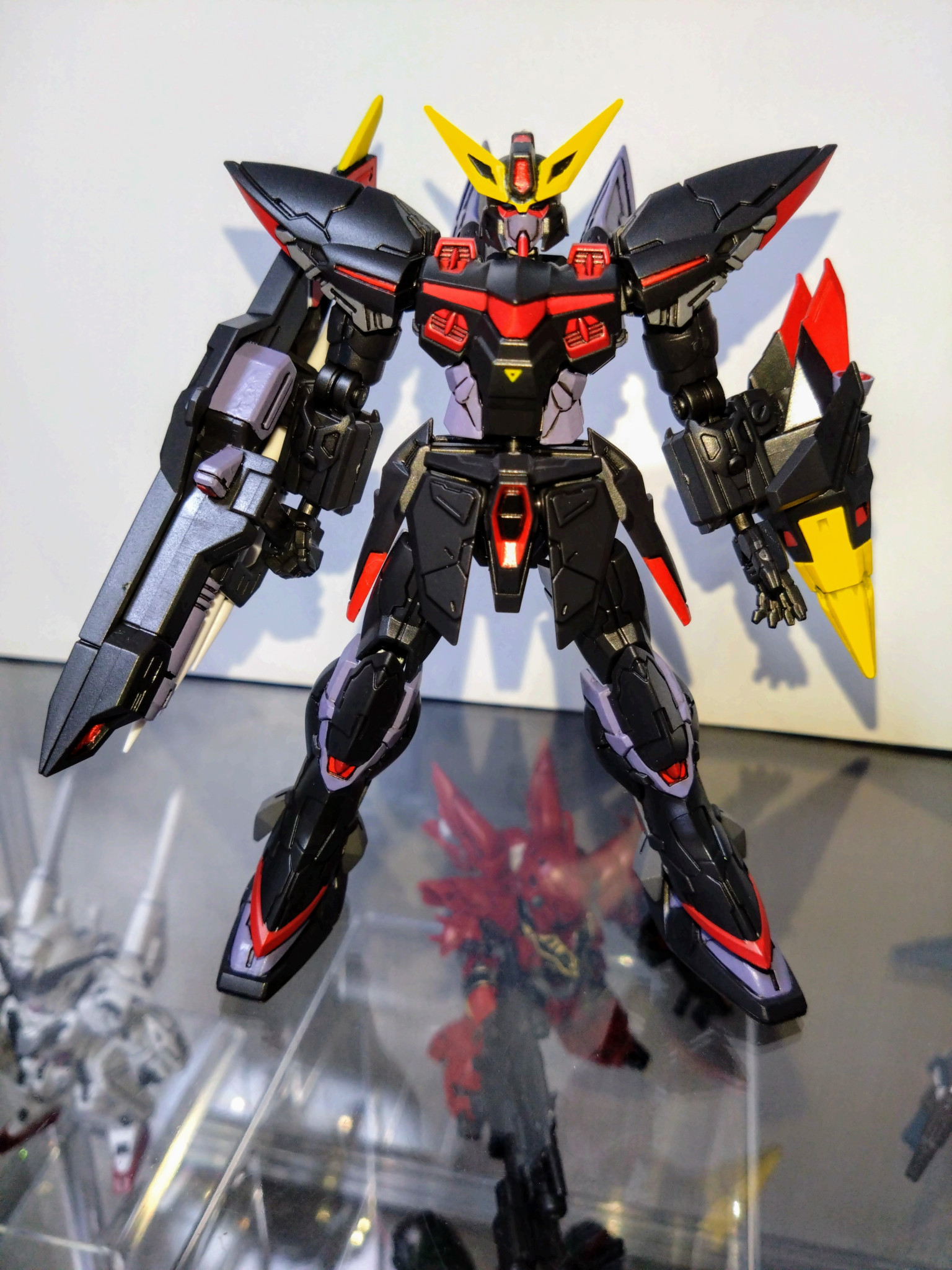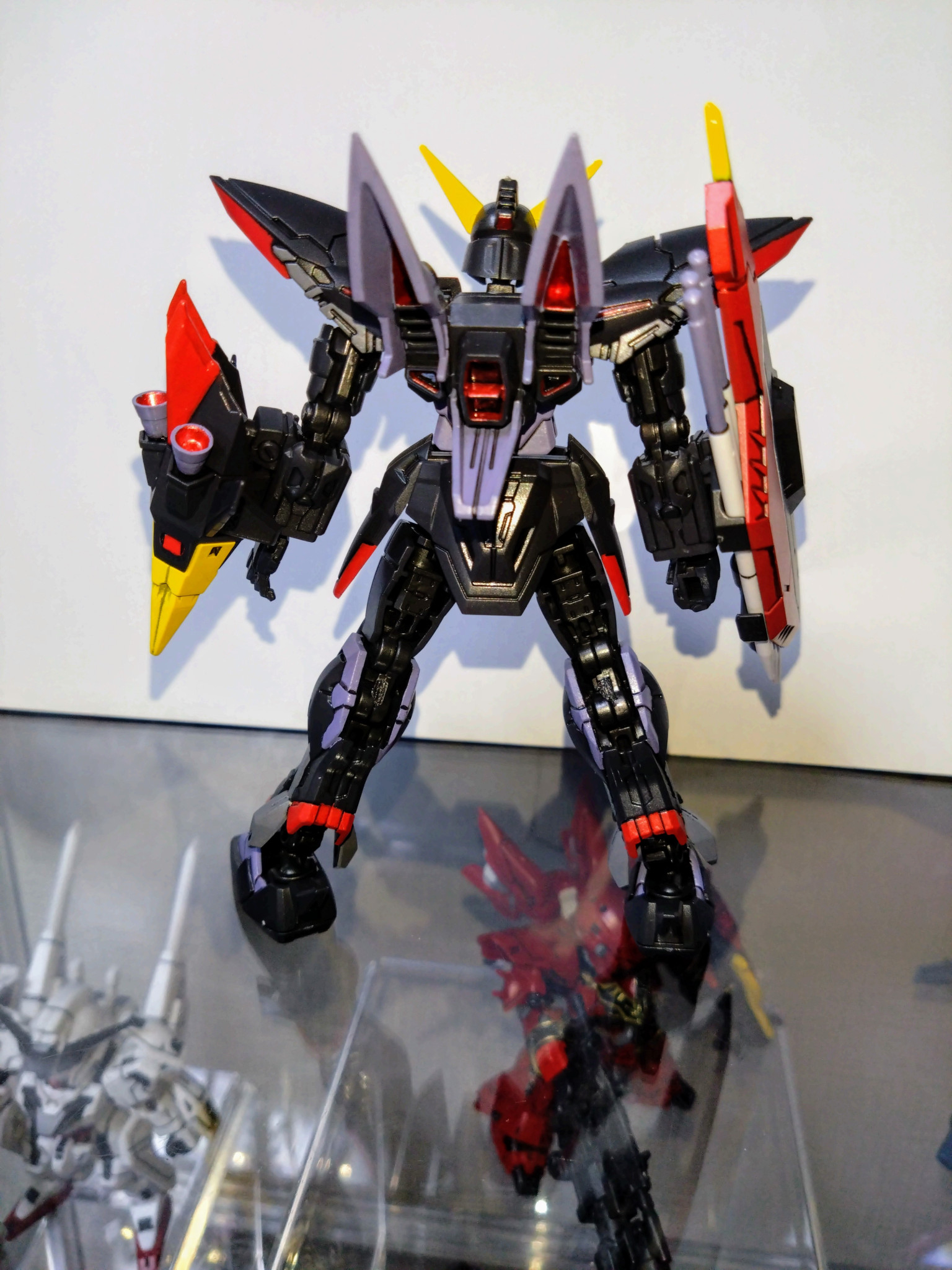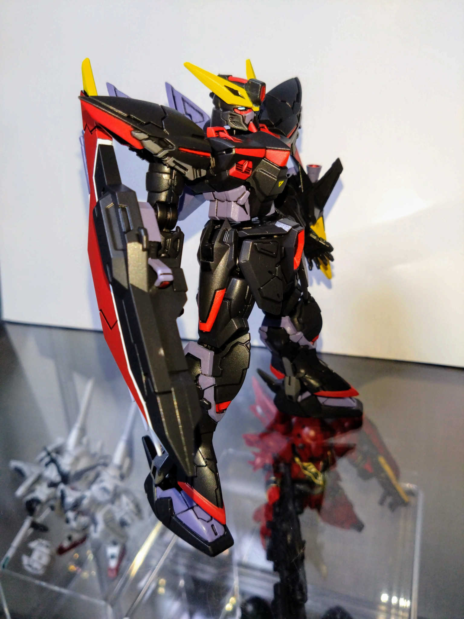 水性ホビーカラーはソードインパルスレッド、マイティーストライクフリーダムダークブルー、ガンダムエアリアルグレー、ミカエリスパープル、メタリックブラック、イエロー、赤鉄色等を使用しました。