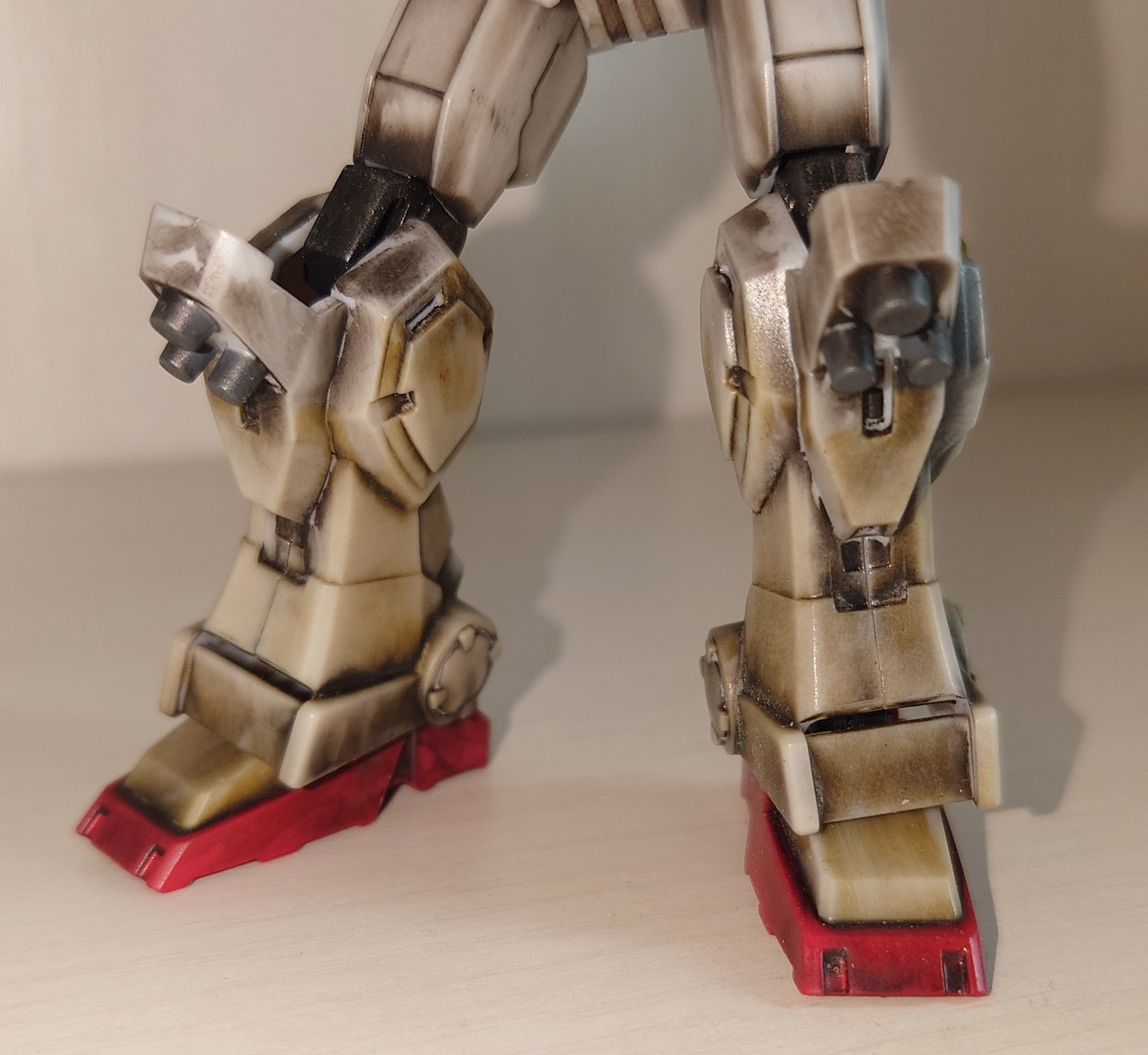 08小隊はジャングル戦が多いので、陸ガンの脚にはグレー・イエロー・ブラウンを重ねて汚してます グレーだけで汚した大腿部と比較するとわかりやすいかな?