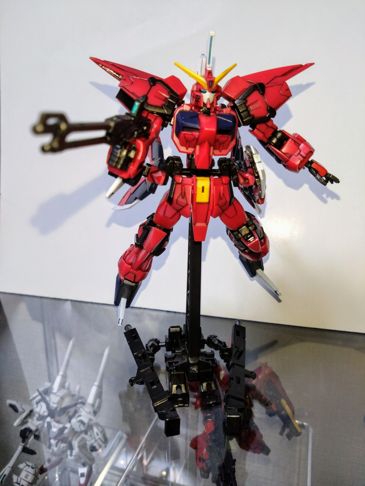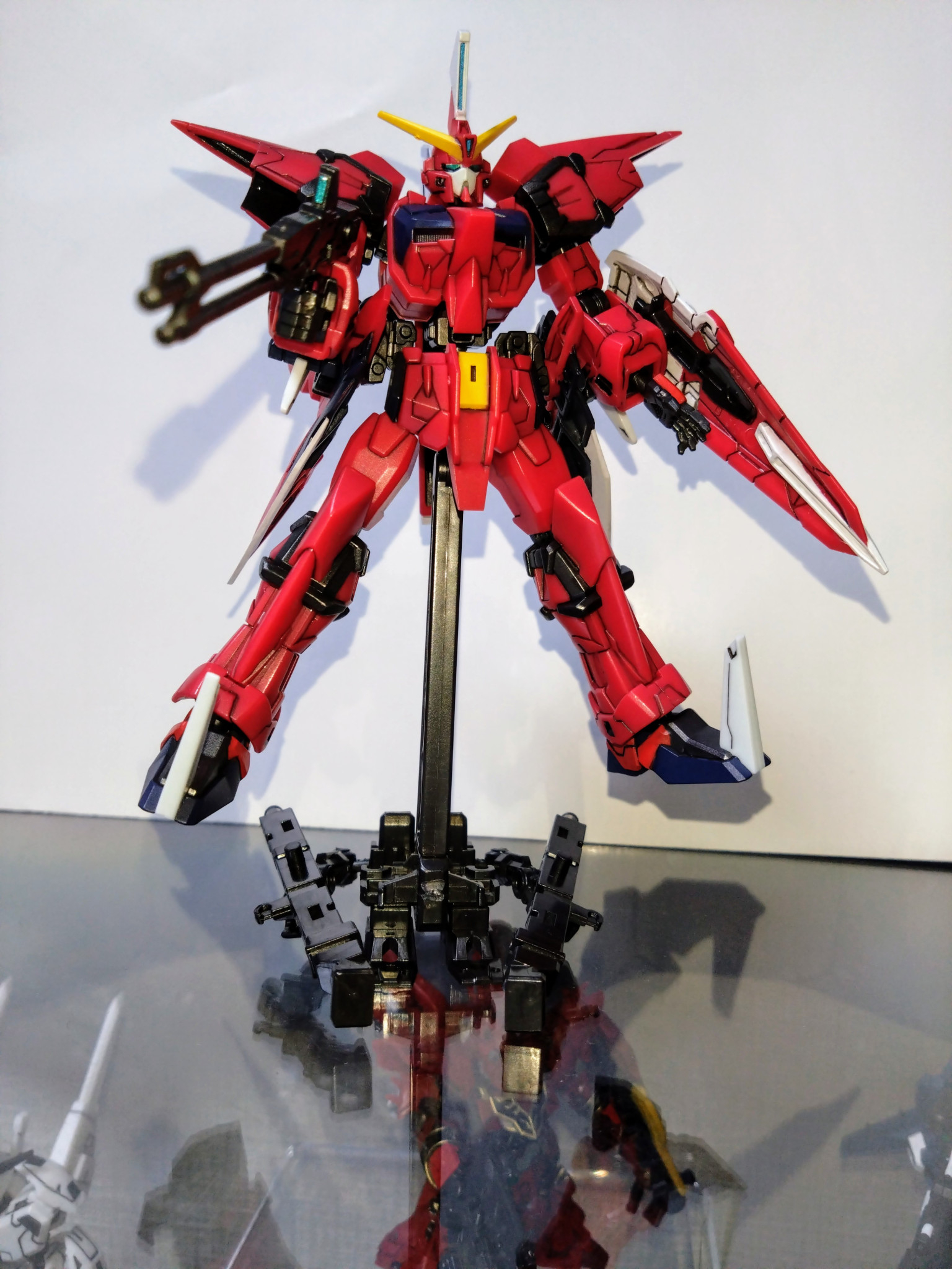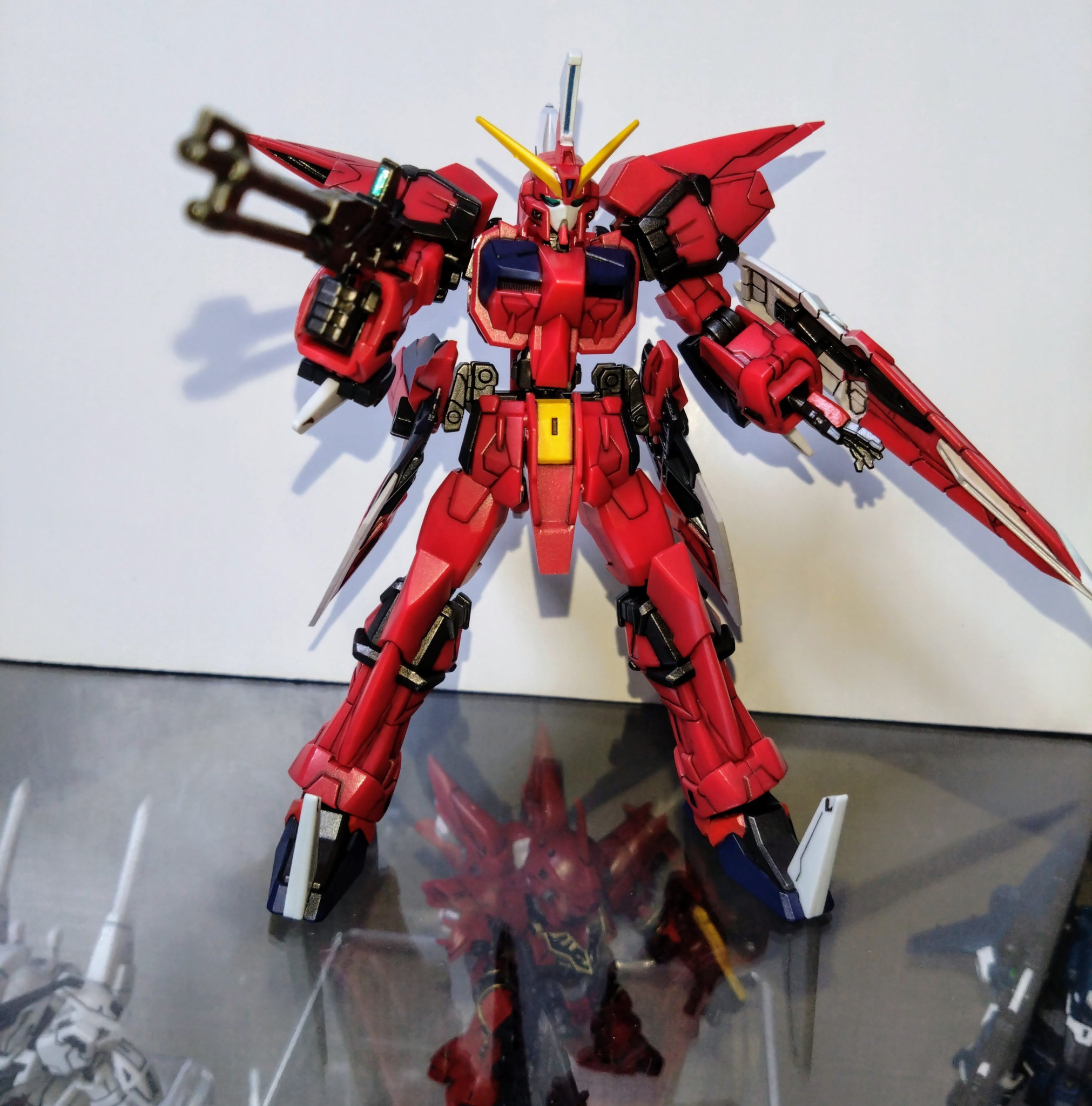水性ホビーカラーはガンダムホワイト、ガンダムレッド、ガンダムイエロー、マイティーストライクフリーダムダークブルー、メタリックブラック、青竹色、黒鉄色、焼鉄色等を使用しました。