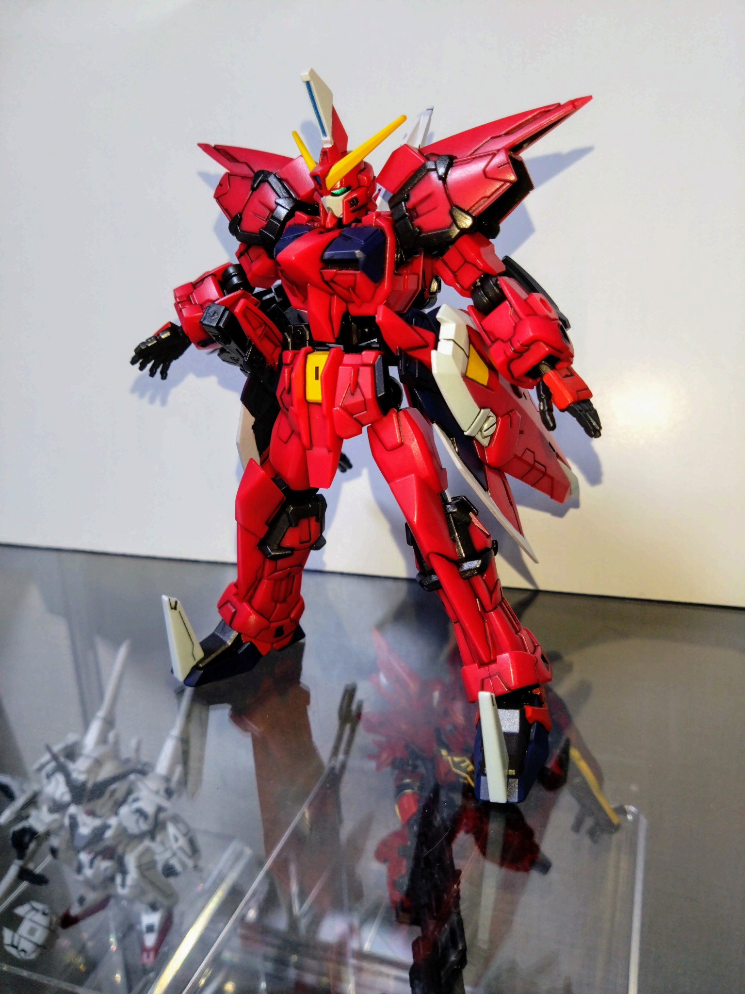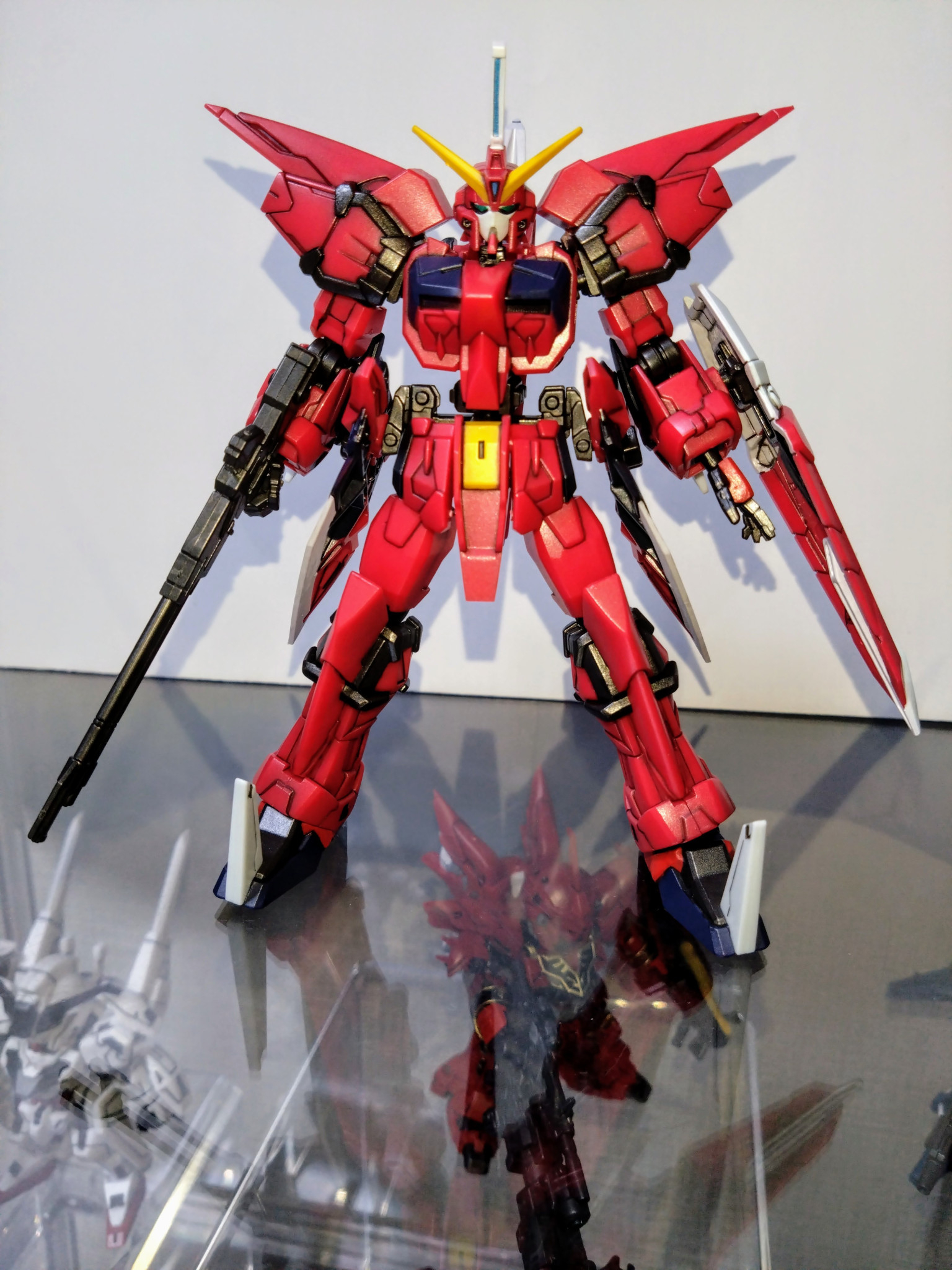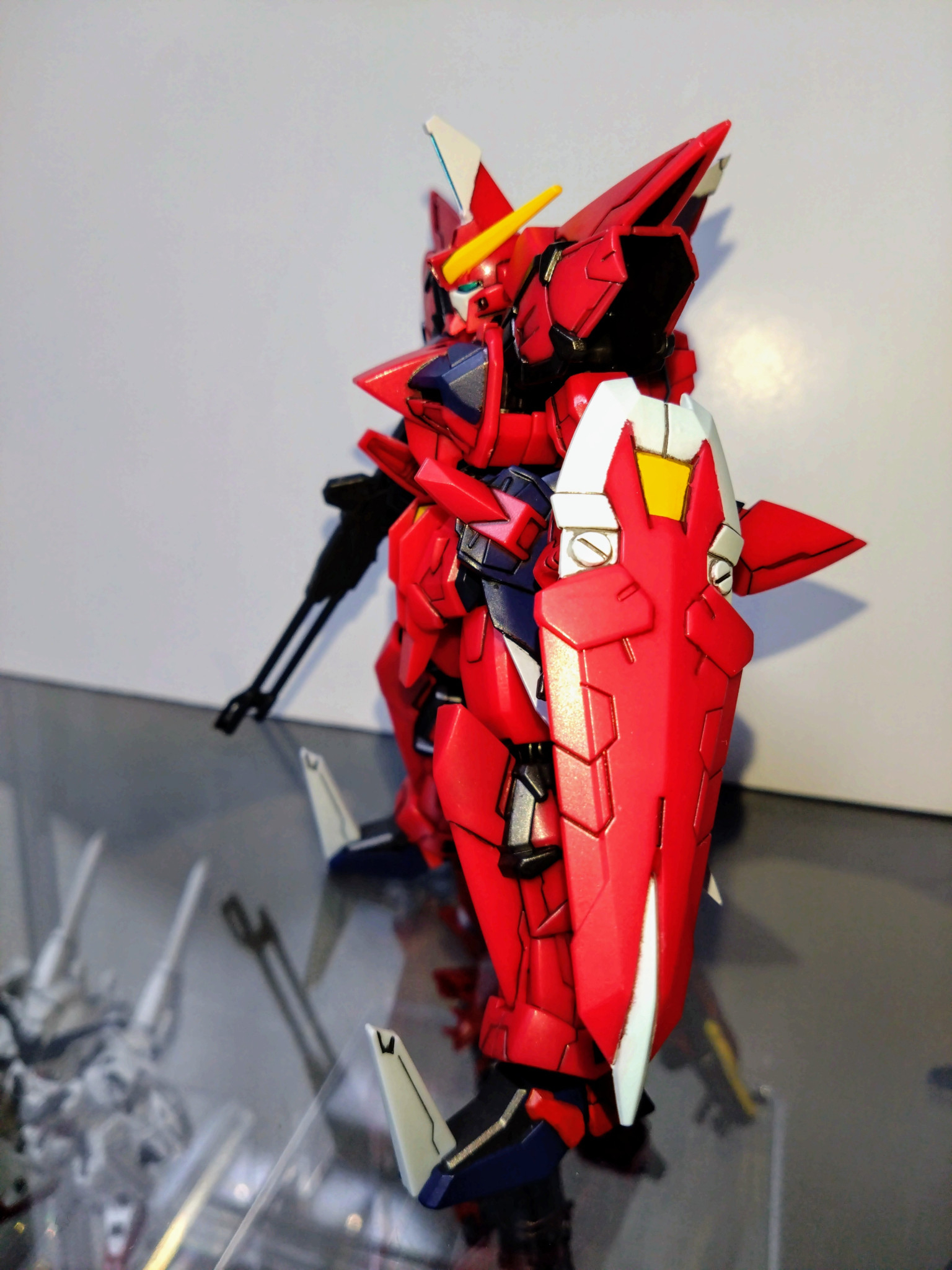 水性ホビーカラーはガンダムホワイト、ガンダムレッド、ガンダムイエロー、マイティーストライクフリーダムダークブルー、メタリックブラック、青竹色、黒鉄色、焼鉄色等を使用しました。