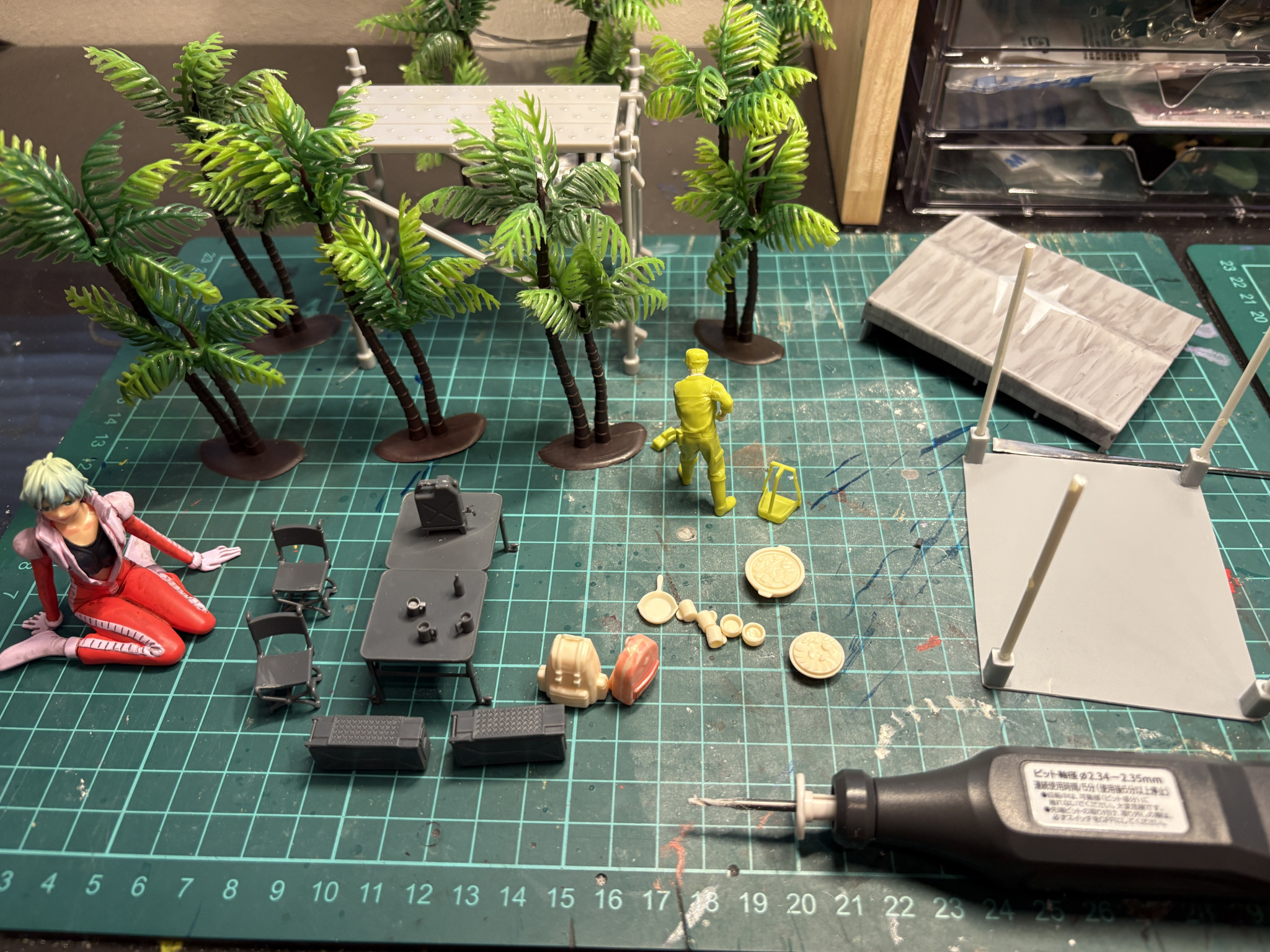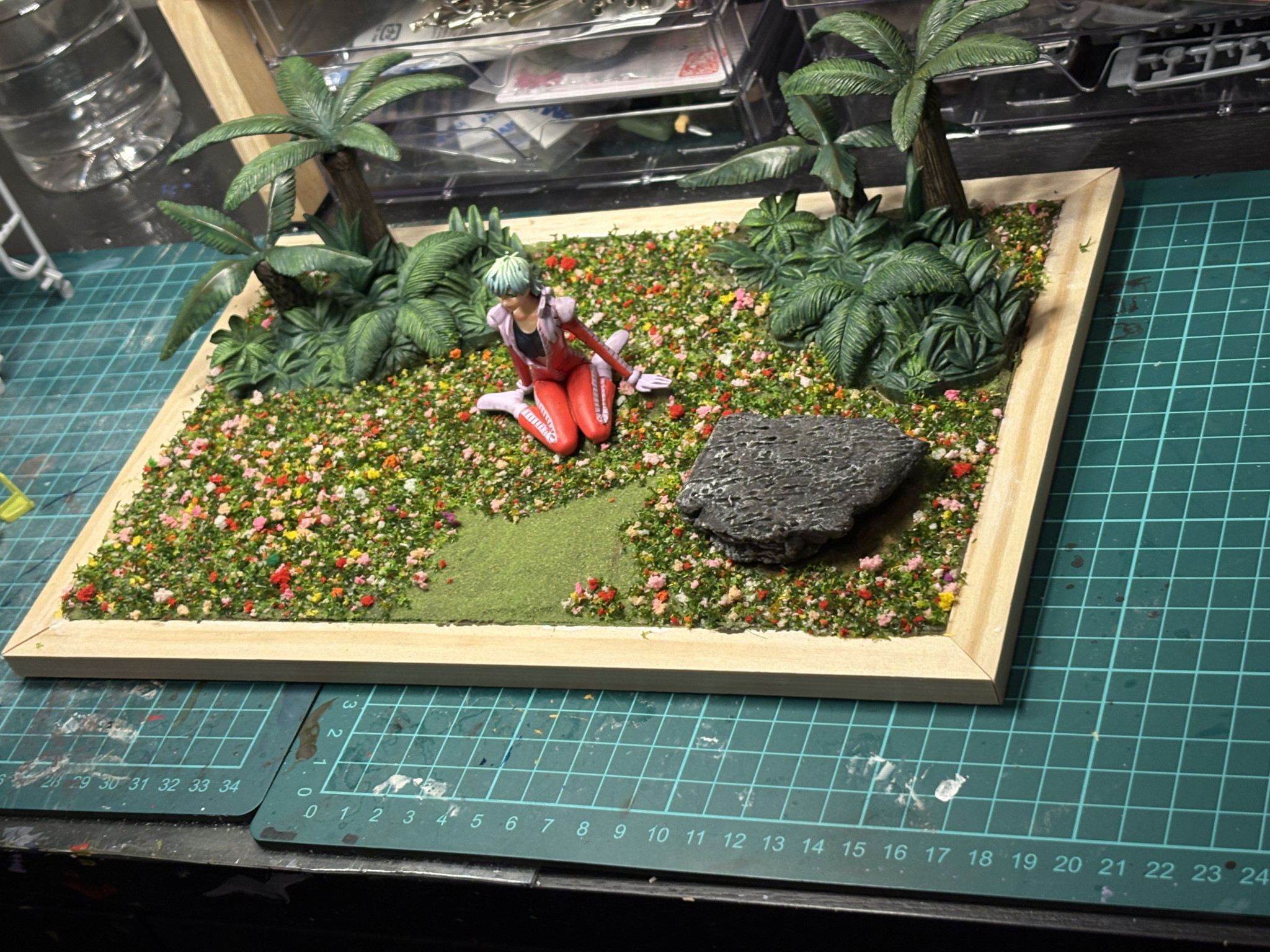 中古ショップで見つけたジャングルの植物、模型素材をポンドで100均のボードにくつけました。地面は石粉粘土です。石粉粘土は縮んだので2回に分けてボードを埋めてます。地面塗装は石粉粘土にトップコートしてからオリーブドラブしていますが、画像からはほぼ見えないですね。